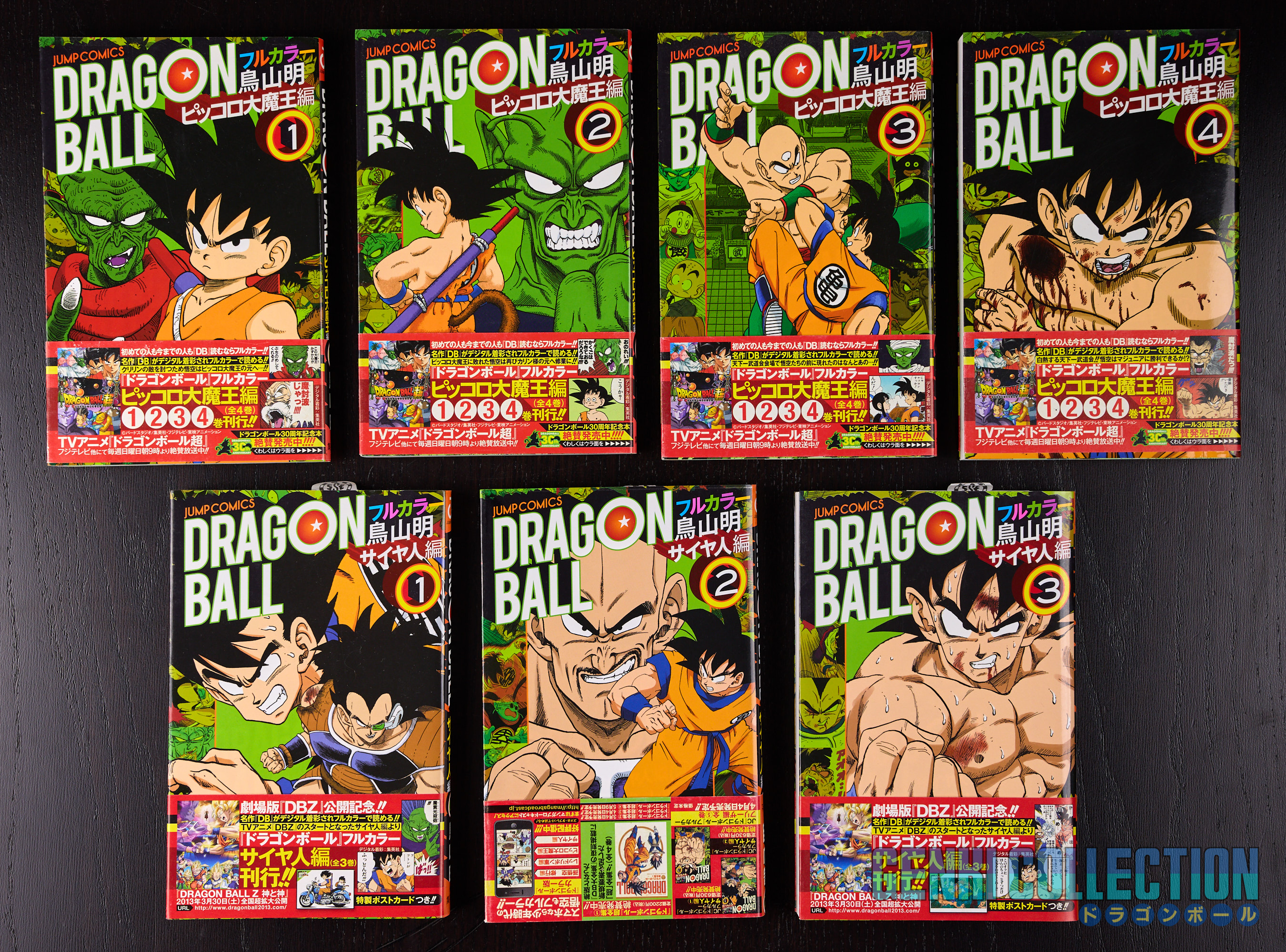 Intégrale des 32 tomes japonais DRAGON BALL édition FULL COLOR en 1ère édition (exceptés les volumes 4 et 5 de la saga Freeza en seconde édition). Tous les tomes possèdent leur OBI et pour certains un flyer publicitaire est également présent. Série en très bon état général. L'édition FULL COLOR reprend l'édition originale, mais entièrement colorisée ! Une belle manière de redécouvrir la série. La numérotation n'est pas globale mais se fait par Arc (Enfance de Gokû 8 tomes, Piccolo Daimaô 4 tomes, Saiyans 3 tomes, Freeza 5 tomes, Cyborgs 6 tomes, Majin Boo 6 tomes.)