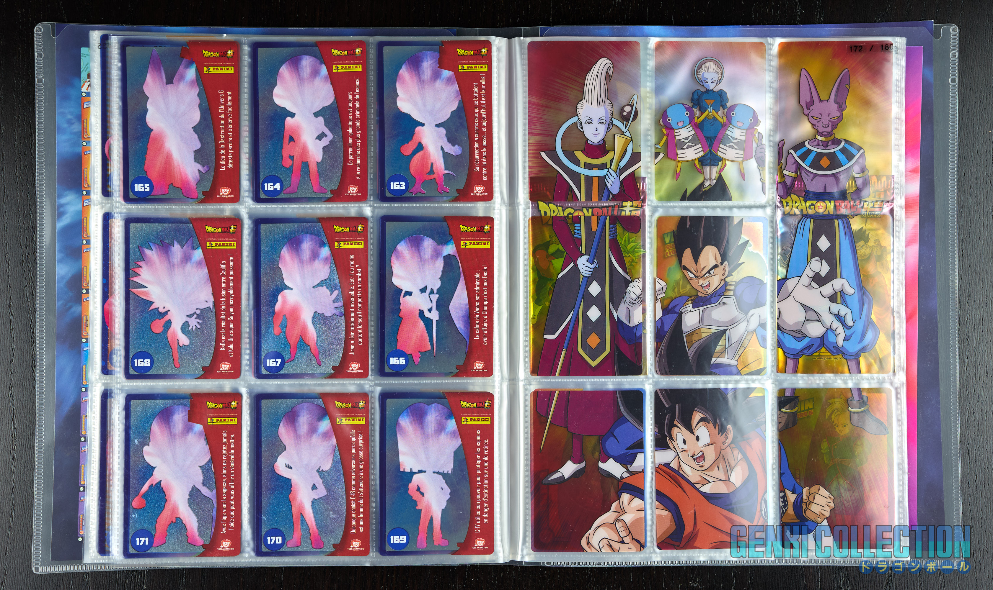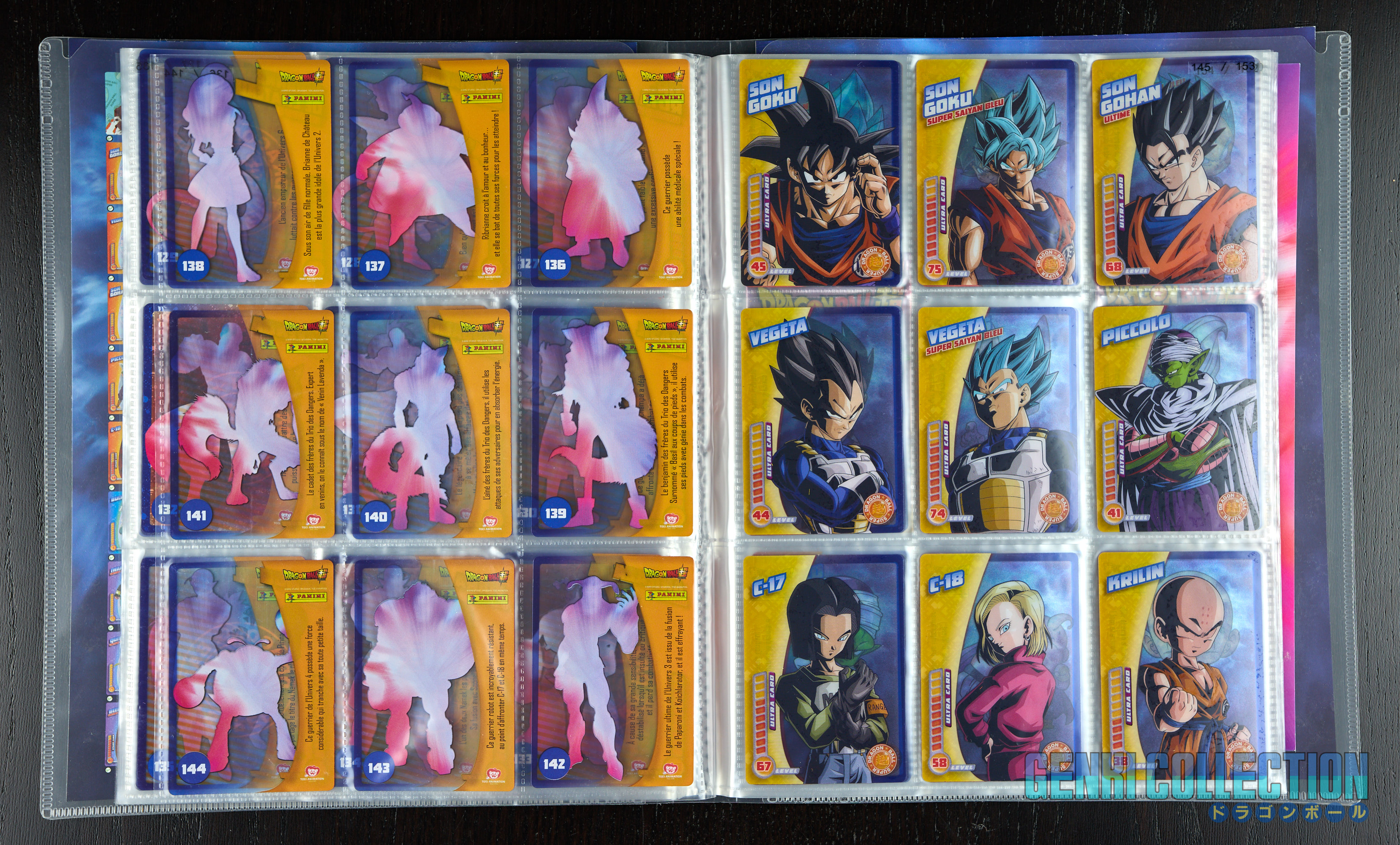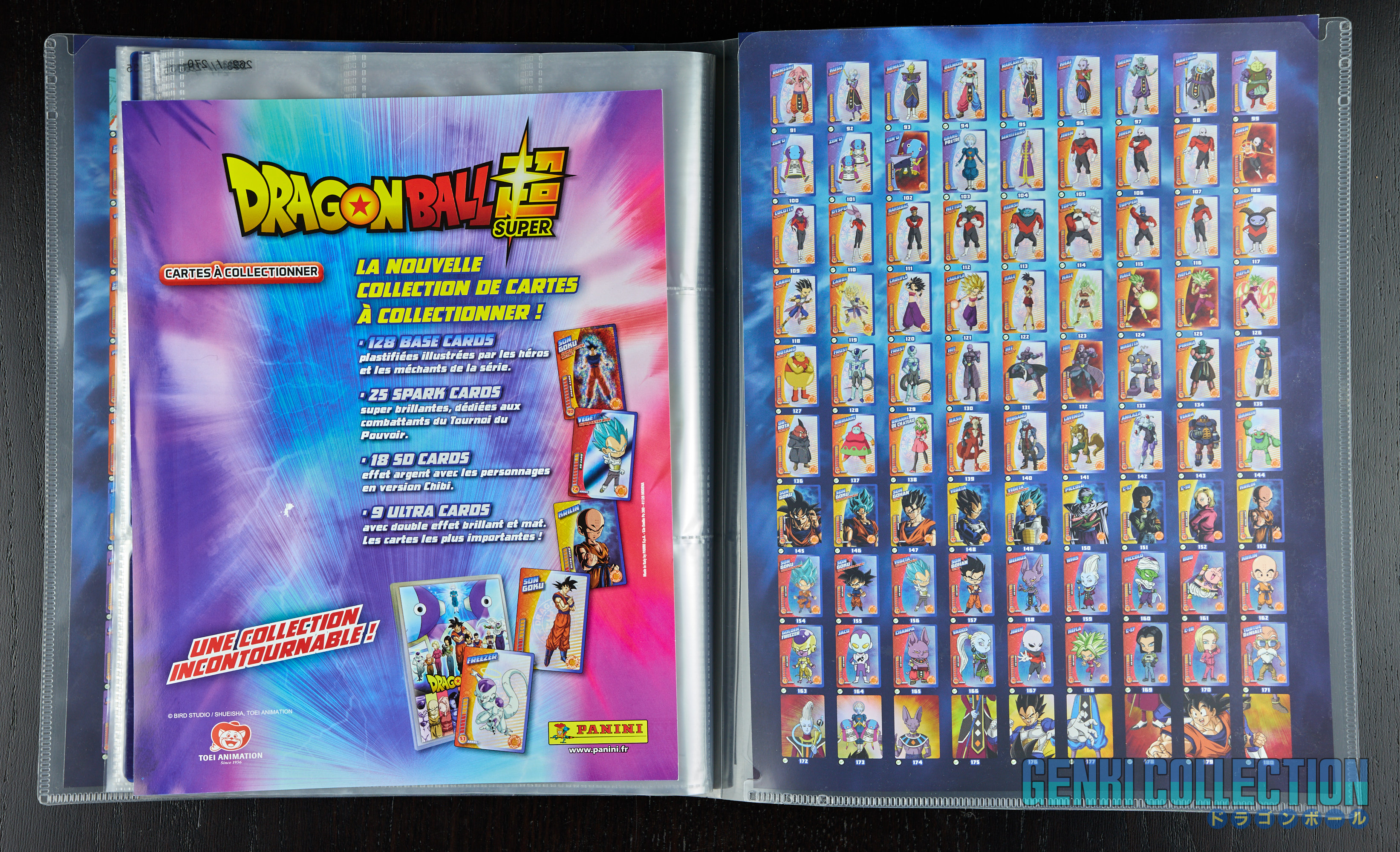 Full set de 180 cartes "Trading Cards" PANINI DRAGON BALL SUPER en très bon état et rangées dans leur classeur officiel. Le lot comprend également un display comprenant les boosters (ouverts) de la série, ainsi qu'un kit de démarrage scellé comprenant des cartes et le classeur.