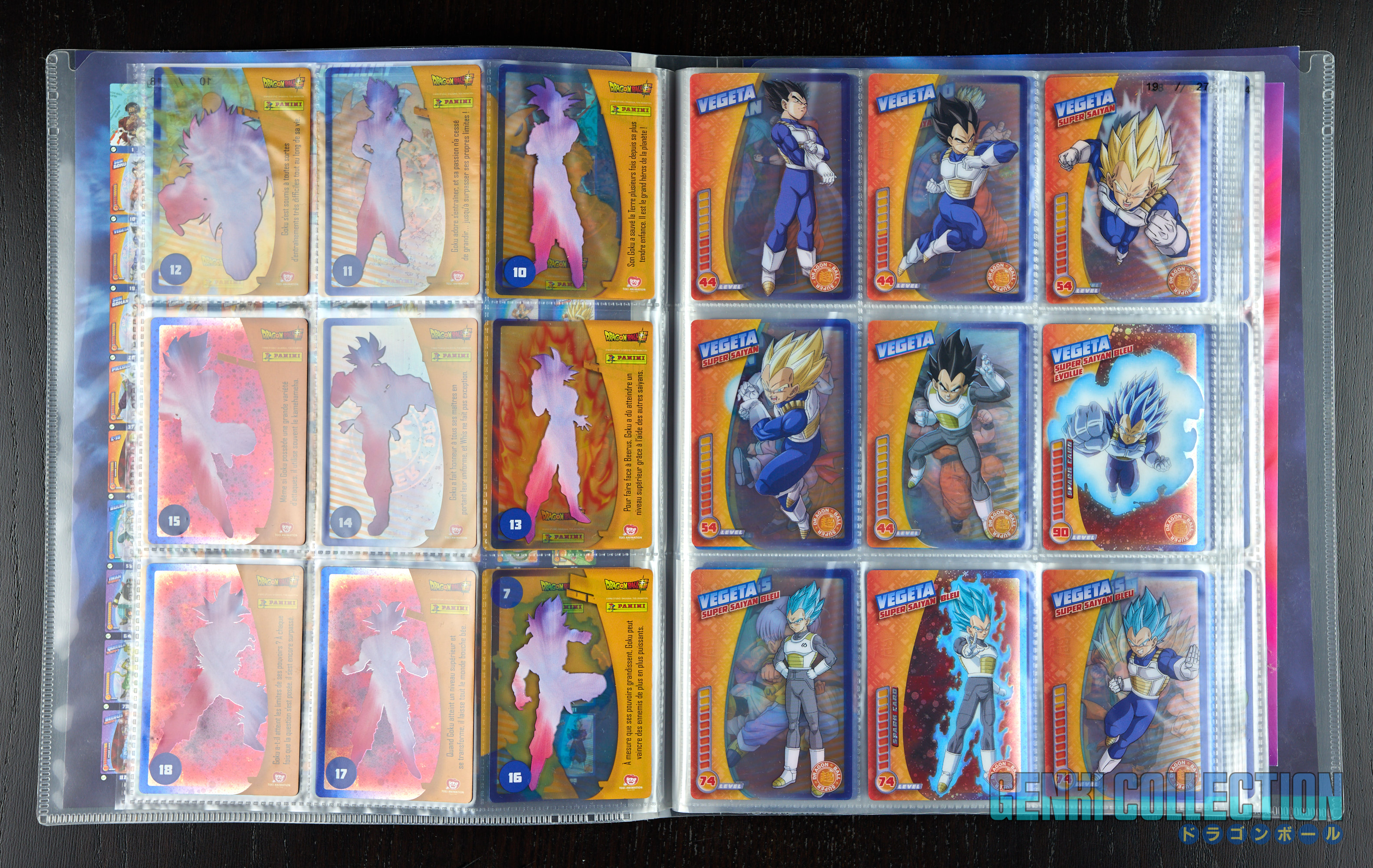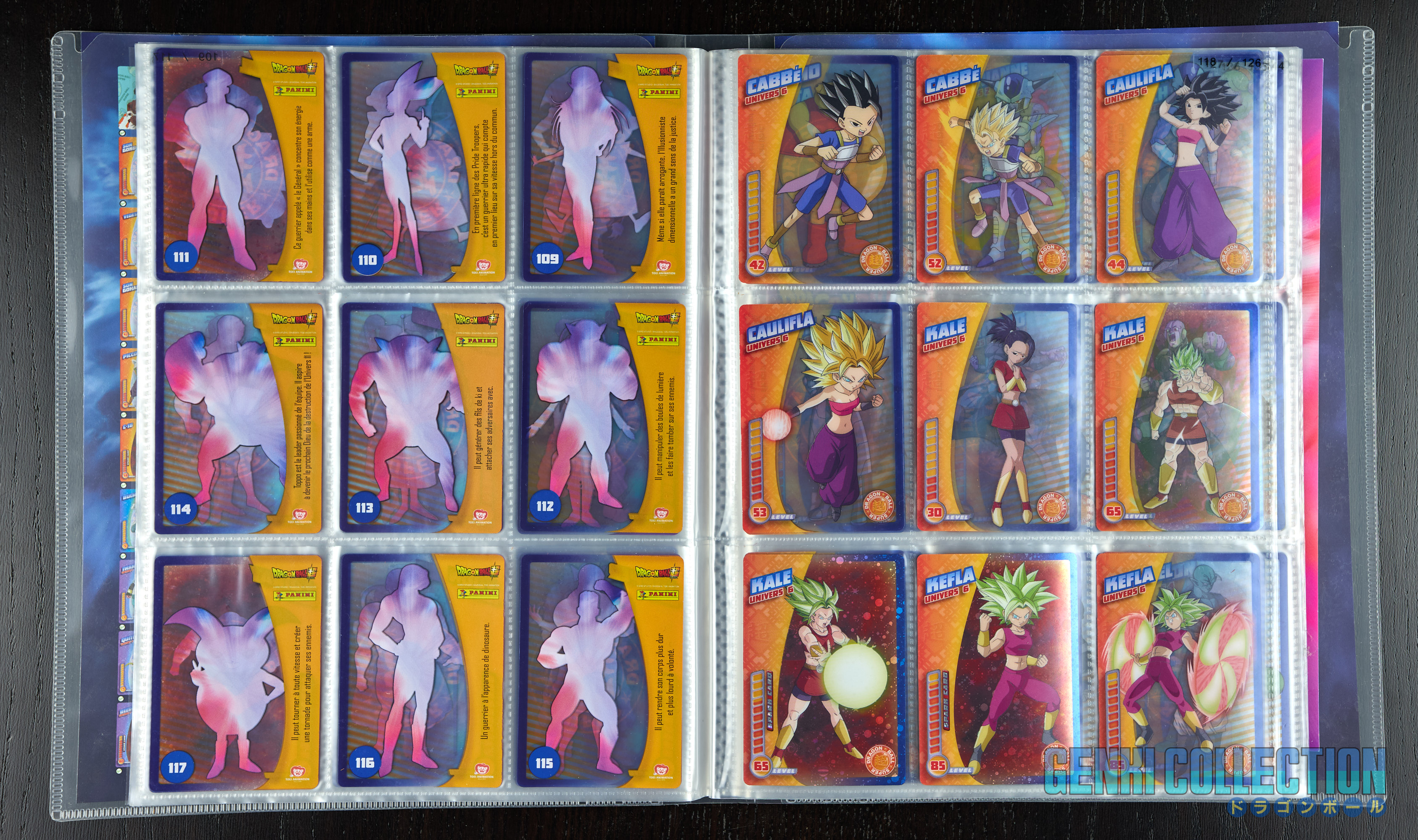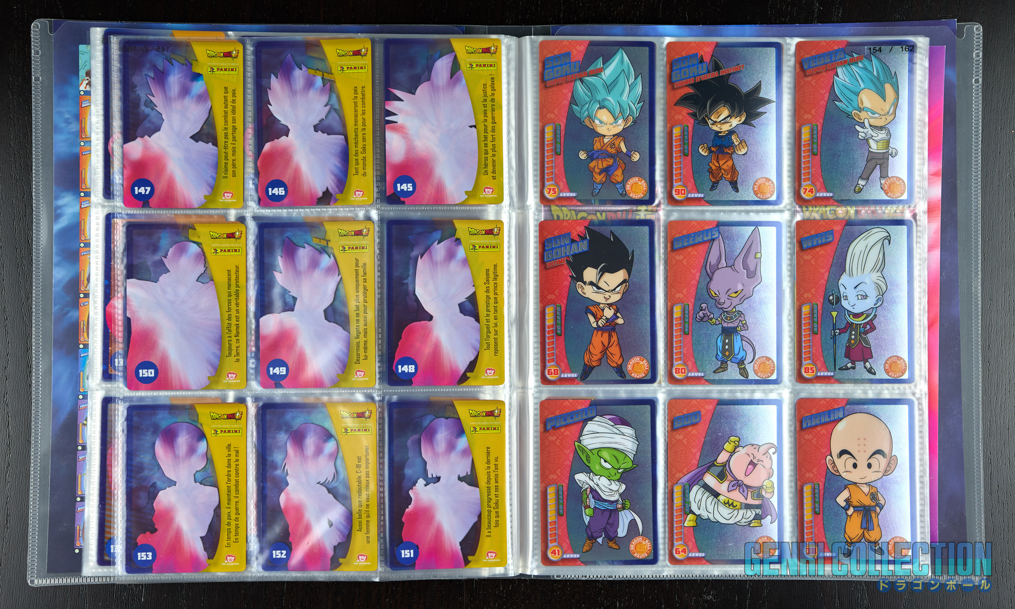Full set de 180 cartes "Trading Cards" PANINI DRAGON BALL SUPER en très bon état et rangées dans leur classeur officiel. Le lot comprend également un display comprenant les boosters (ouverts) de la série, ainsi qu'un kit de démarrage scellé comprenant des cartes et le classeur.
