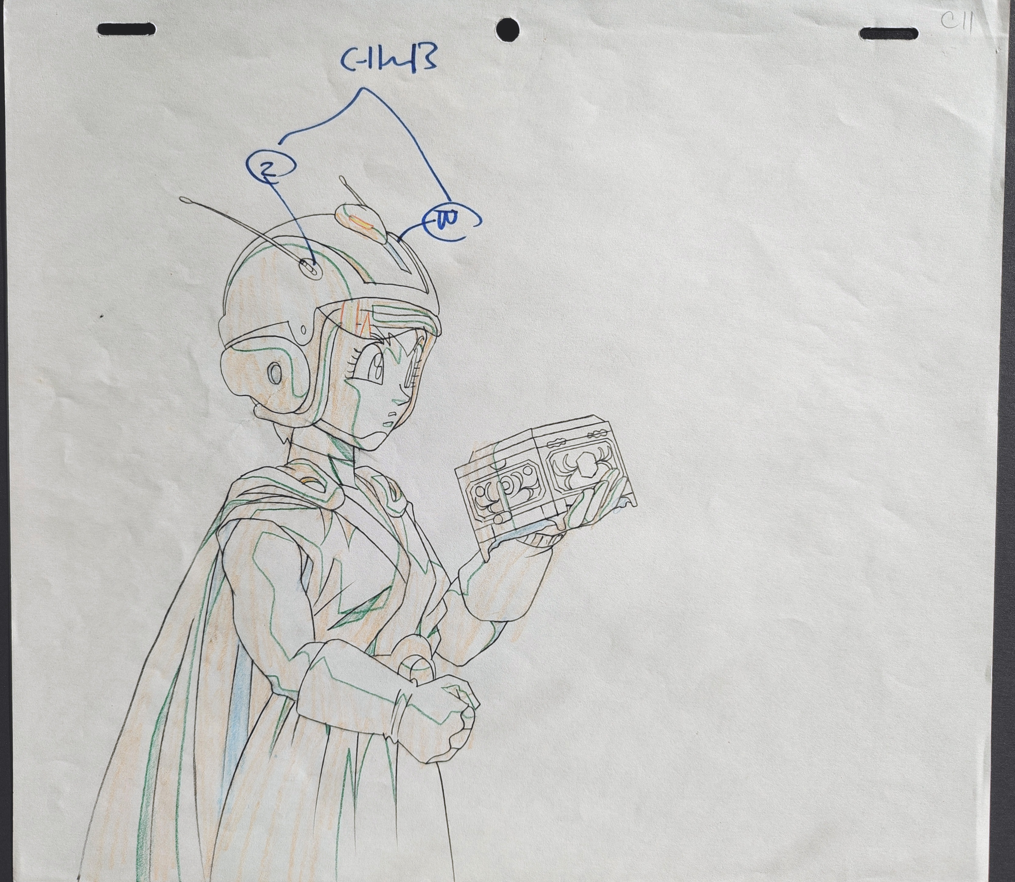 DOUGA original DRAGON BALL Z à la mine de plomb et au crayon de couleur représentant Videl en tenue de Great Saiyaman 2 tenant la boîte à musique renfermant Tapion tiré du film 13 "L'attaque du Dragon", "L’Explosion du poing du dragon !! Si Goku n’y arrive pas, qui le pourra ?", "ドラゴンボールZ 龍拳爆発!!悟空がやらねば誰がやる" sortie en 1995 par la Toei animation.