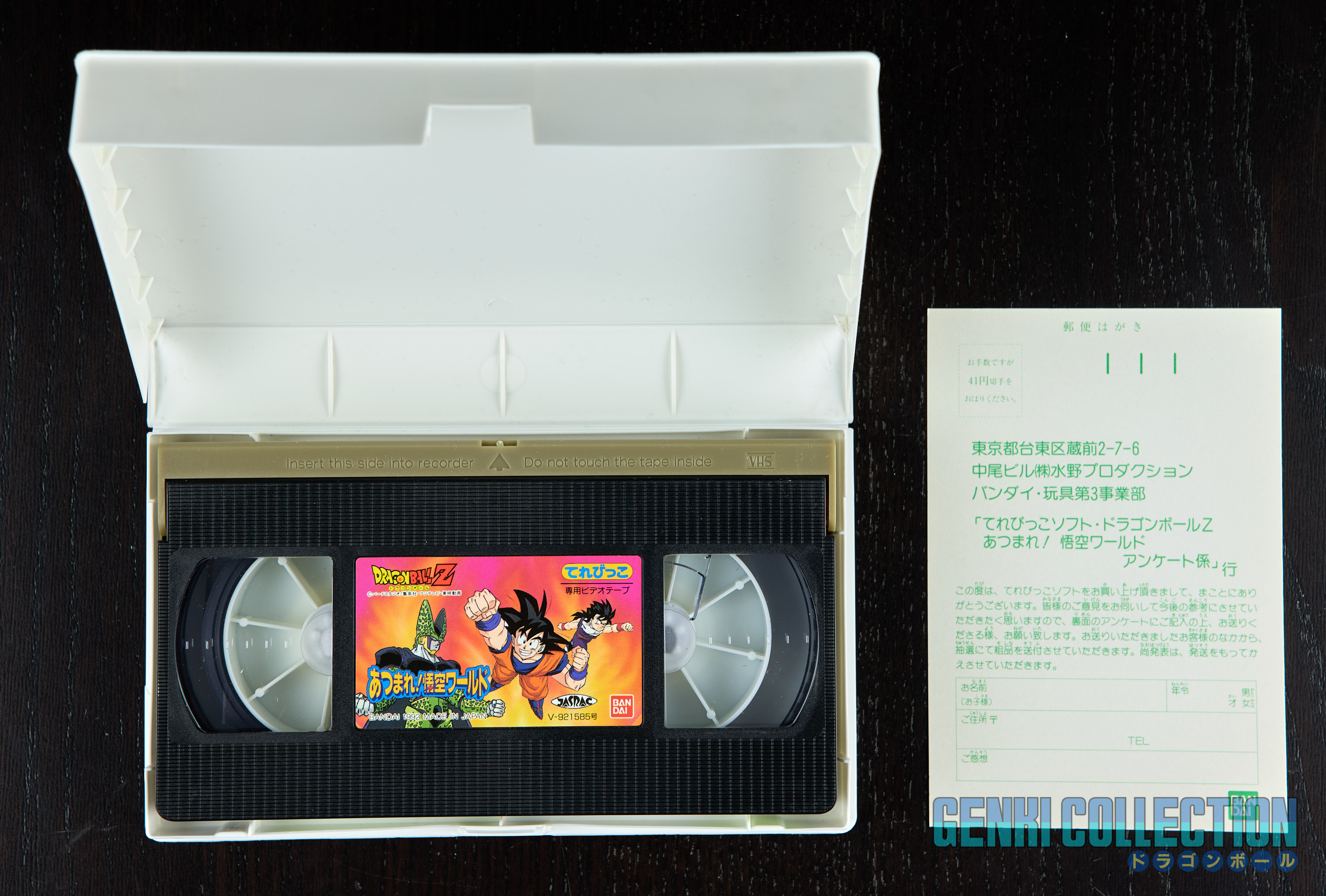 VHS très rare de l'OAV DRAGON BALL Z "Atsumare ! Gokû World", sortie en 1992 et destinée à accompagner un "téléphone interactif" nommé "Terebikko" qui sonne afin de permettre d'entendre le protagoniste de la VHS poser une question sur la série DRAGON BALL, pour laquelle il est possible de choisir une réponse parmi les 4 choix proposés à l'écran. Il est tout à fait possible de visionner la VHS sans téléphone. Excellent état avec Registered Card.