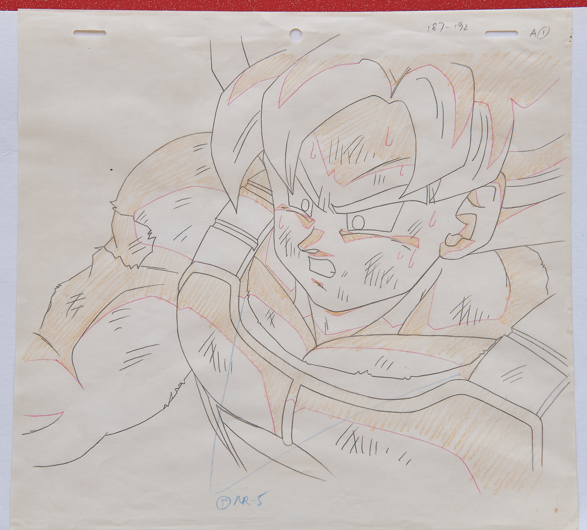 CELLULO A1 Gokû Super Saiyan en armure Saiyan + Décor original DRAGON BALL Z EP 187.Cellulo peinture acrylique de DRAGON BALL Z au format standard (26,5x22,8cm) de Gokû Super Saiyan en armure Saiyan et son décor peint à la main (probablement le bon utlisé dans la séquence, mais celui-ci est collé au cellulo). Le douga (crayonné préparatoire) est également présent. Cette séquence a été supposément réalisée pour l'épisode 187 de DRAGON BALL Z, séquence clé A1 mais à priori non utilisé dans l'anime, la séquence commence à A2.