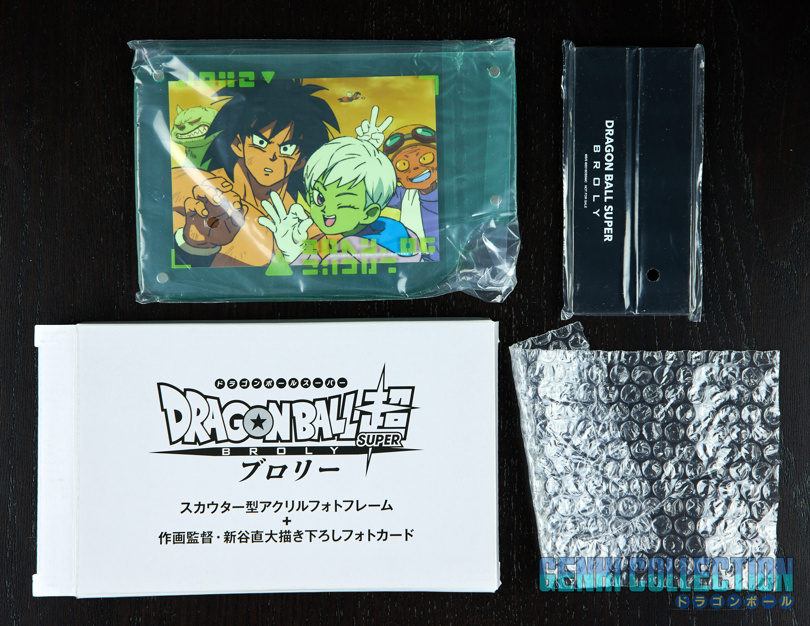 Coffret collector japonais DRAGON BALL SUPER BROLY incluant le film en Blu-ray et DVD, ainsi que tous ses objets bonus : un lot de 9 badges, 32 cartes postales du film avec un classeur de rangement, de nombreux flyers publicitaires, un livret sur le film et un support photo en forme de Scouter exclusif limité aux précommande sur Amazon Japan, ainsi qu'un chiffon exclusif. Tout est en excellent état.