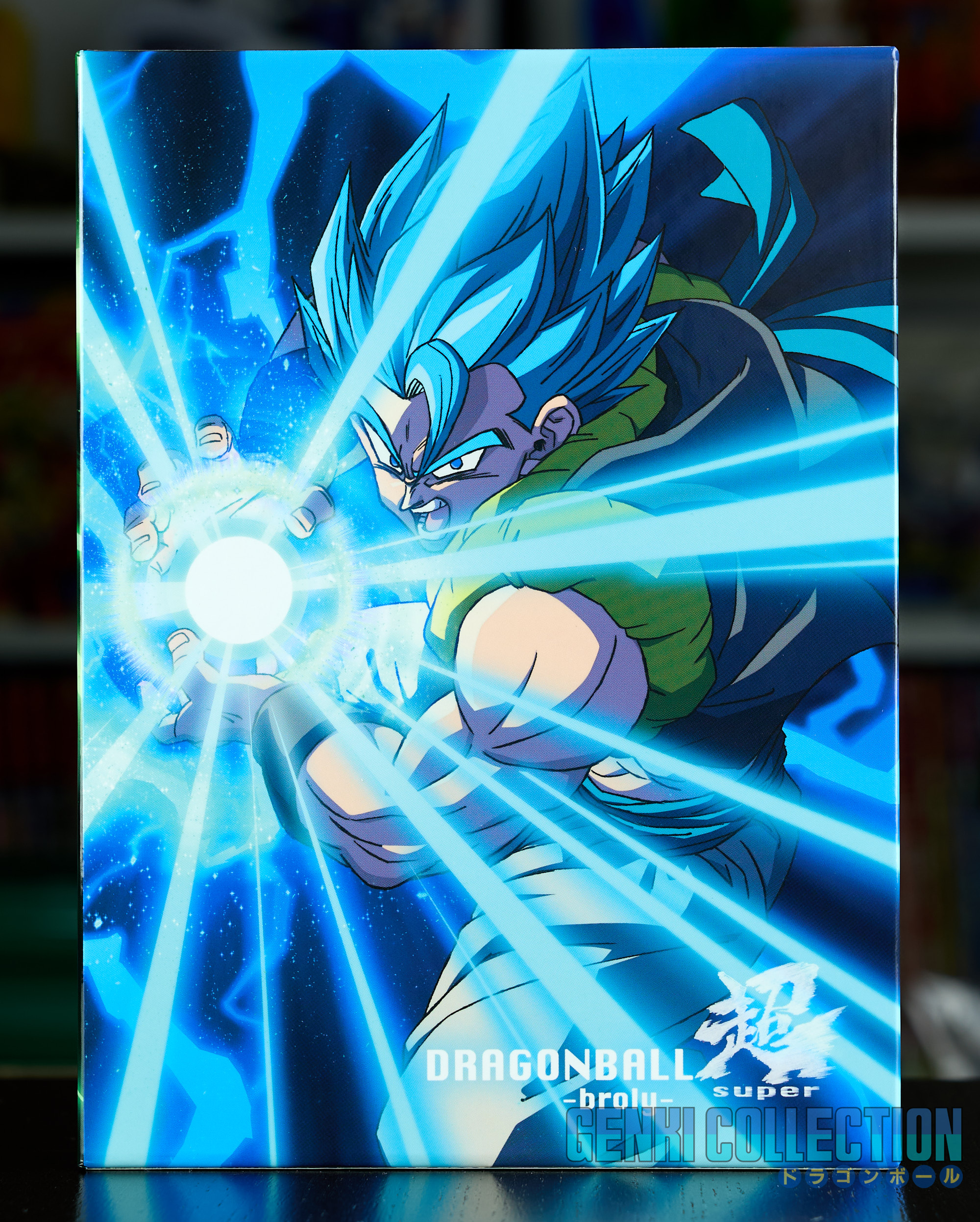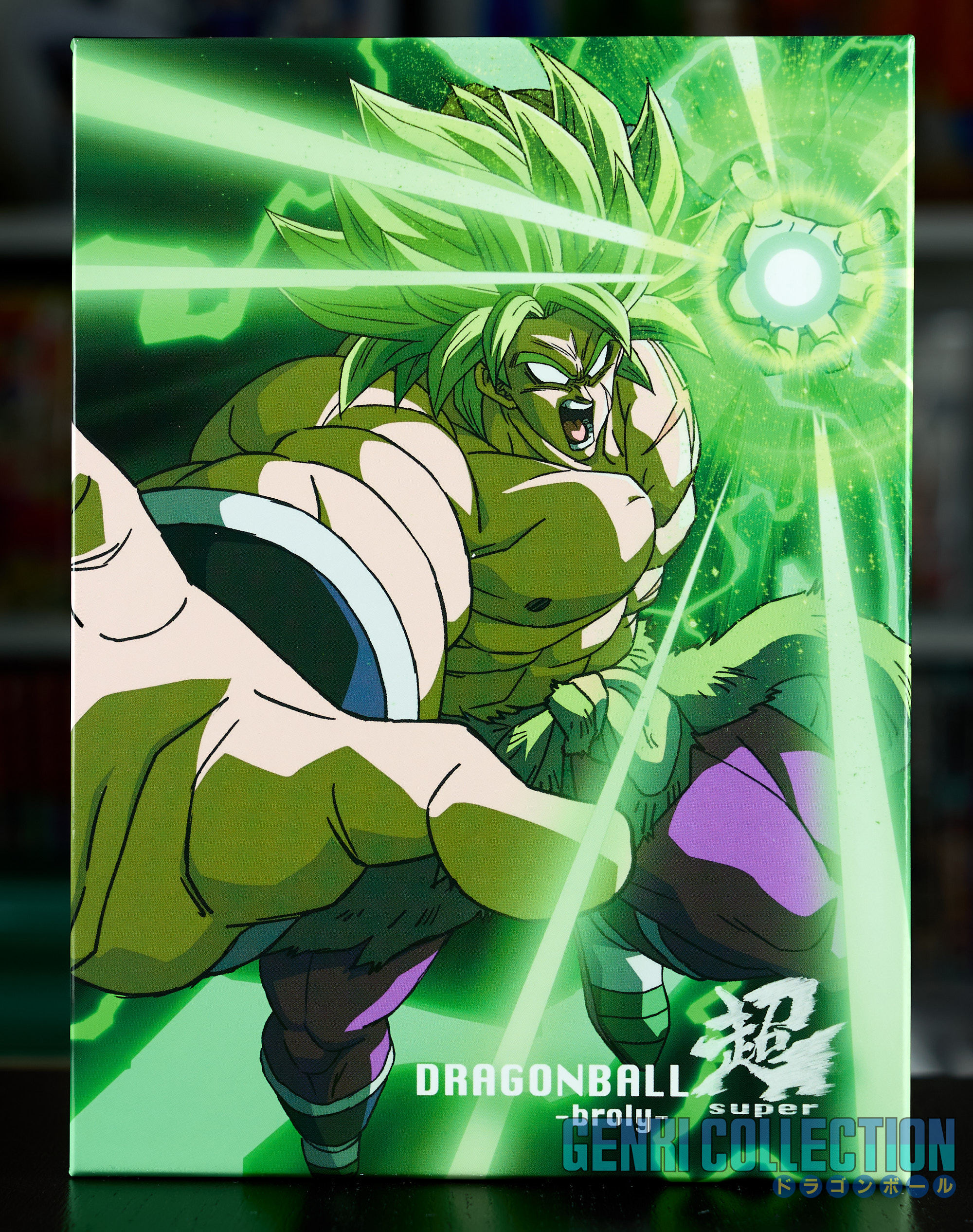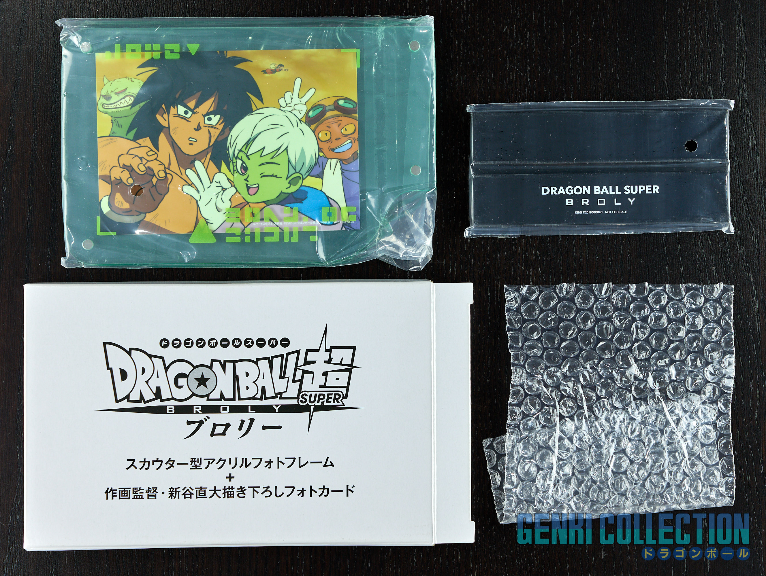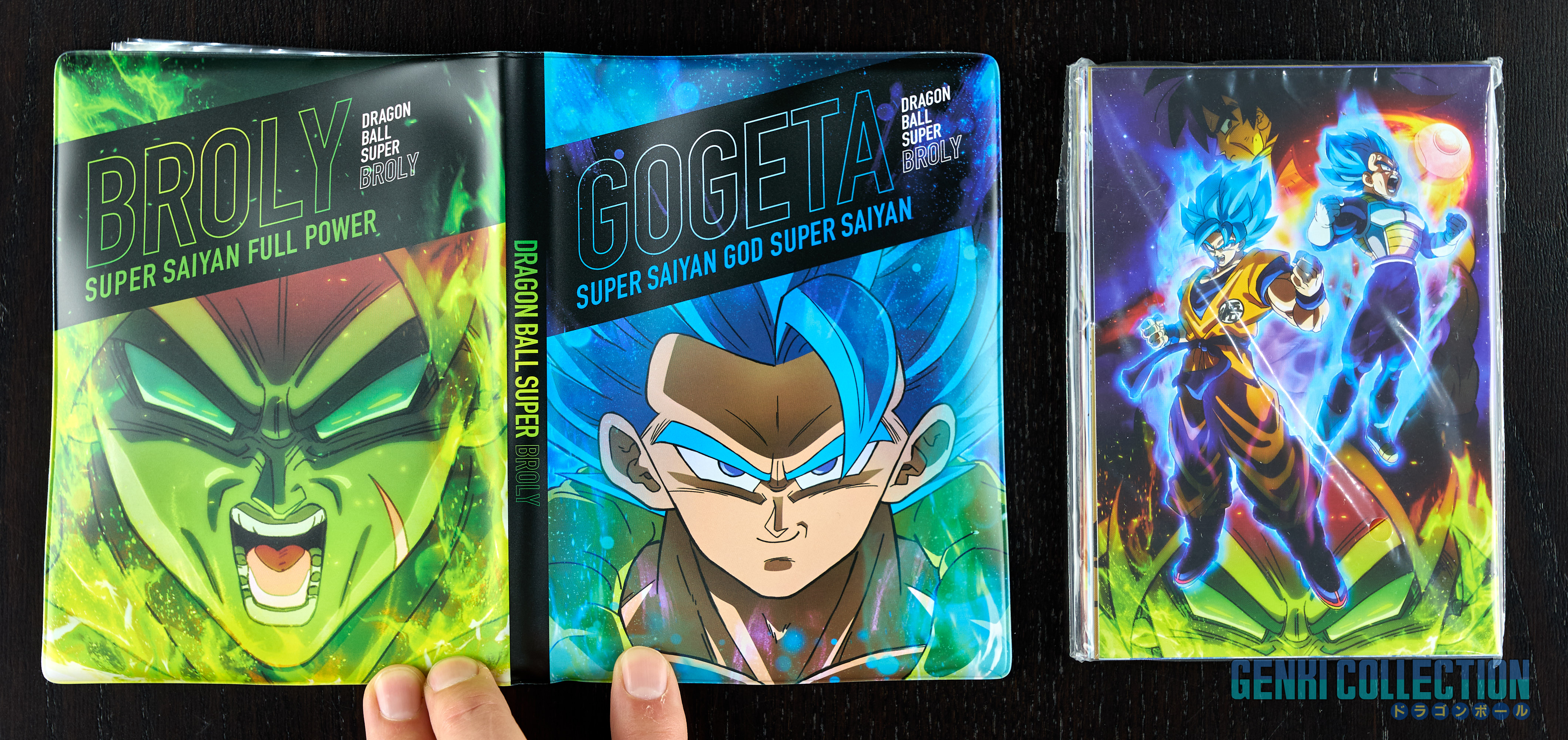Japanese collector's box set of Dragon Ball Super Broly including the movie on Blu-ray and DVD, along with all its bonus items: a set of 9 badges, 32 movie postcards with a storage binder, numerous advertising flyers, a booklet about the film, an exclusive Scouter-shaped photo stand limited to Amazon Japan pre-orders, and an exclusive cleaning cloth.