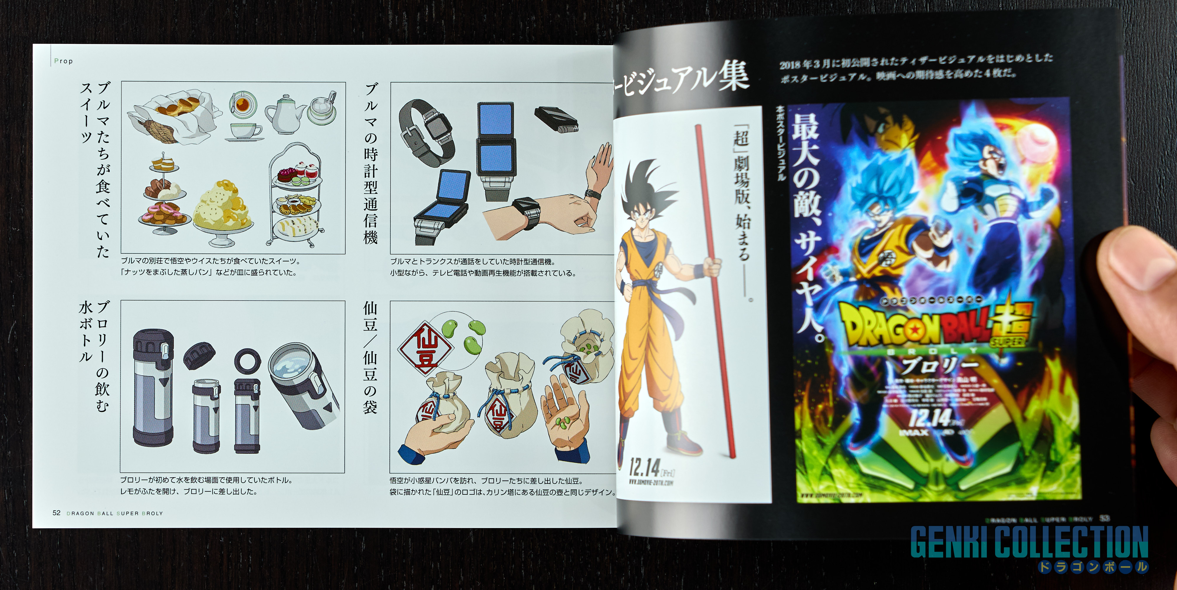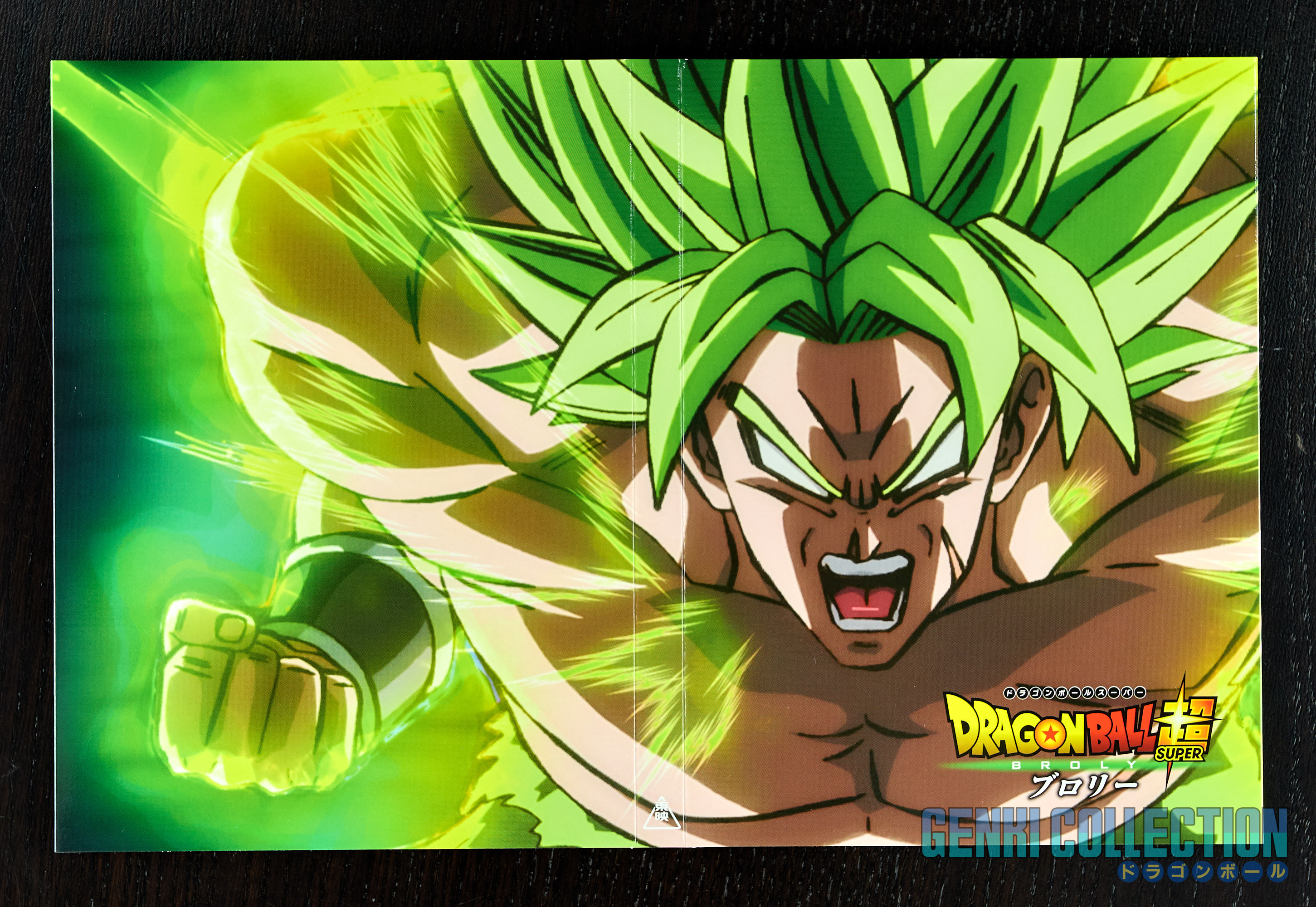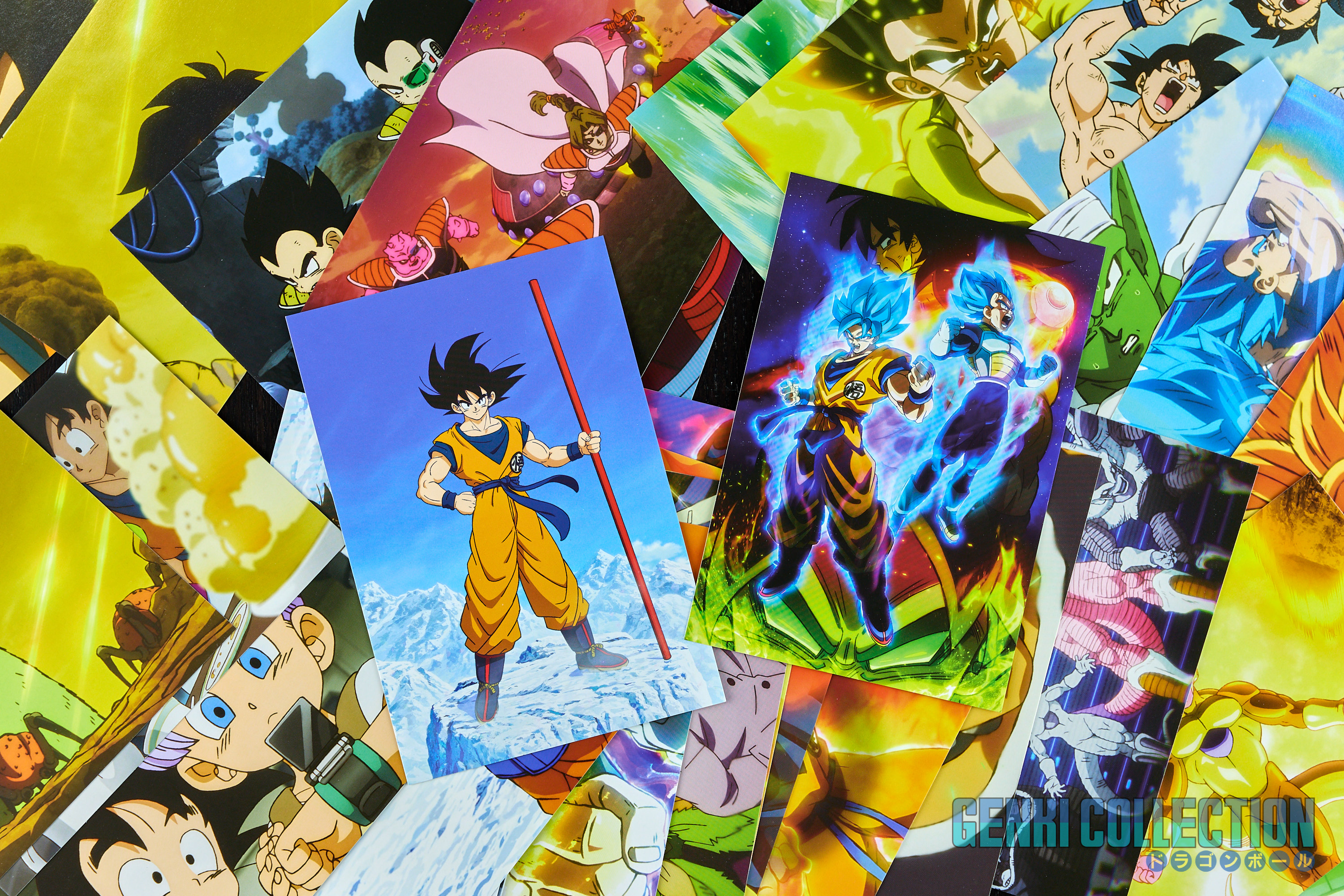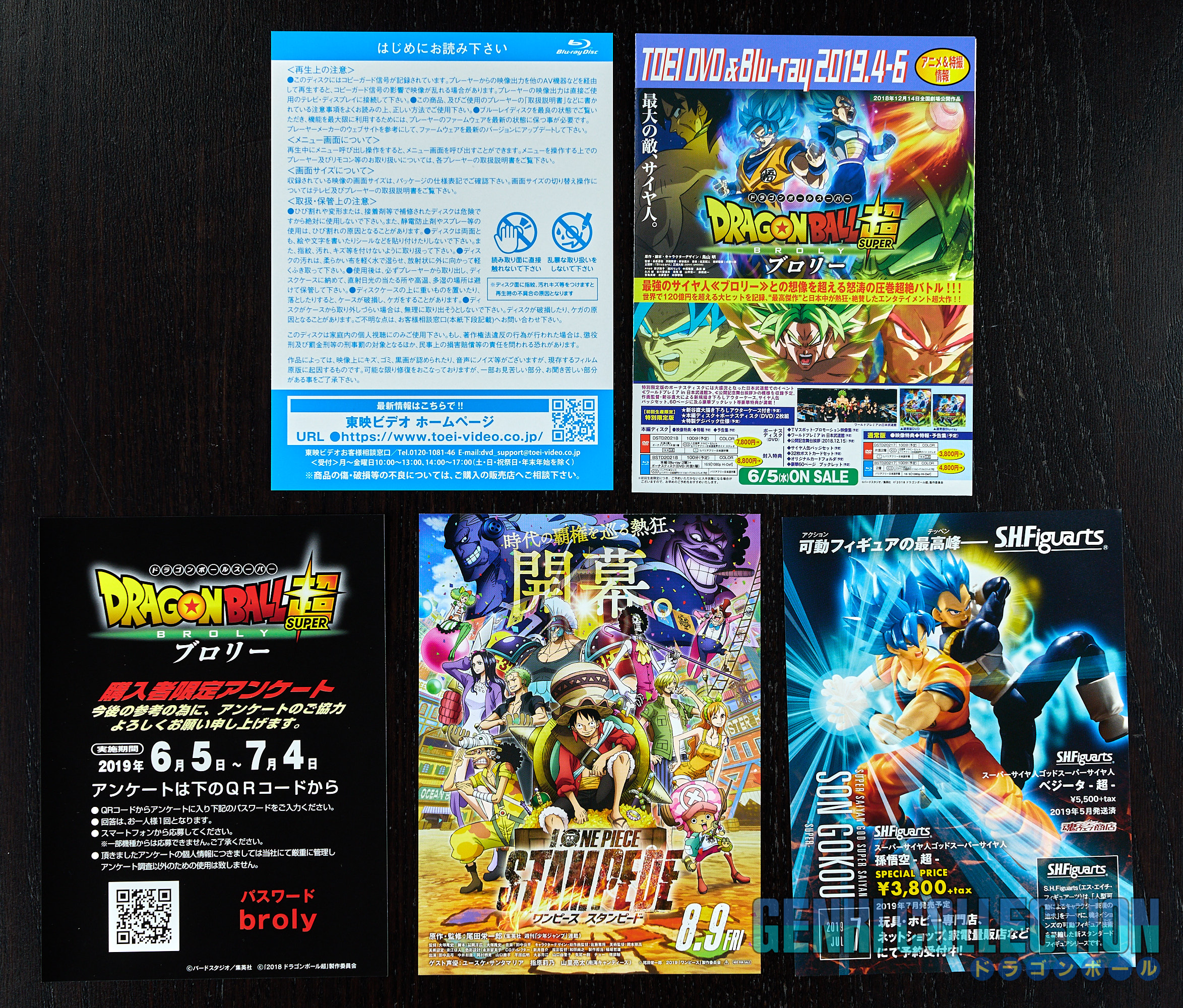 Japanese collector's box set of Dragon Ball Super Broly including the movie on Blu-ray and DVD, along with all its bonus items: a set of 9 badges, 32 movie postcards with a storage binder, numerous advertising flyers, a booklet about the film, an exclusive Scouter-shaped photo stand limited to Amazon Japan pre-orders, and an exclusive cleaning cloth.