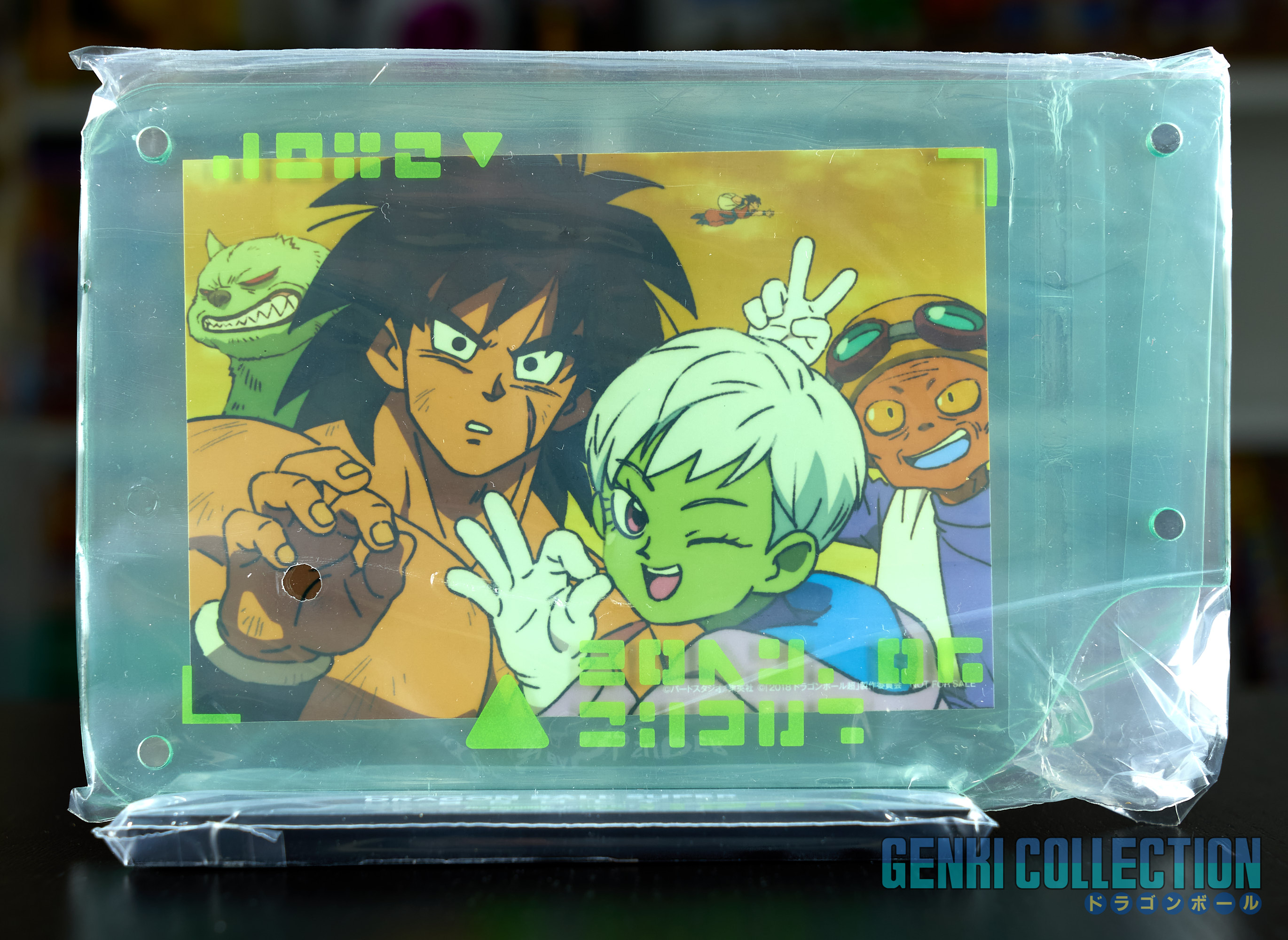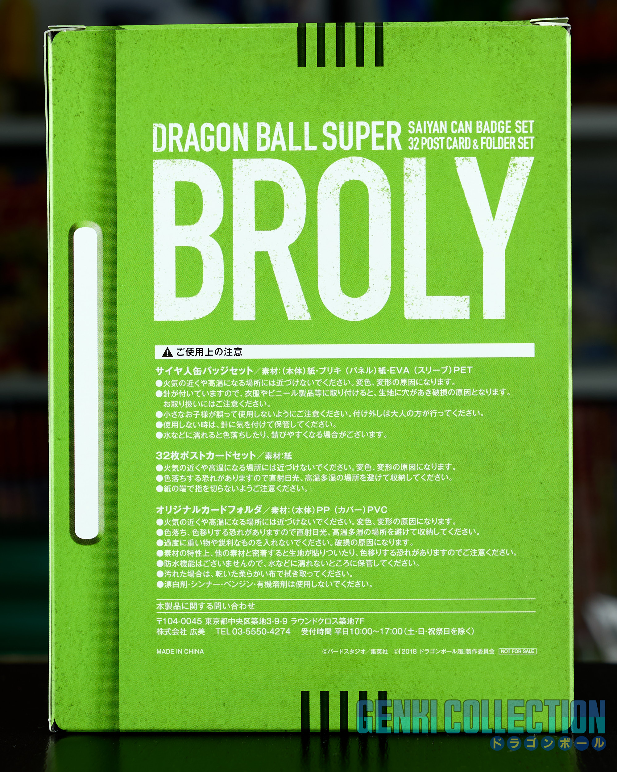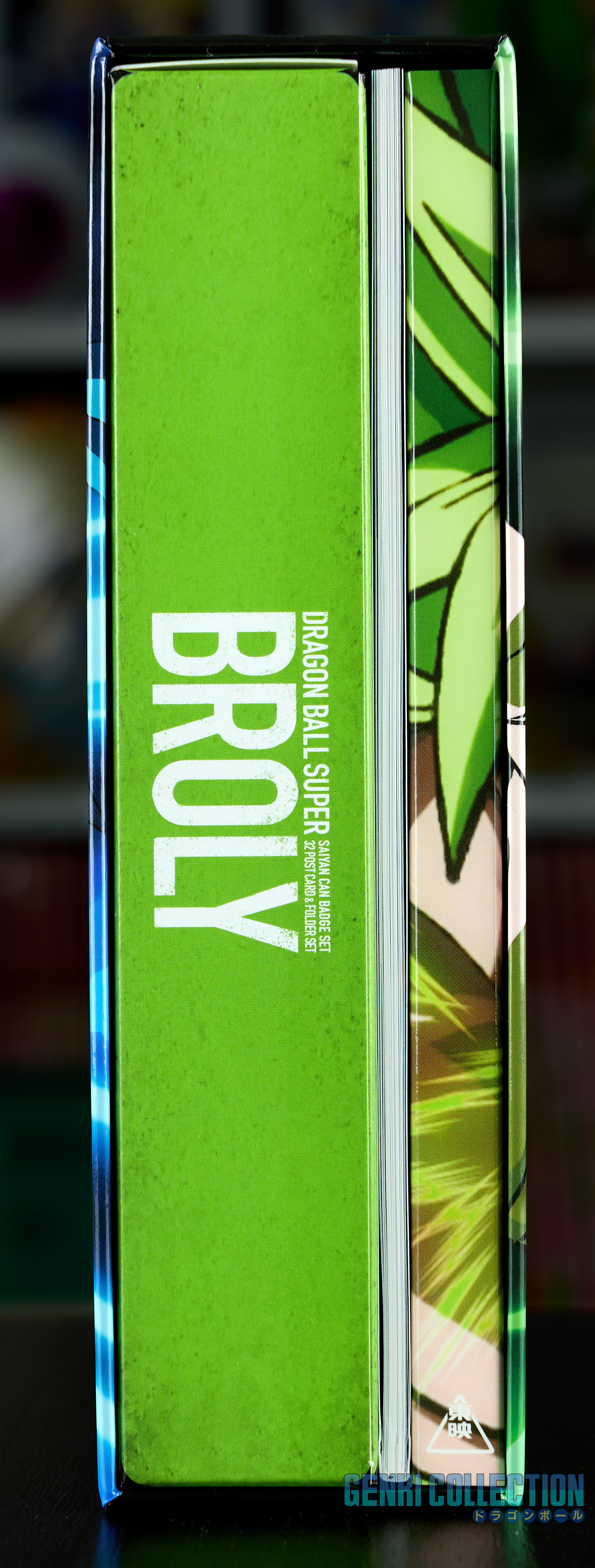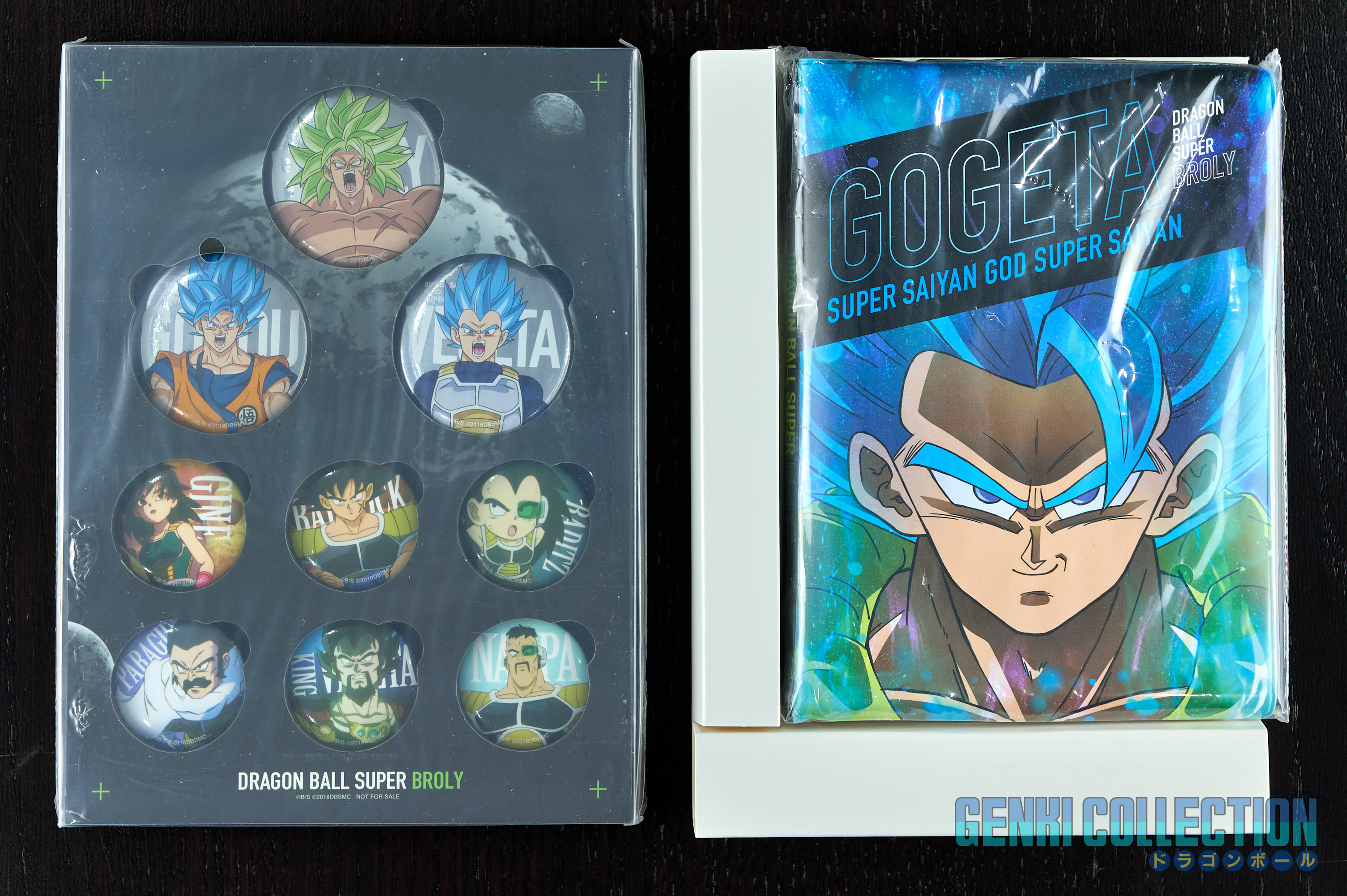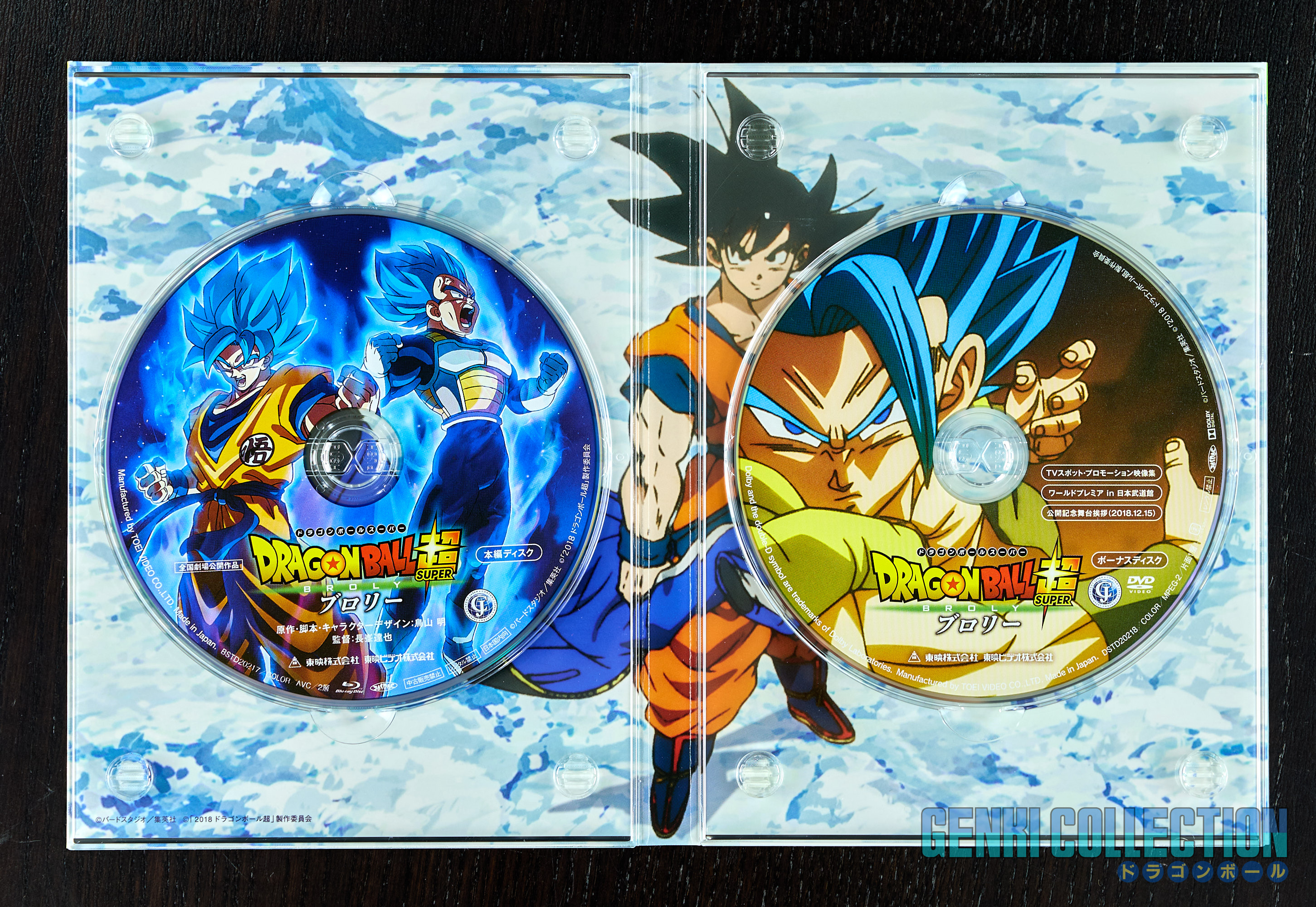 Coffret collector japonais Dragon Ball Super Broly incluant le film en Blu-ray et DVD, ainsi que tous ses objets bonus : un lot de 9 badges, 32 cartes postales du film avec un classeur de rangement, de nombreux flyers publicitaires, un livret sur le film et un support photo en forme de Scouter exclusif limité aux précommandes sur Amazon Japan, ainsi qu'un chiffon exclusif.