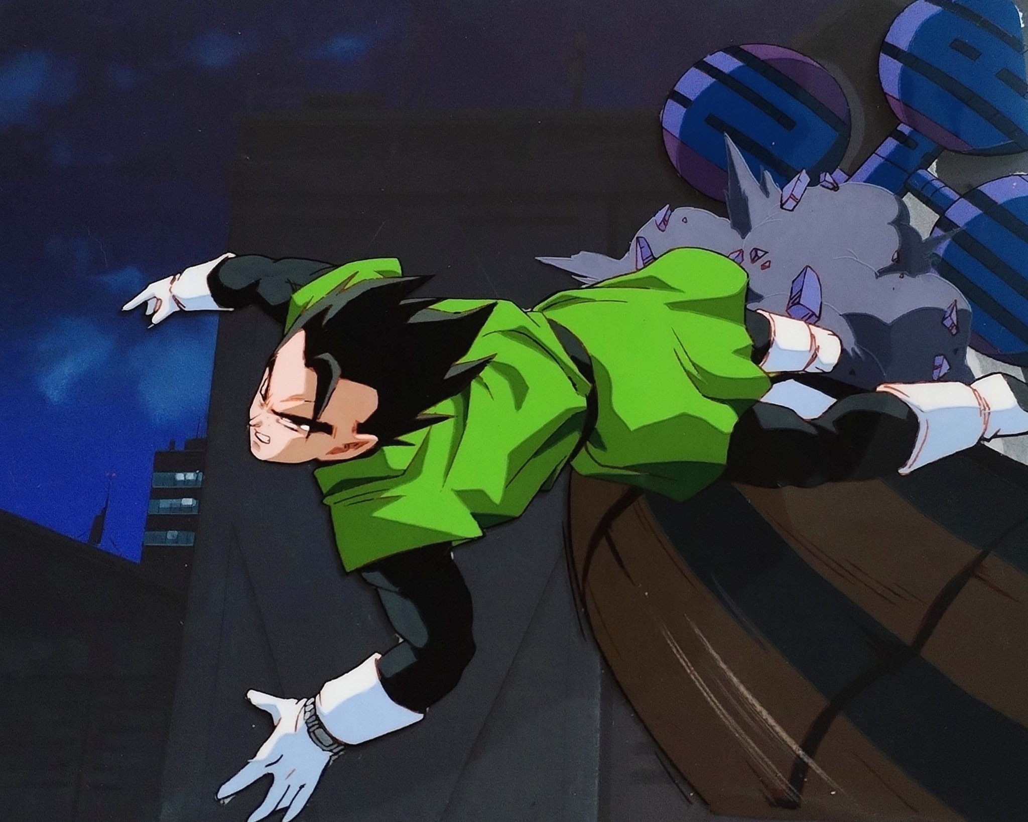Cellulo original DRAGON BALL Z à l’encre et à la gouache représentant Gohan Ultime avec un décor gouaché "non matching" et non collé. Scène tirée du film 13 "L'attaque du Dragon", "L’Explosion du poing du dragon !! Si Goku n’y arrive pas, qui le pourra ?", "ラゴンボールZ 龍拳爆発!!悟空がやらねば誰がやる", produit en 1995 par Toei Animation. Le décor provient de la serie 801 T.T.S. Airbats.