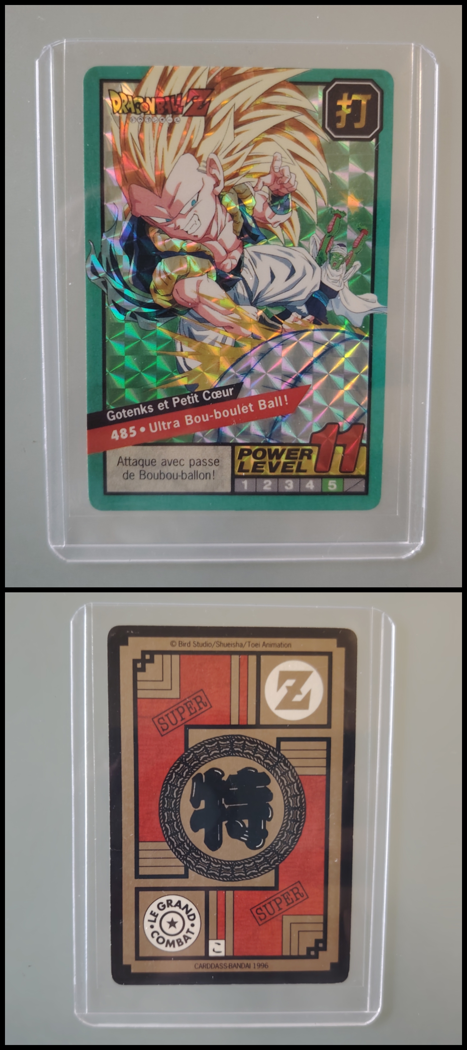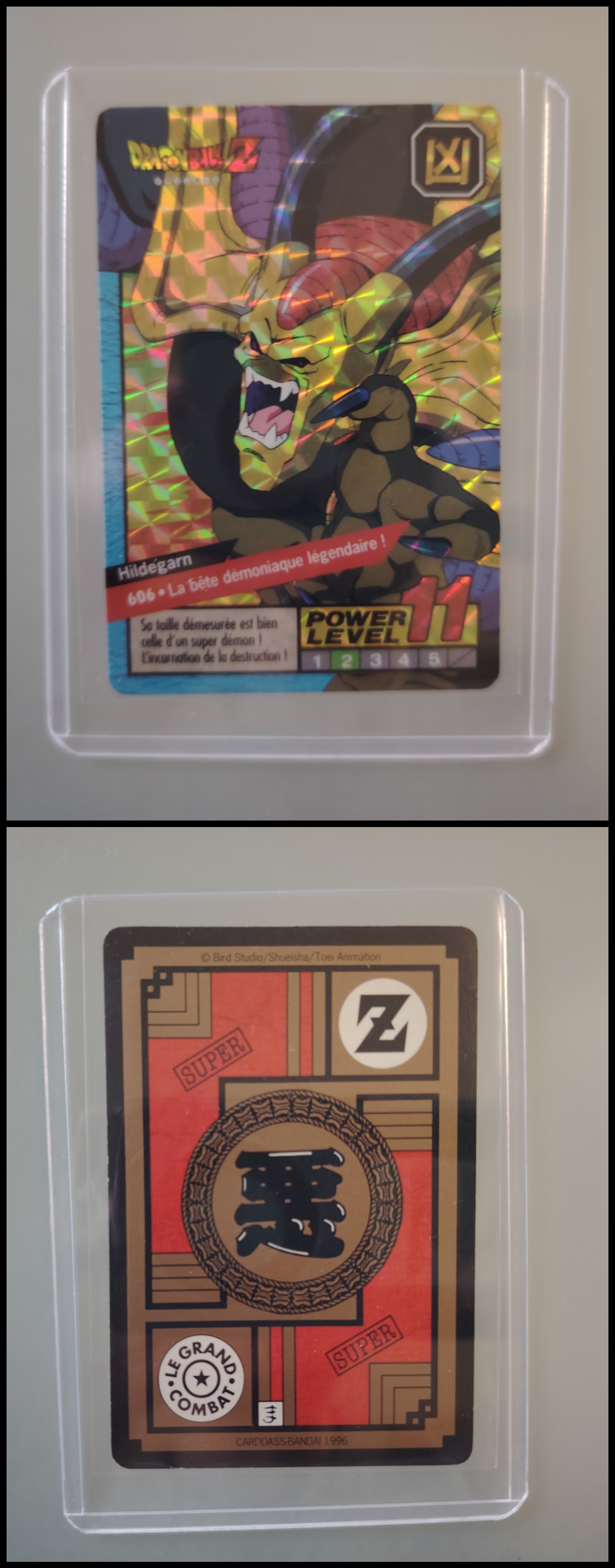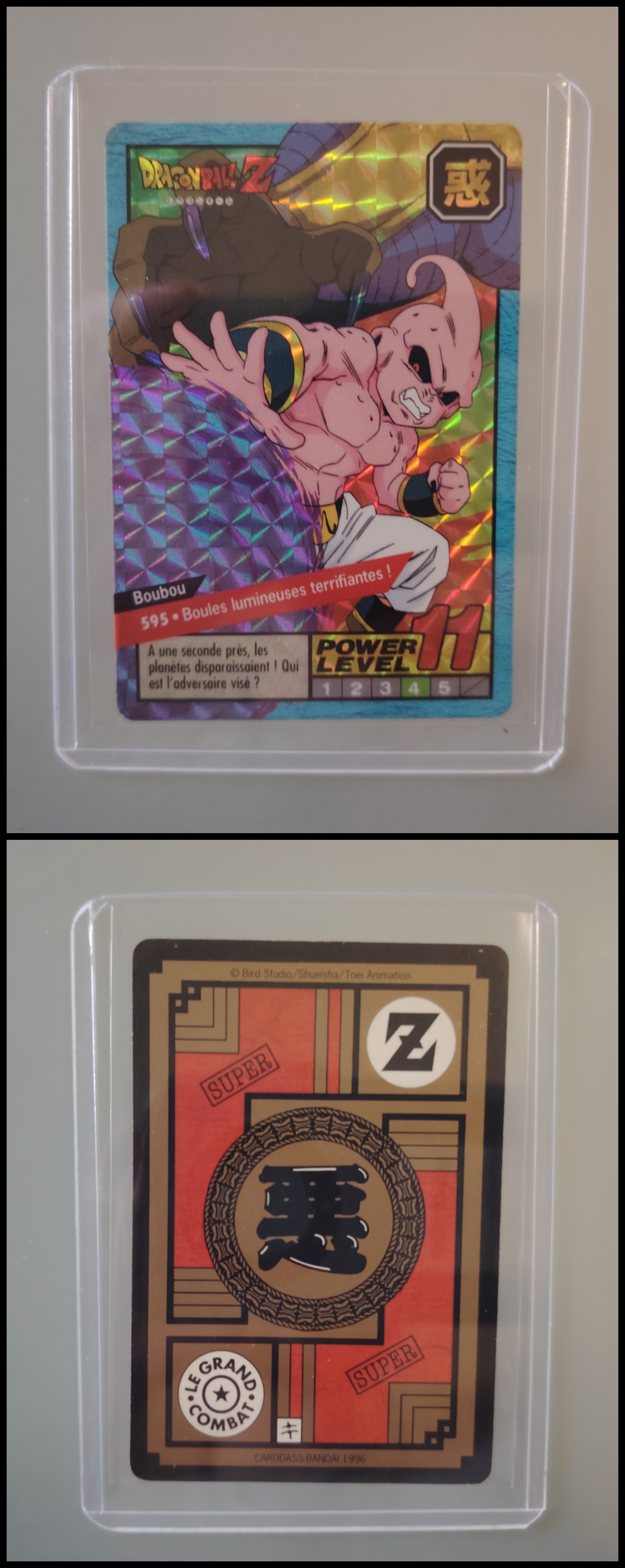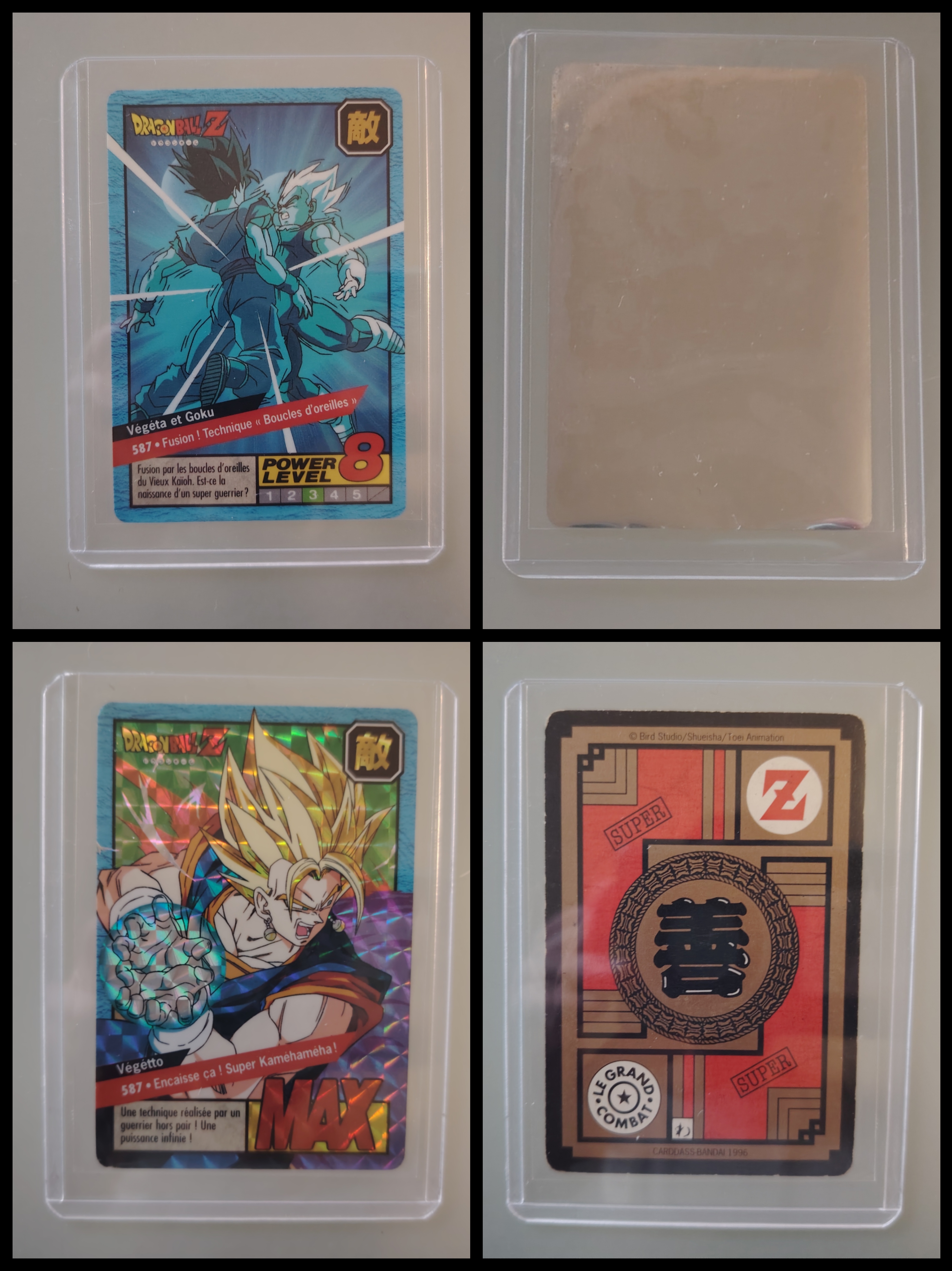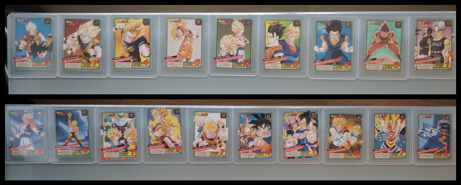 Lot de 247 cartes des séries françaises Carddass et Le Grand Combat (1995 à 1998) + 7 boosters vides + 1 classeur + 1 pocket box + 1 mini classeur, dont voici le détail : - Lot de 36 cartes Carddass Hondan part 16 : HS, 1, 2, 3, 4, Héro : 1, 2, 3, 4, 5, 6, 7, 8, 9, 620, 622, 623, 624, 626, 627, 628, 631 (prism), 632 (prism), 633, 634, 635, 636, 637, 638, 639, 640, 641, 642, 643, 644, 645, année 1995. - Lot de 34 cartes Carddass Hondan part 17 : 5, 6, 7, 9, 10, 12, 13, 14, 15, 16, 18, 19, 20, 21, 22, 23, 24, 25, 26, 27, 28, 29, 30, 31, 32, 33, 34,35, 37, 38 (prism état moyen), 39, 40, 41, 42, année 1995. - Lot de 34 cartes Carddass Hondan part 20 : 127, 128, 129, 131, 132, 133, 134, 135, 136, 137, 138, 139, 140, 141, 142, 144, 145, 146, 147, 148, 149, 150, 152, 153, 156, 157, 158, 160, 161, 162, 163, 164, 165, 166 Année 1996. - Lot de 32 cartes Le Grand Combat part 2 : 485 (Prism), 486, 487, 488, 489, 490, 494, 2 cartes 496 (double prism + face B), 497, 499, 501, 502, 504 507 (prism face B), 508, 509, 511, 512, 514, 515, 516, 517, 518 (prism état moyen), 520, 521, 522, 523, 524, 525, 526 (prism face B état Moyen), 528, année 1996. - Lot de 6 cartes Le Grand Combat part 3 : 540 (Prism), 551(Prism face B), 531, 555, 566, 572, année 1996. - Lot de 25 cartes Le Grand Combat part 4 : HS (état moyen), 575, 576, 578, 580, 582, 583, 586, 587 Prism (Face A / B décollées), 588, 590, 591, 592, 595 (Prism), 599, 601, 604, 606 (Prism), 607, 608, 610, 611, 614, 616, année 1996. - Lot de 10 cartes Le Grand Combat part 5 : 630, 633, 638, 642, 643, 646, 649, 651, 654, 656, année 1996. - Lot de 9 cartes Le Grand Combat part 6 : 668, 677, 684, 686, 688, 691, 693, 698, 703, année 1997. - Lot de 14 cartes part 7 : 710, 711, 712, 717, 721, 722, 723, 728, 729, 735, 736, 740, 746, 747, année 1997. - Lot de 36 cartes Le Grand Combat part 8 : 750, 751, 752, 753, 754, 755, 756, 757, 759, 761, 762, 763, 765, 766, 767, 768, 769, 772, 773, 774, 775, 776, 777 (Hidden Prism), 778, 779, 780, 781, 783, 784, 785, 786, 787, 788, 789, 791, 792, année 1998. - Lot de 11 cartes Le Grand Combat part 9 : 808, 809, 810, 812, 816, 823, 824, 825, 828, 831, 834, année 1998. - Lot de 7 boosters vides Carddass Hondan part 2, 4, 5, 6, 7, 9. - 1 Classeur avec 6 feuilles de rangement de la part 5 de 1996. - 1 boîte pocket Carddass. - 1 mini classeur dépliants. État : Bon état général sauf si mention, chaque cartes est protégées dans une sleeve + toploader. Ce dernier peut éventuellement avoir des traces ou des micros poussières. Veuillez consulter la vidéo pour avoir davantage de visuels, n'hésitez pas a me contacter si vous avez besoin de photos complémentaires.