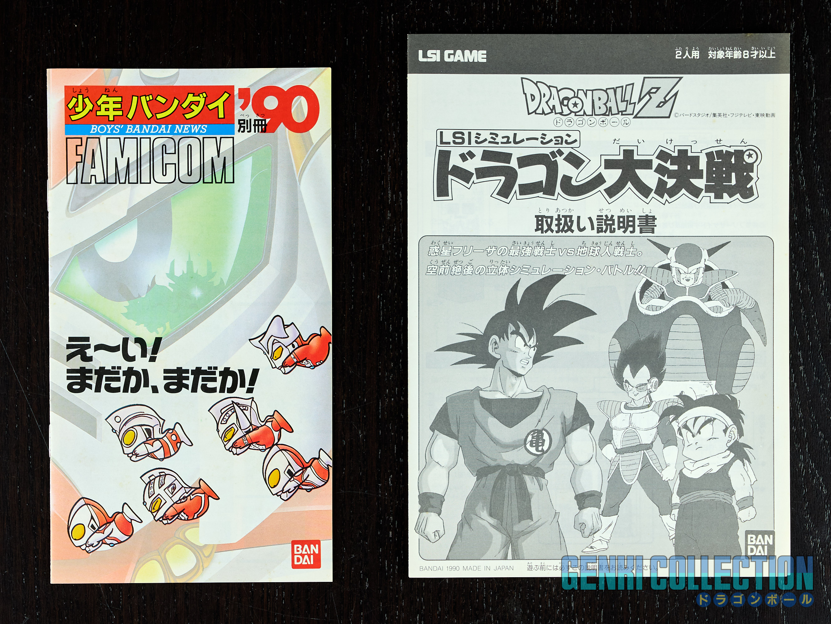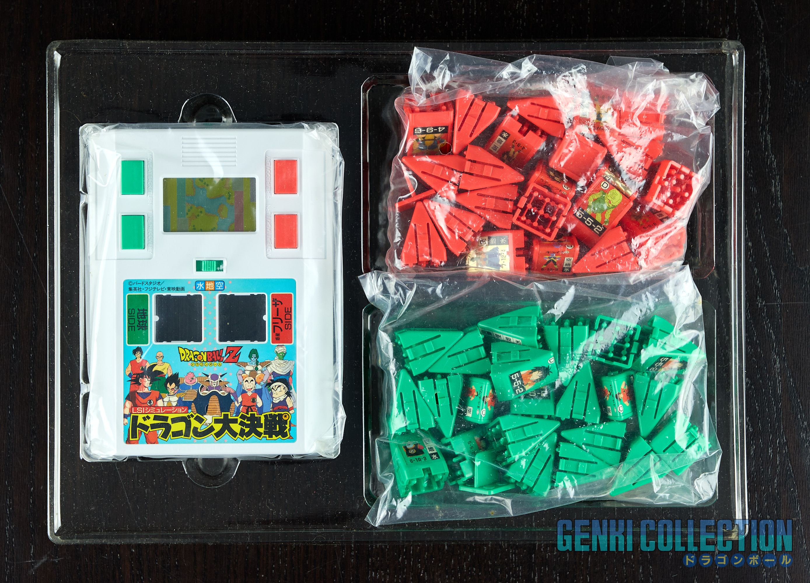Jeu de plateau électronique Dragon Ball Z datant de 1990 et édité par Bandai, Dragon Dai Kessen. Jeu complet avec notice, pions, flyer publicitaire et appareil électronique fonctionnel avec deux piles AAA (LR3, non fournies), les autocollants ont été collés sur les pions. Très bon état général, excepté la boîte qui présente quelques petits défauts esthétiques (légers plis et usure sur les coins).