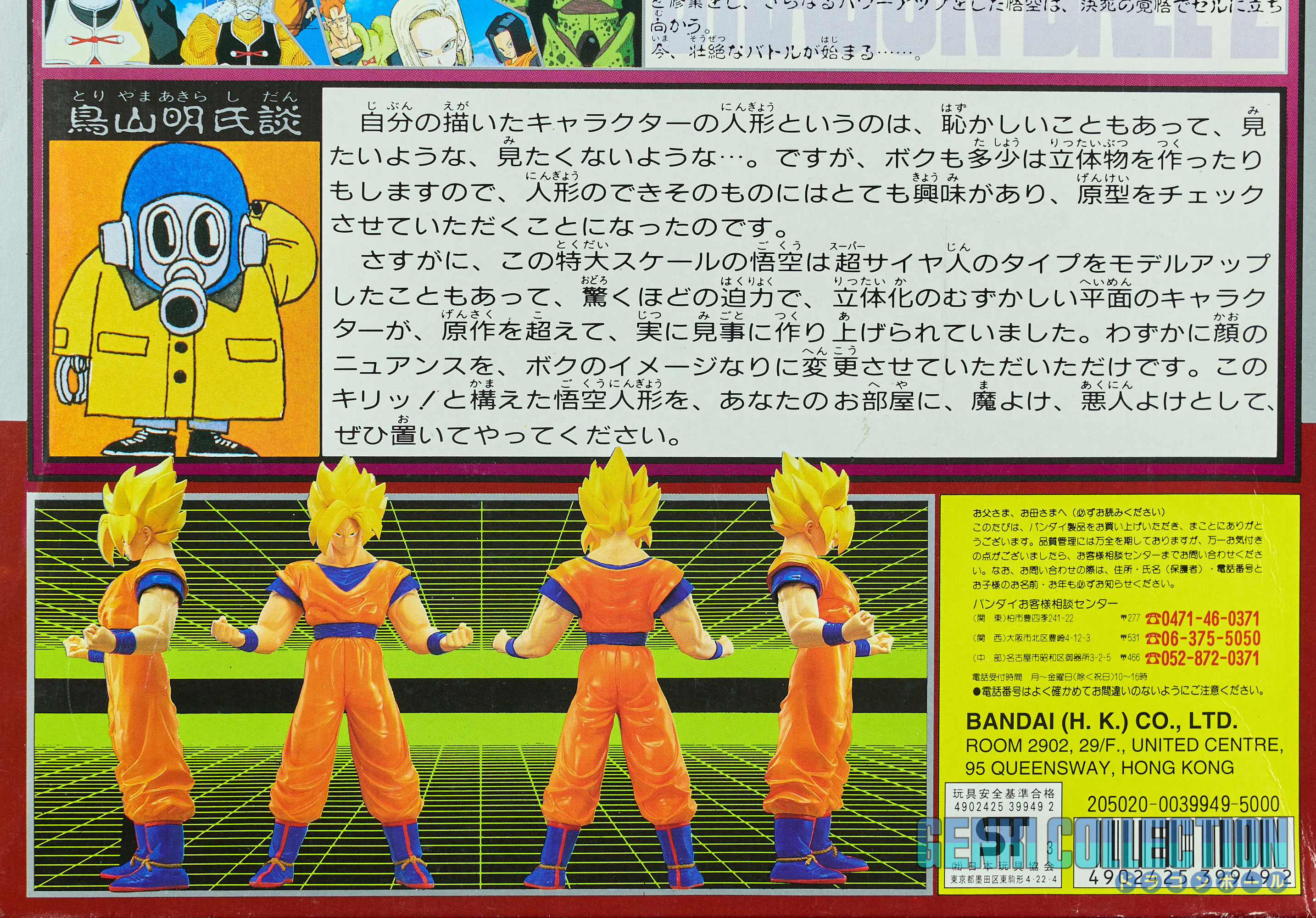 Figurine exceptionnelle de Son Goku Super Saiyan, The Best Of Dragon Ball Z, d'une hauteur de 40 cm, éditée en 1994 par Bandai, dans sa boîte d'origine. Figurine rare et difficile à trouver en boîte. Bon état général, la boîte présente quelques défauts (légers enfoncement de la face et usure sur les coins). Au dos se trouve un commentaire d'Akira Toriyama précisant qu'il a énormément apprécié la modélisation de ce modèle.