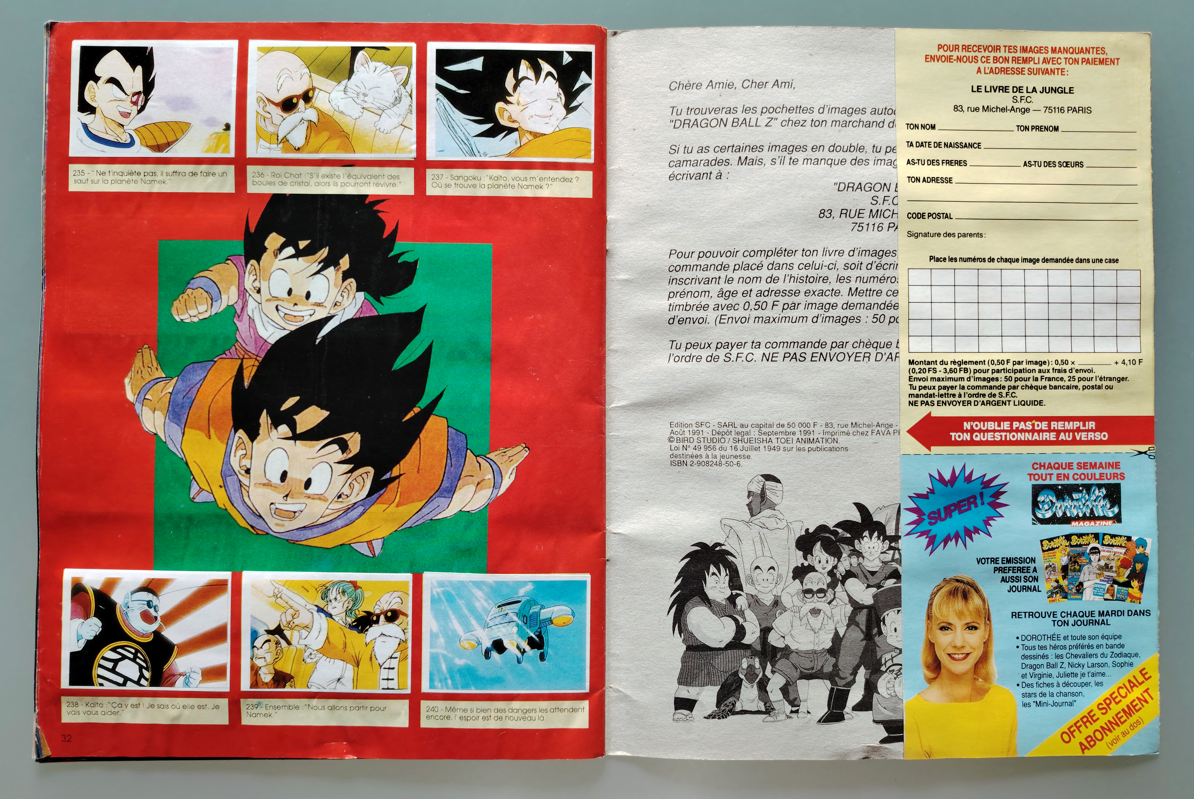 Album complet Dragon Ball Z "Le Livre en Images de tes Héros", sorti en 1991 par SFC (anciennement Panini) + 2 pochettes, dont une scellée (la bleue).
