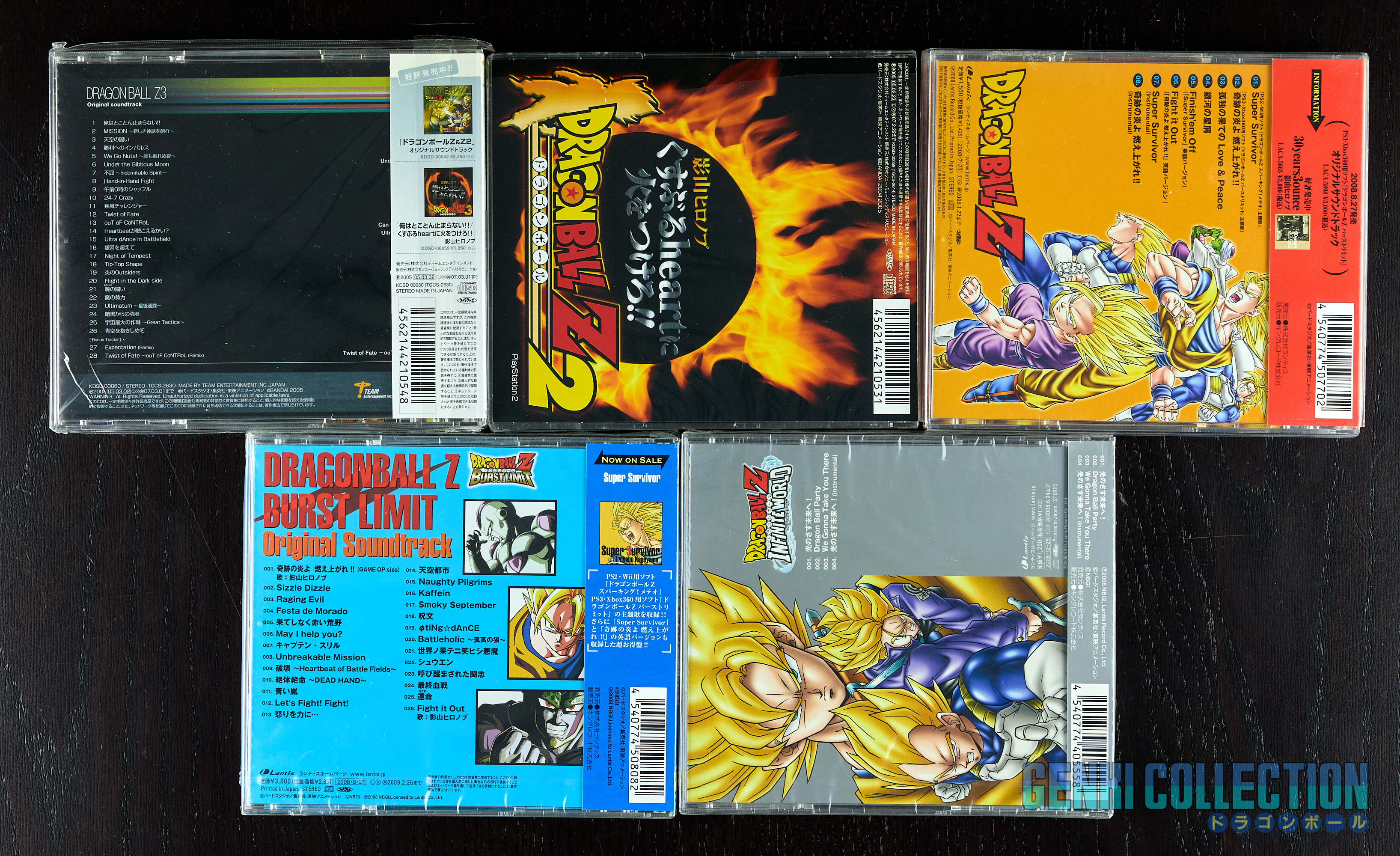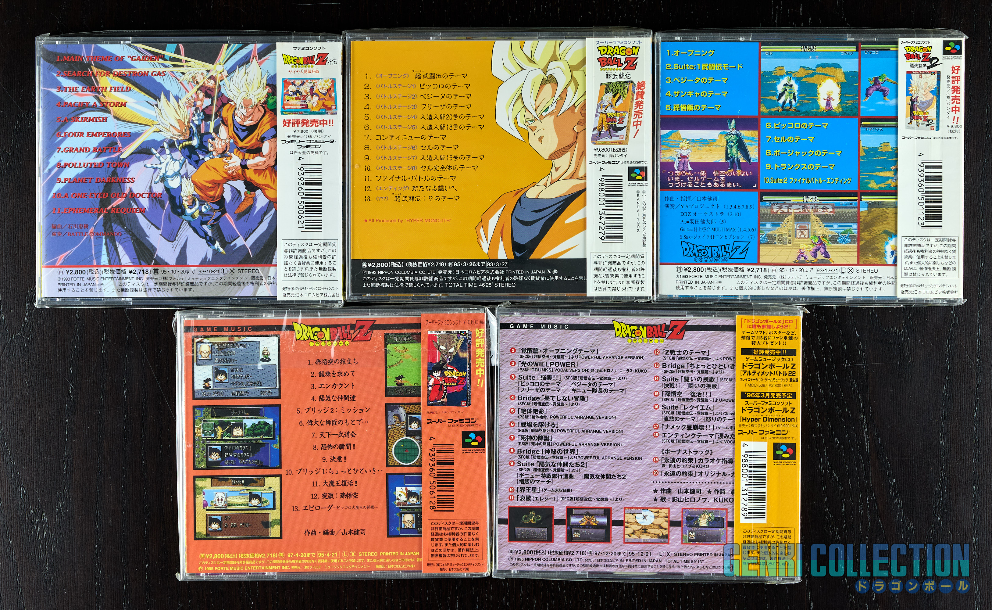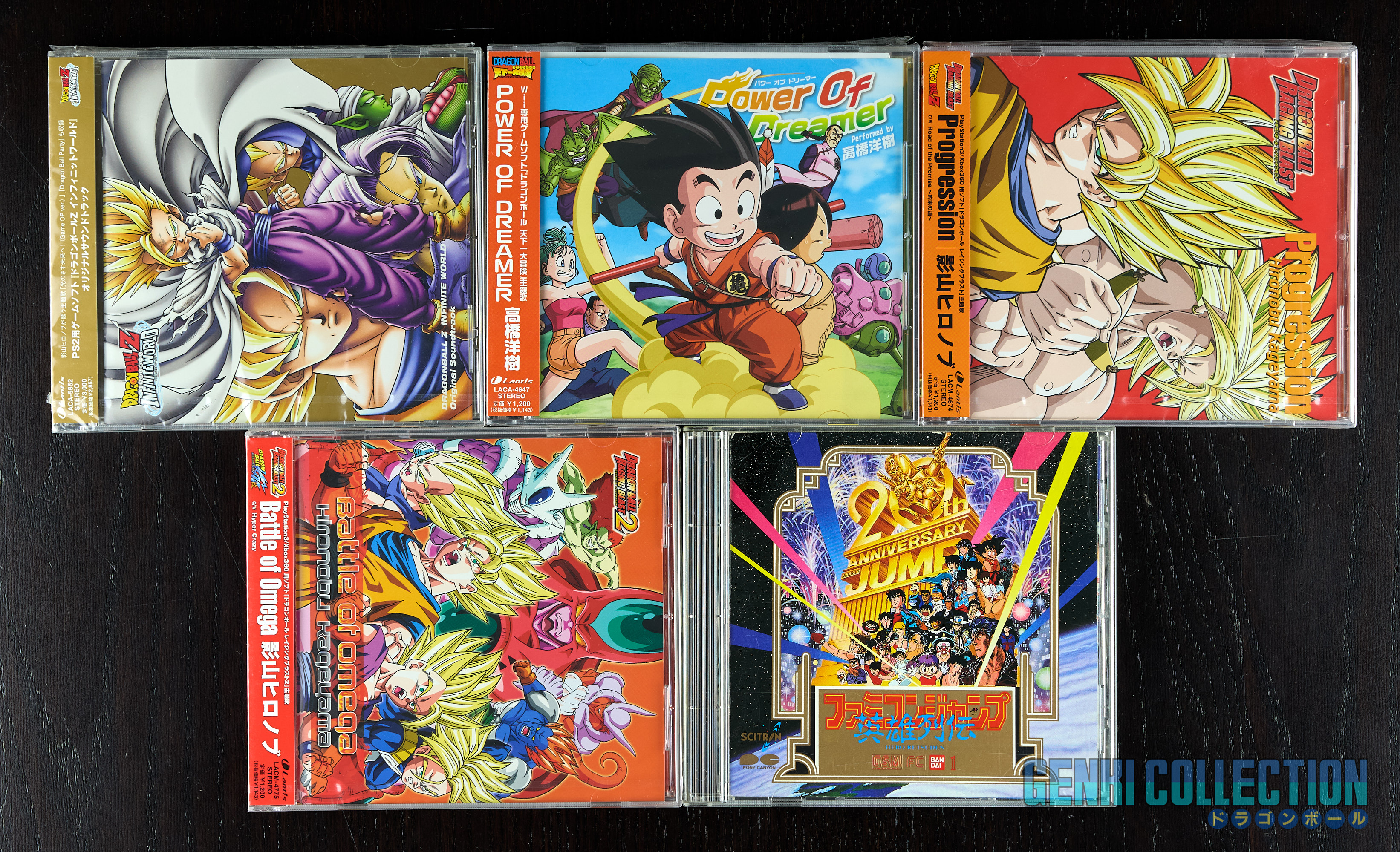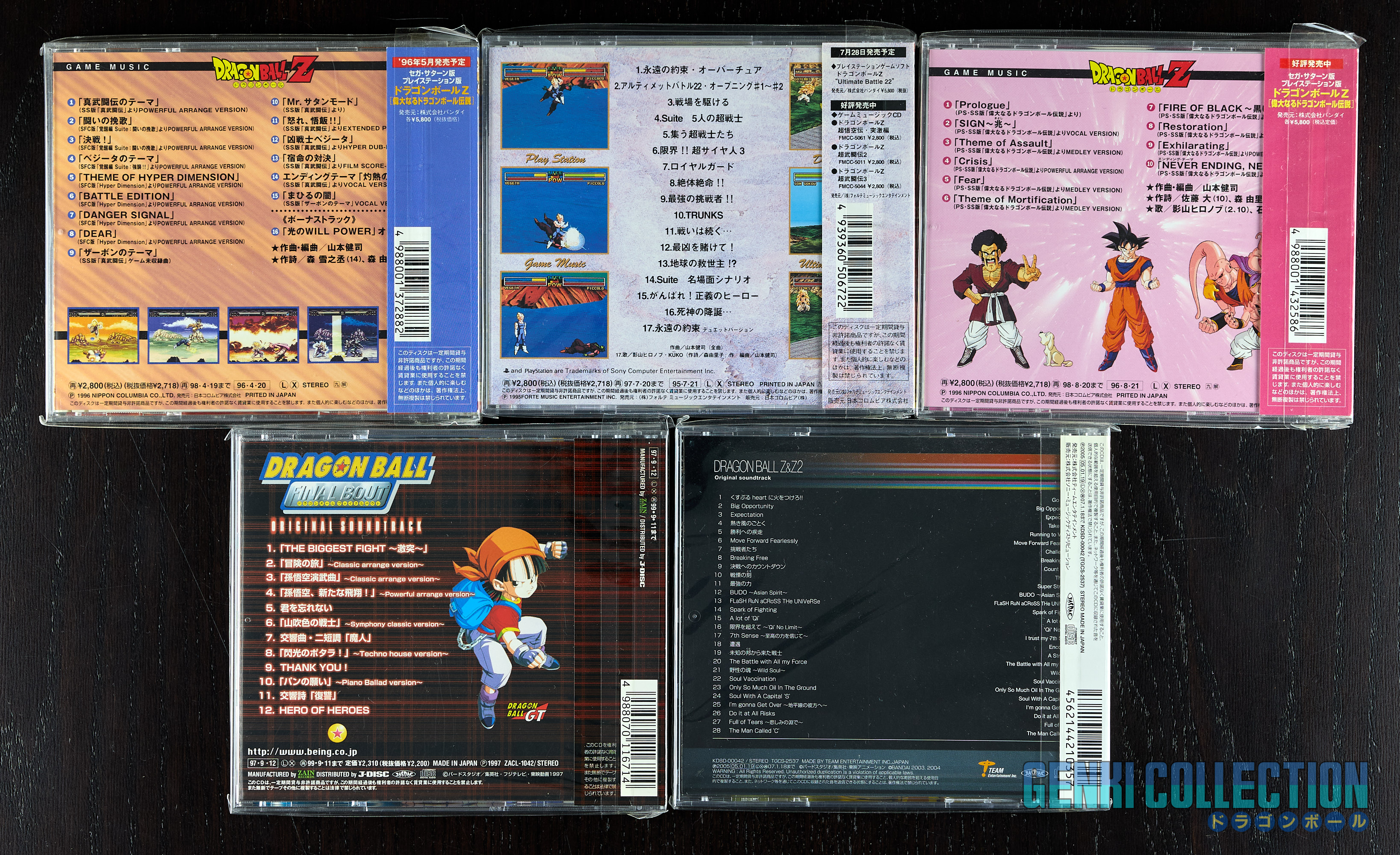 Magnifique set comprenant 20 CD audios Dragon Ball et Dragon Ball Z basés sur les jeux vidéos. Tous les albums sont en excellent état, CD non rayés, livrets présents, ainsi que chaque Obi (spine card). Chaque album est protégé sous sleeve. Le set comprend : - Famicom Jump Hero Retsuden (1989 - Pony Canyon) avec posters + sticker prism + sticker de tranches non décollés. - Dragon Ball Z Gaiden Saiyajin Zetsumetsu Keikaku (1993 - Forte Muscic Entertainment) avec illustration en noir et blanc inédite. - Dragon Ball Z Super Butôden (1993 - Columbia) avec sticker de la jaquette. - Dragon Ball Z Super Butôden 2 (1993 - Forte Music Entertainment) avec illustration inédite en noir et blanc et sticker de la jaquette. - Dragon Ball Z Super Gokû Den Totsugeki Hen (1995 - Forte Music Entertainment) avec sticker de la jaquette. - Dragon Ball Z Game Music Kakusei Hen (1995 - Columbia) avec sticker de la jaquette. - Dragon Ball Z Game Music Saisei Hen (1996 - Columbia) avec sticker de la jaquette. - Dragon Ball Z Game Music Tanjô Hen Ultimate Battle 22 (1995 - Forte Music Entertainment) avec sticker de la jaquette. - Dragon Ball Z Idainaru Dragon Ball Densetsu (1996 - Columbia) avec sticker de la jaquette. - Dragon Ball Z Final Bout Soundtrack (1997 - Zain Records). - Dragon Ball Z & Z2 Original soundtrack (2005 - Team Entertainment) avec DVD Bonus des coulisses de la réalisation du clip du jeu. Dragon Ball Z3 Ore wa Tokoton Tomaranai!! - Kusuburu Heart ni Hi o Tsukero!! (2005 - Team Entertainment). - Dragon Ball Z 3 Original soundtrack (2005 - Team Entertainment). - Super Survivor (2008 - Lantis). - Dragon Ball Z Burst Limit Original soundtrack (2008 - Lantis). - Dragon Ball Z Infinite World Hikari no Sasu Mirai he! (2008 - Lantis). - Dragon Ball Z Infinite World Original soundtrack (2009 - Lantis). - Dragon Ball Power of Dreamer (2009 - Lantis). - Dragon Ball Raging Blast Progression (2009 - Lantis). - Dragon Ball Raging Blast Battle of Omega (2010 - Lantis).