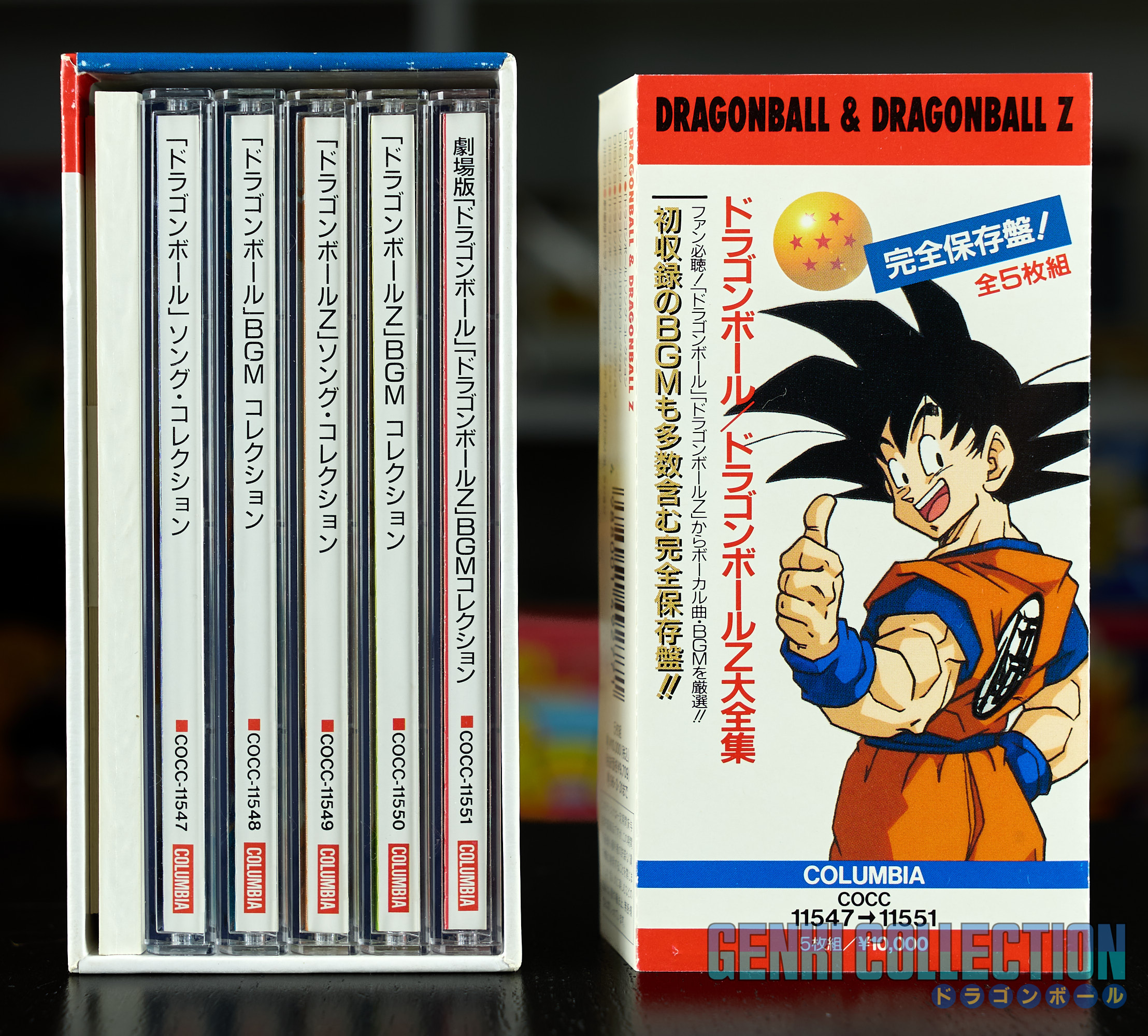 Très rare avec Obi, c'est sans doute l'un des plus beau coffret musicaux de Dragon Ball. Sorti en 1994 et édité par Columbia, il reprend la majorité des BGM et des chansons des séries Dragon Ball et Dragon Ball Z. Le coffret est en bon état, à signaler quelques légères usures sur les arrêtes au dos et le côté du coffret, il est complet avec son obi, les 5 discs en parfait état, une série de 6 illustrations cartonnées et son gros livret.