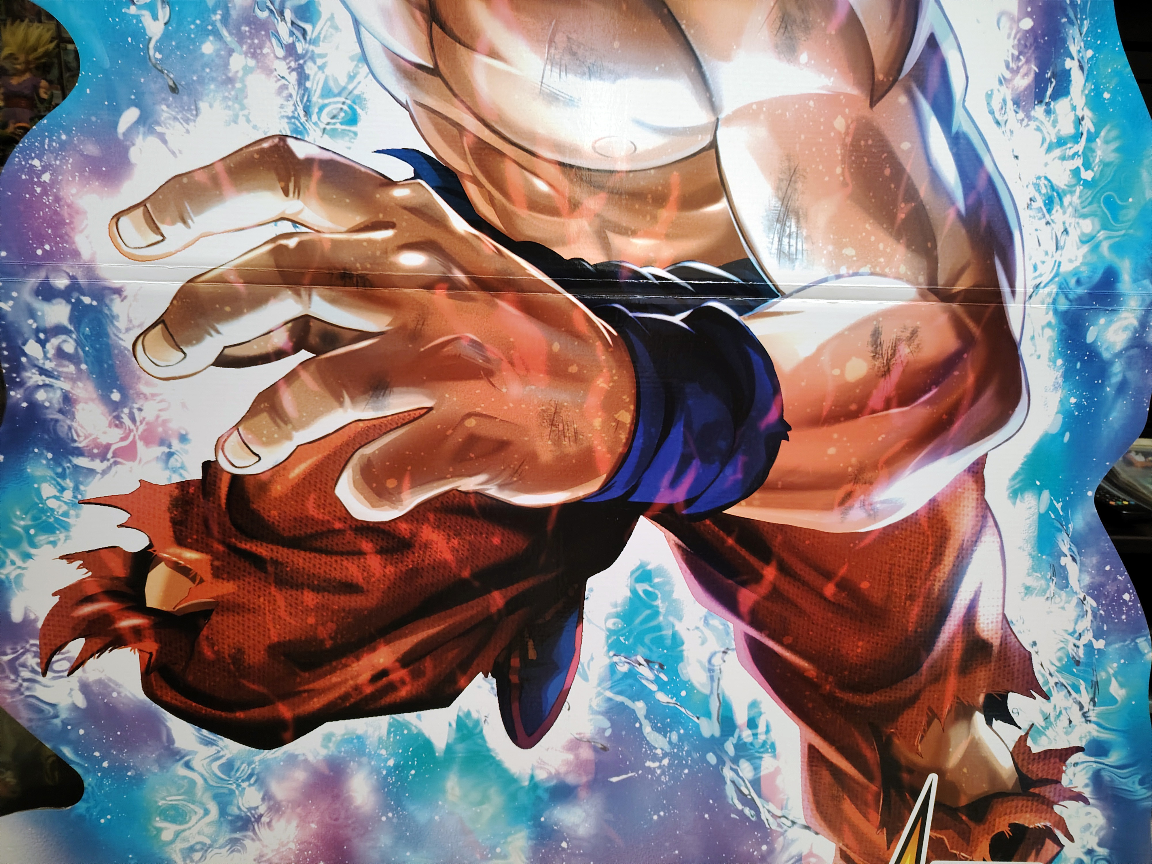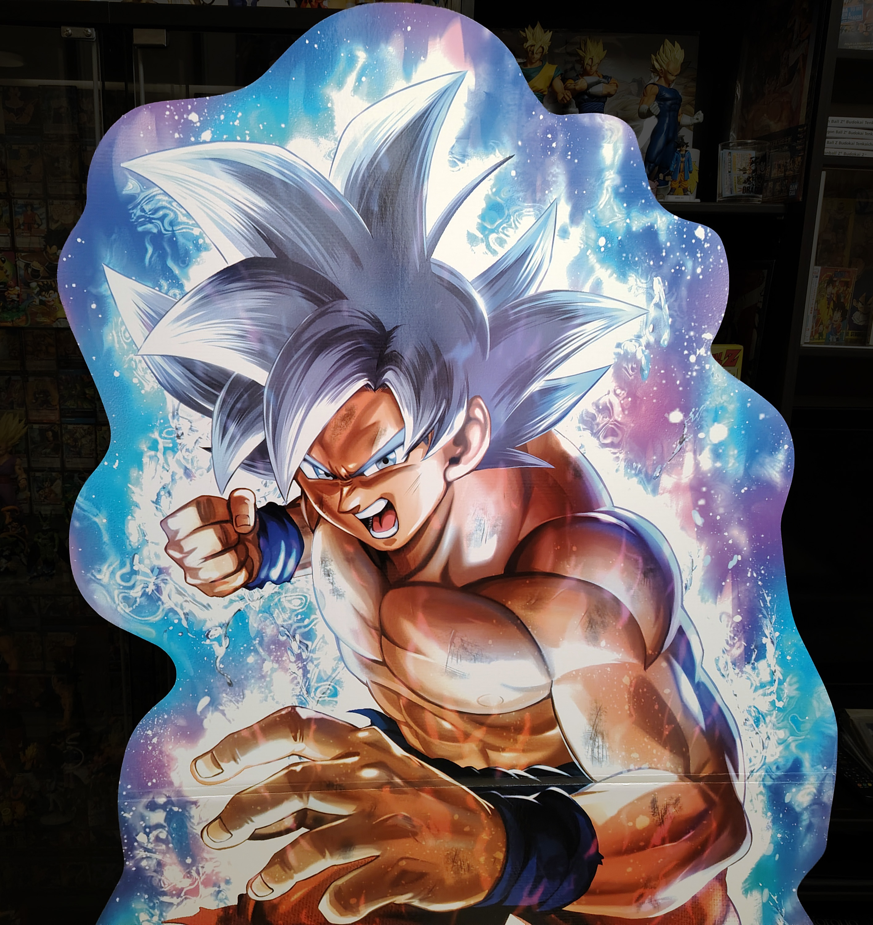 Standing promotionnel (PLV) Dragon Ball Super Card Game représentant Goku Ultra Instinct et mesurant 157 cm de haut et 90 cm de large. Sorti en 2019.