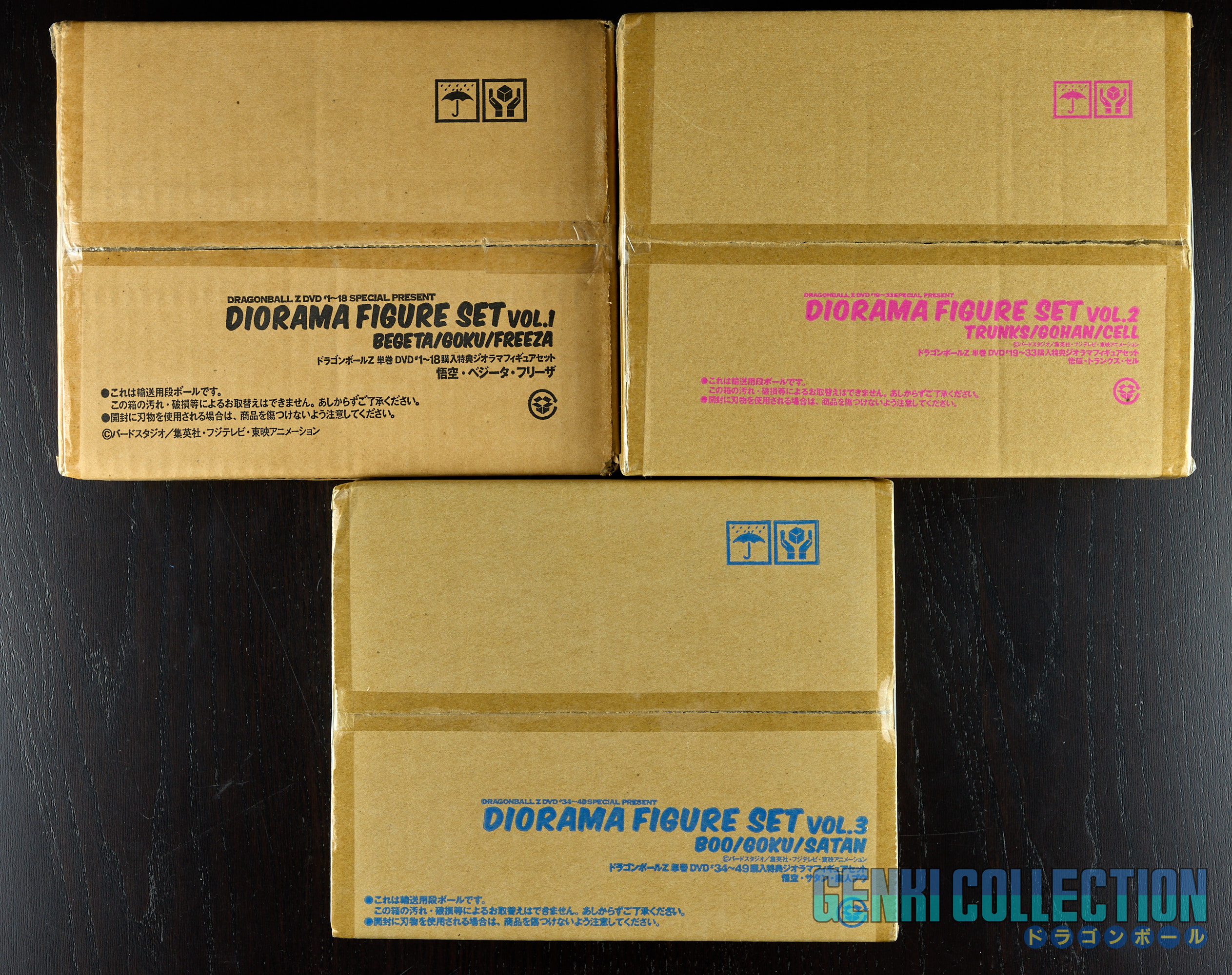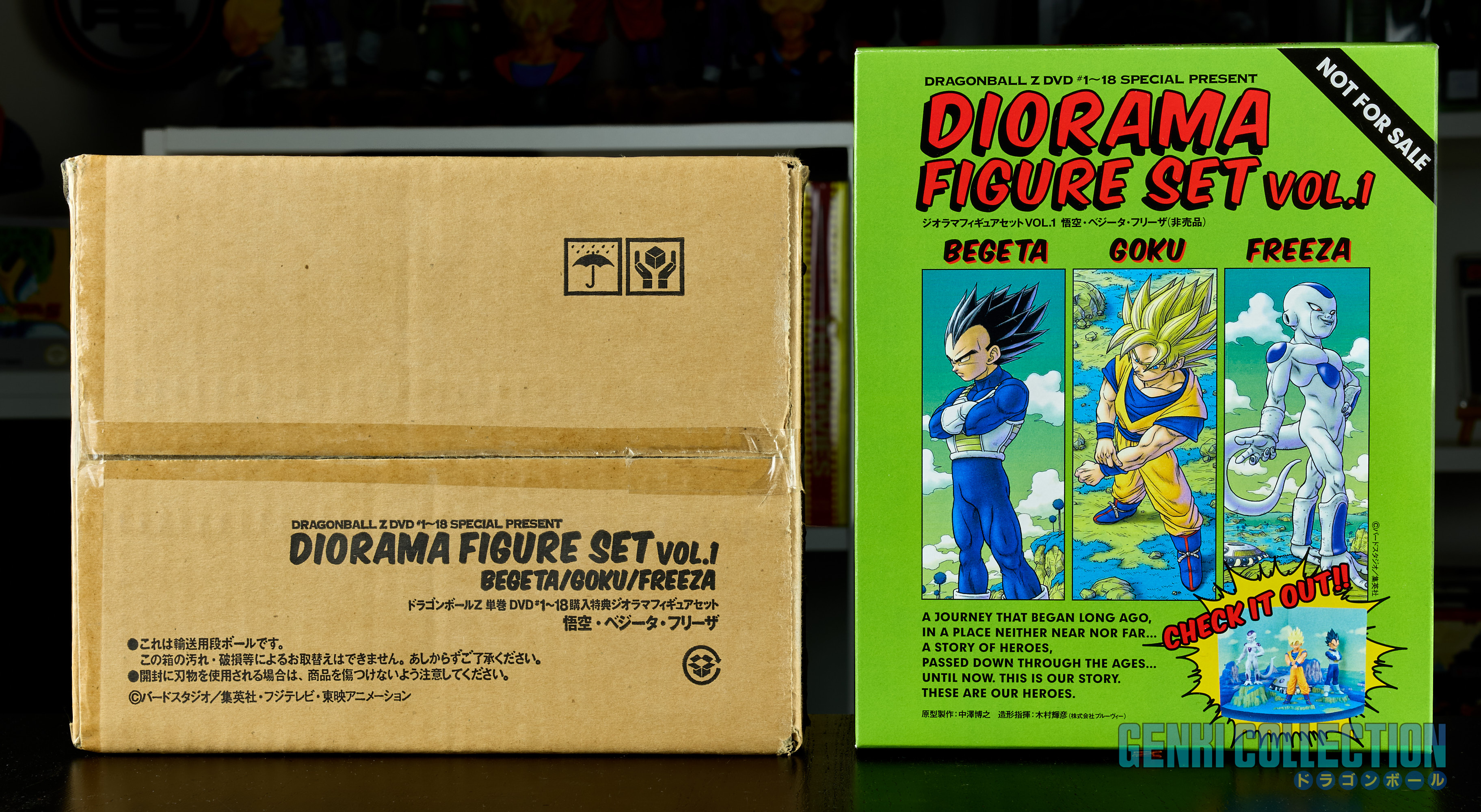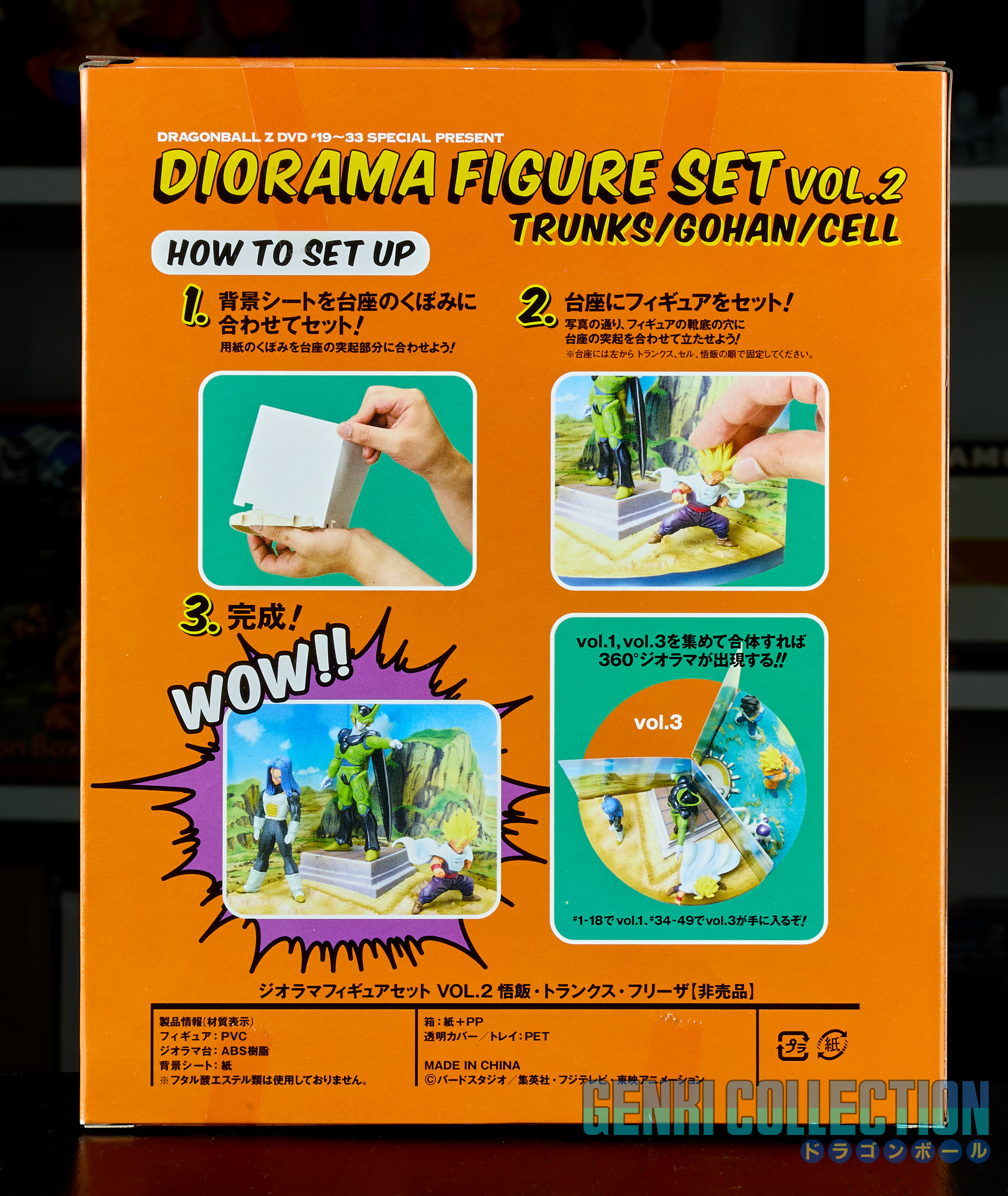The DBZ dioramas are in excellent condition with their boxes, the DB dioramas are in good condition (note that Kinto-un's tail is broken - see photos and videos - it remains barely visible but it was received this way). Both boxes show slight wear on the edges. The DBGT diorama is in good condition, as is the movies one; only the boxes show slight wear on the edges, similar to the Dragon Ball ones.