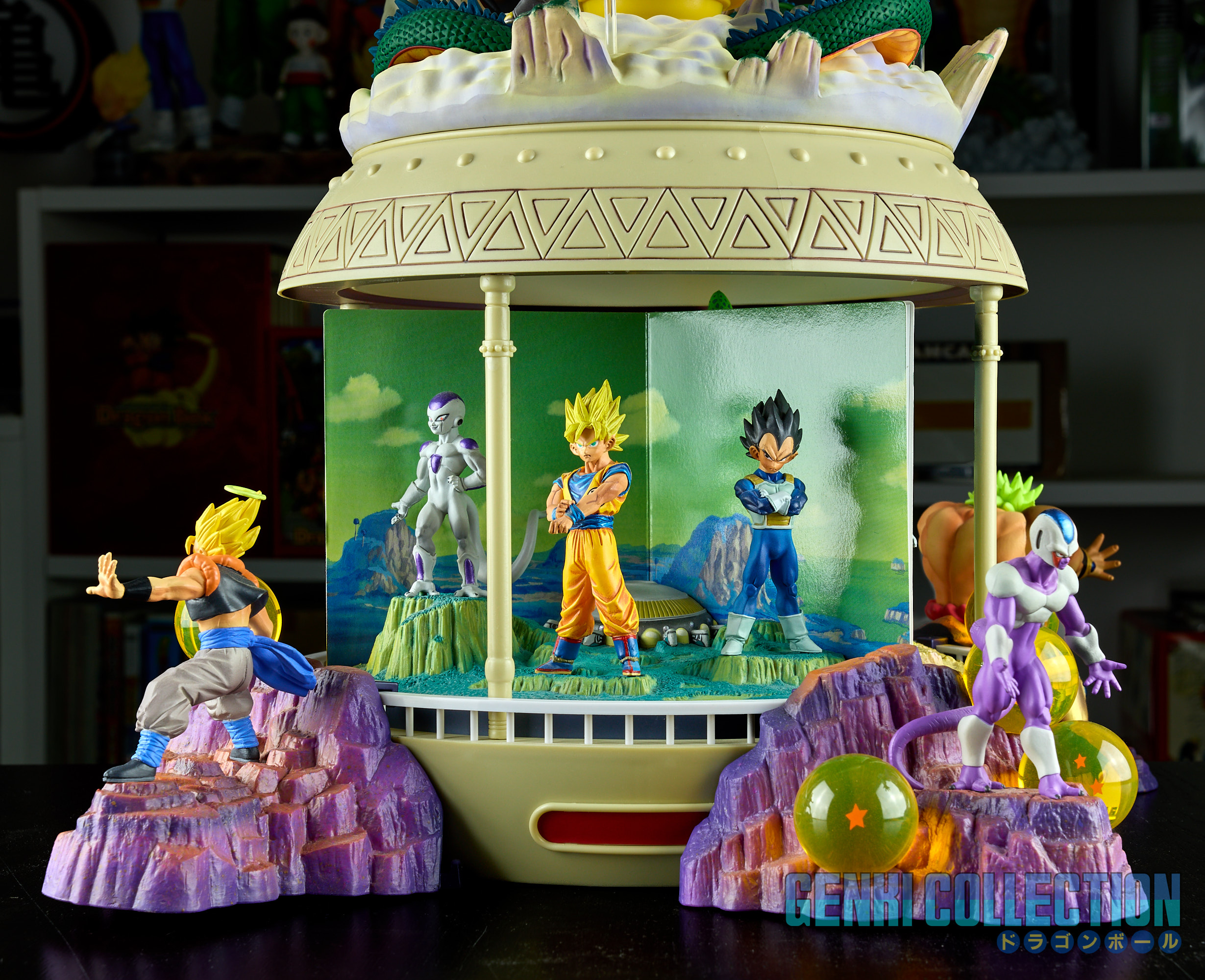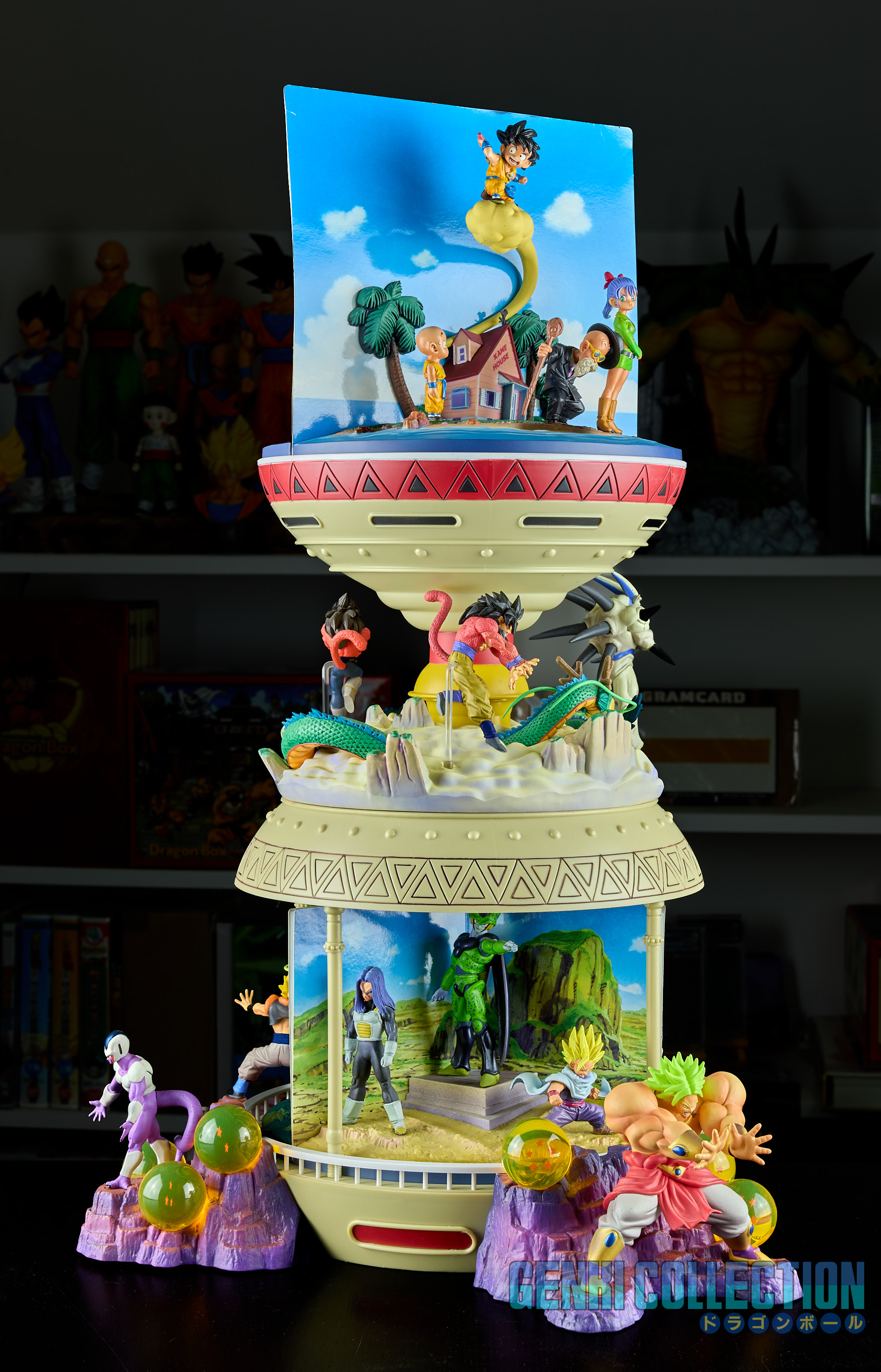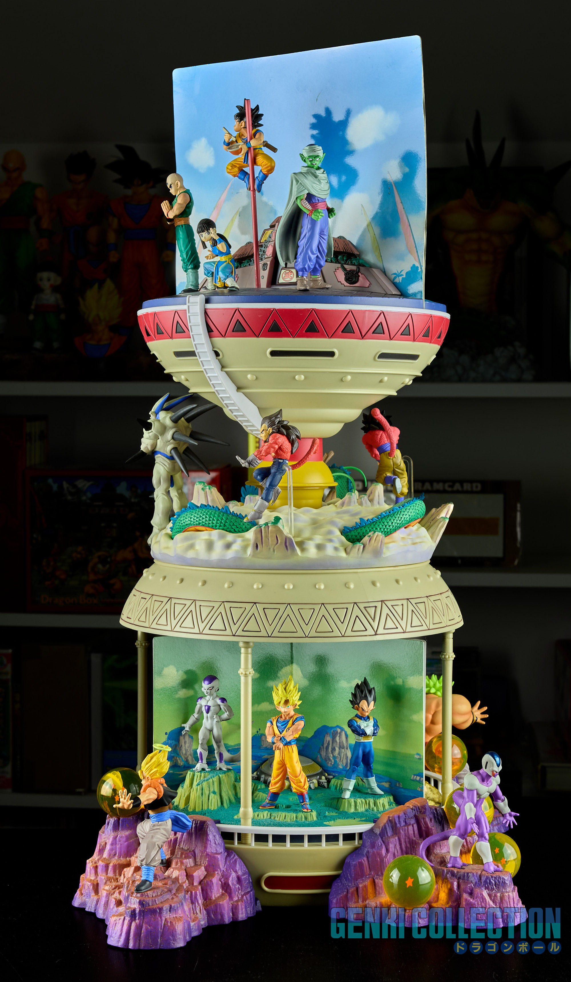 - Diorama Dragon Ball GT (Gokû Super Saiyan 4, Vegeta Super Saiyan 4 et Î Shinron ou Omega Shenron), celui-ci peut s'insérer entre la Tour Karin et le palais de Kami-sama.
