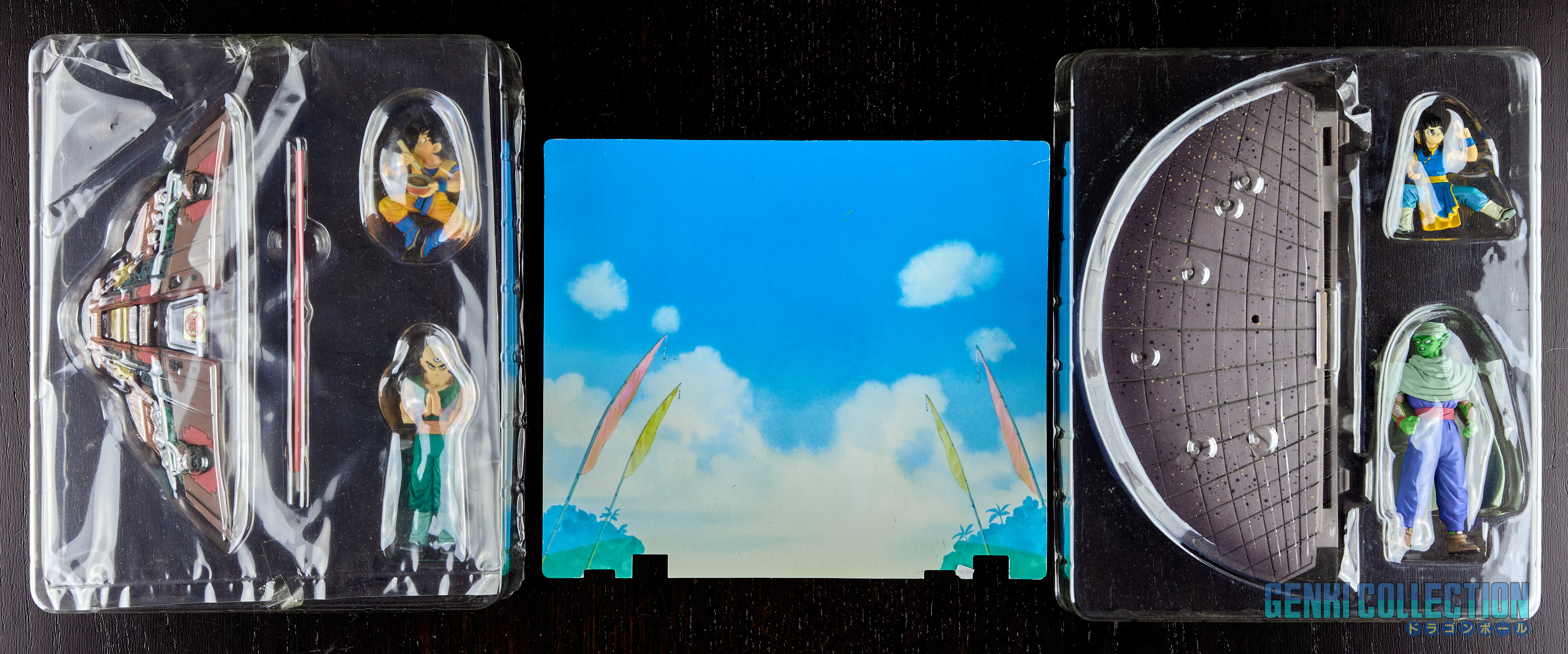 Complete diorama of Karin Tower and Kami-sama's Lookout with its exclusive Dragon Ball, Z, GT, and movies figures. This exceptional diorama was not sold in stores; it required collecting coupons to accumulate points when purchasing individual DVDs of the Dragon Ball, Dragon Ball Z, Dragon Ball GT series, and the movies in Japan. Once the required points were reached, a set could be redeemed. This set combines 9 lots released in this order: