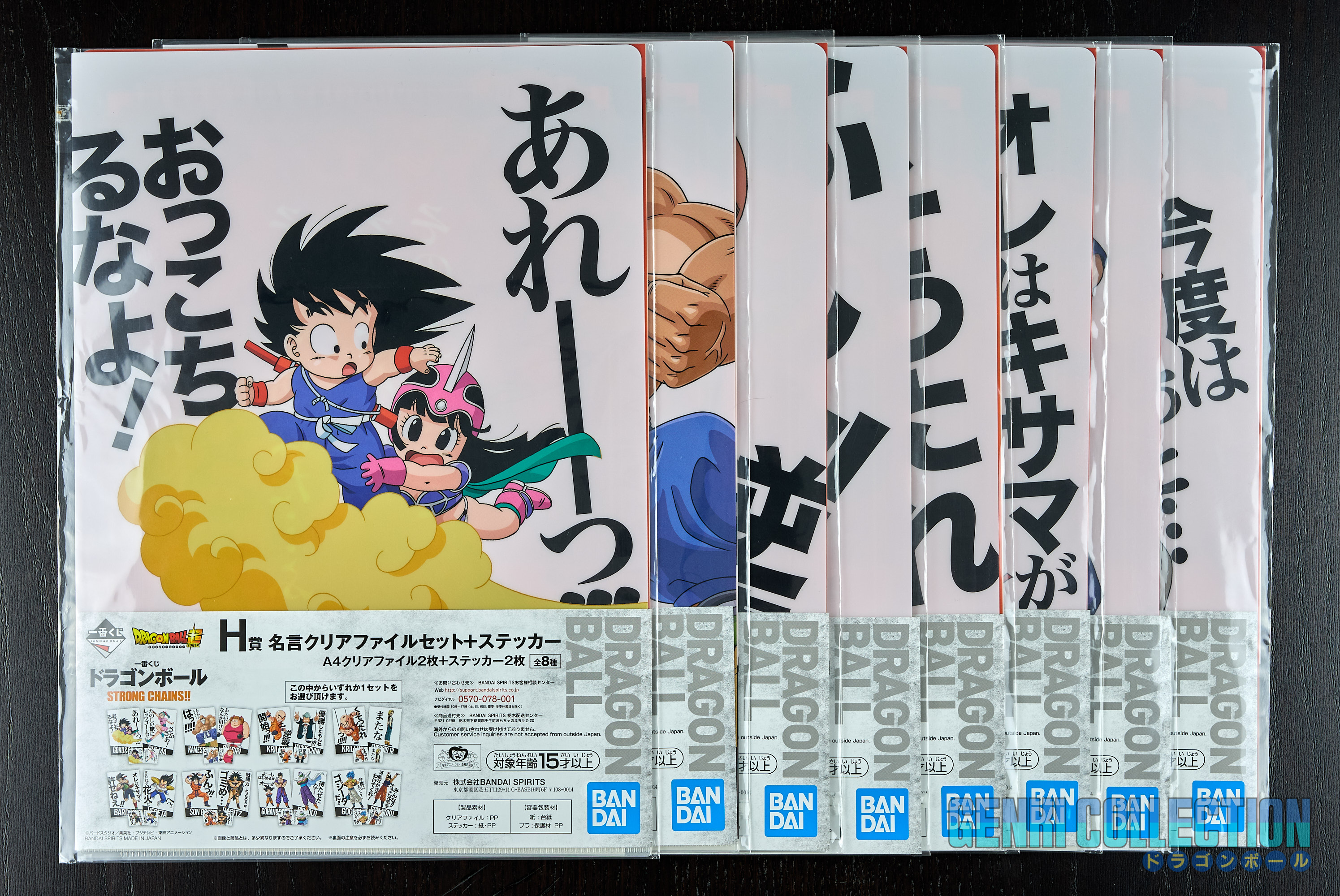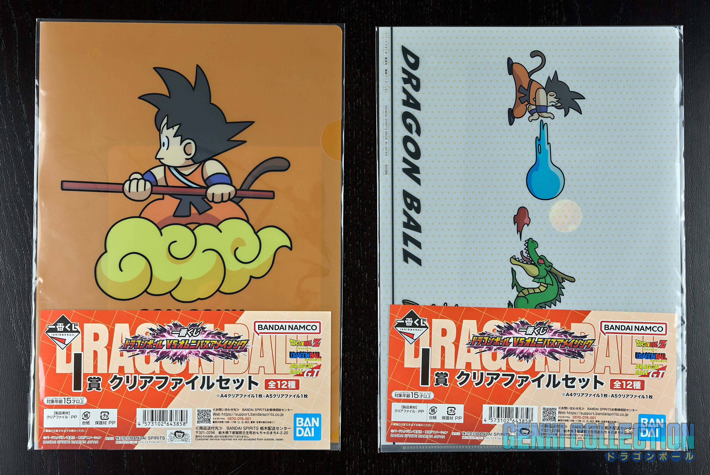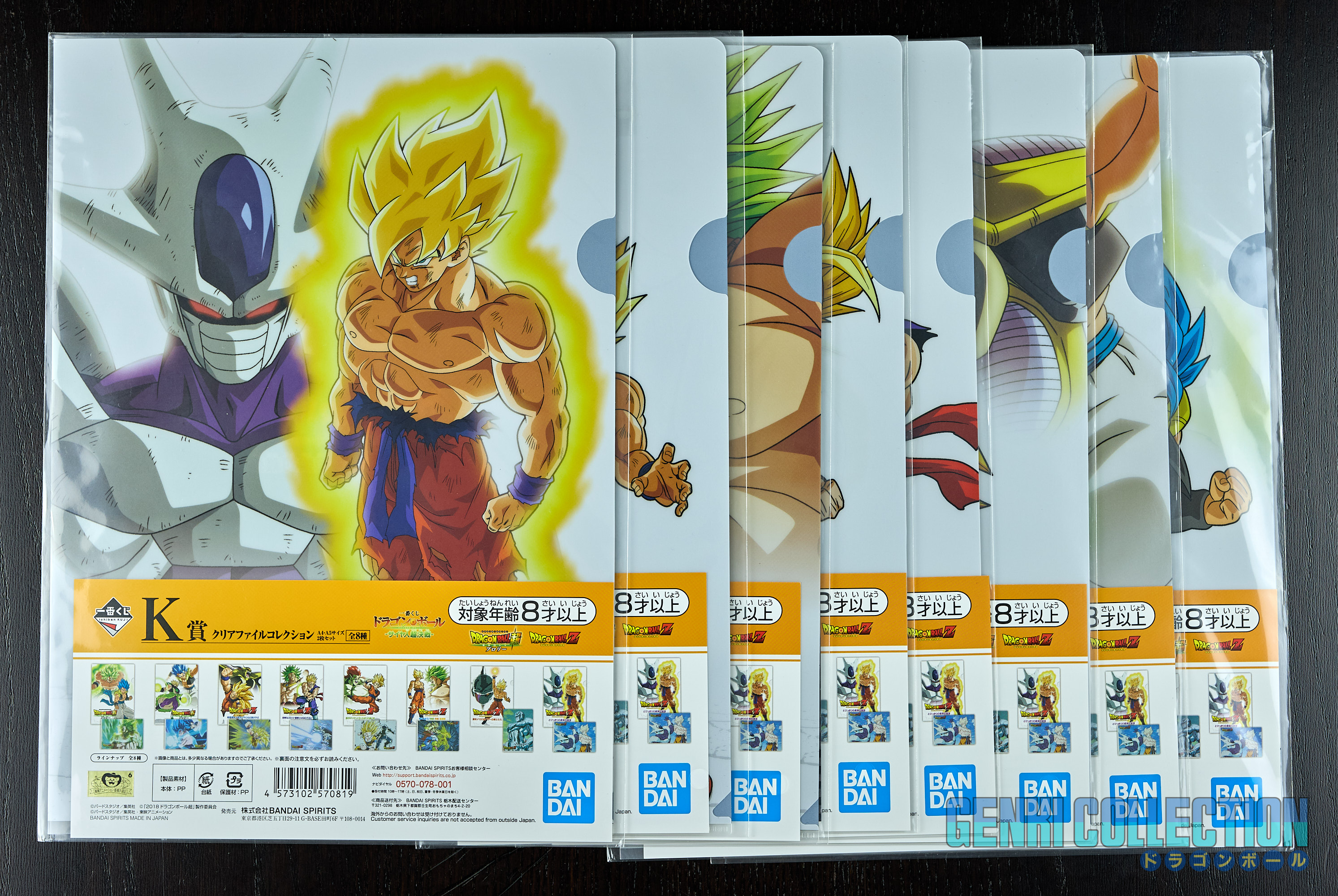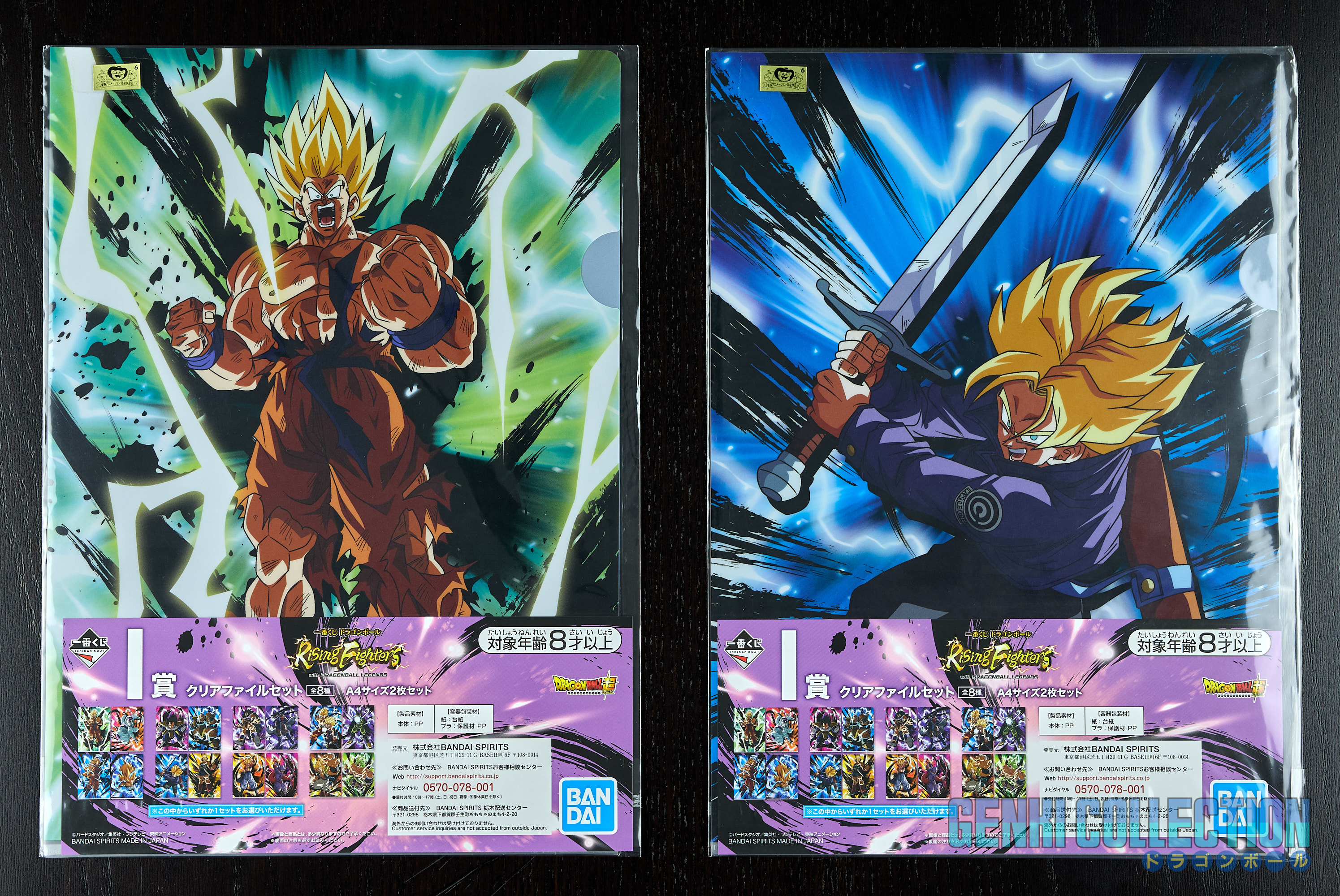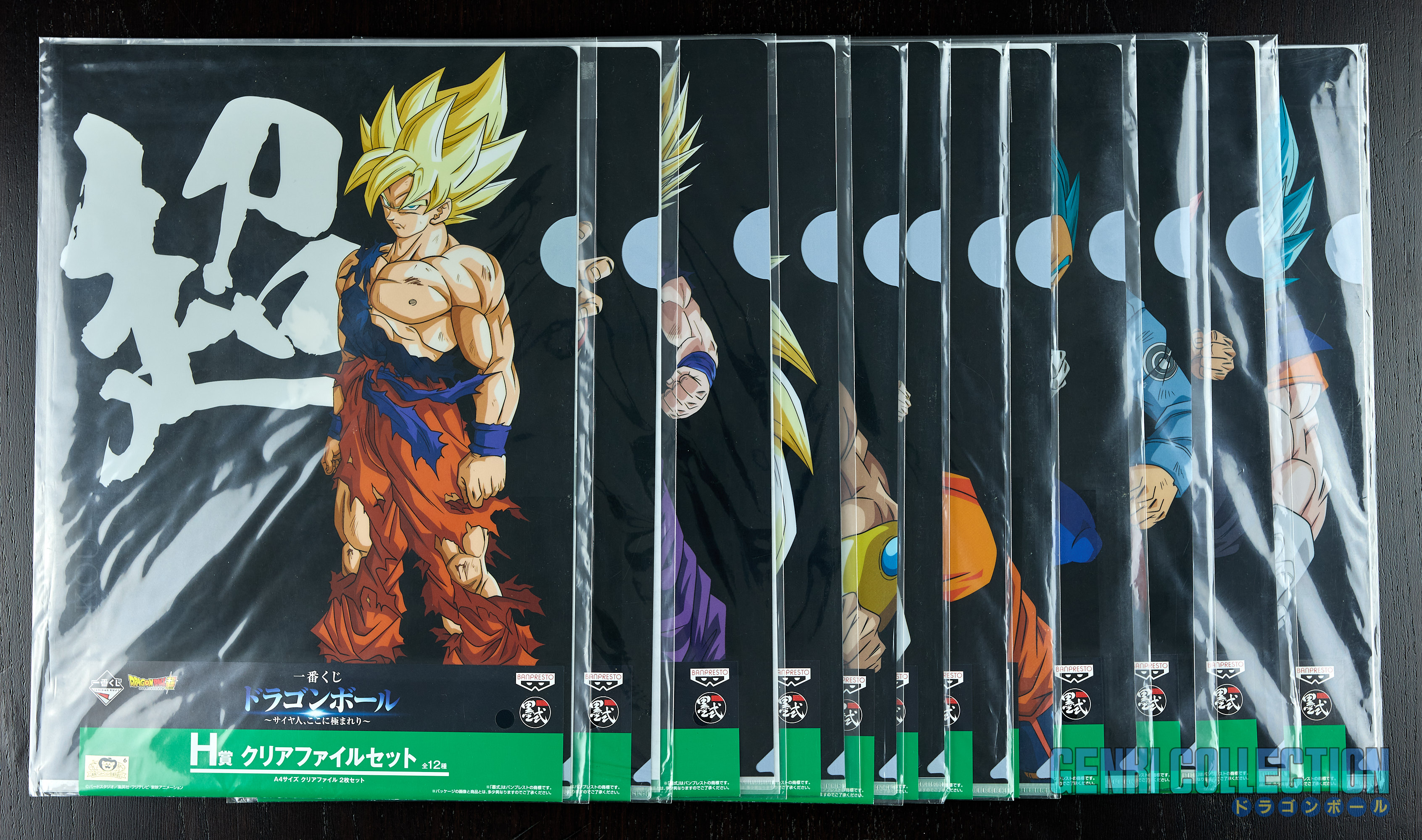 Ensemble de 346 clear files (chemises plastifiées au format A4 ou A5 pour certaines) Dragon Ball composés de 325 clears file répartis sur 20 full sets loteries Ichiban Kuji (2011 à 2024) et 21 clear files indépendants (à l'unité ou "Not for sale"), tous en excellent état dans leurs blisters d'origines (exceptés pour 2 ou 3 d'entre eux). Voici le détail des sets :