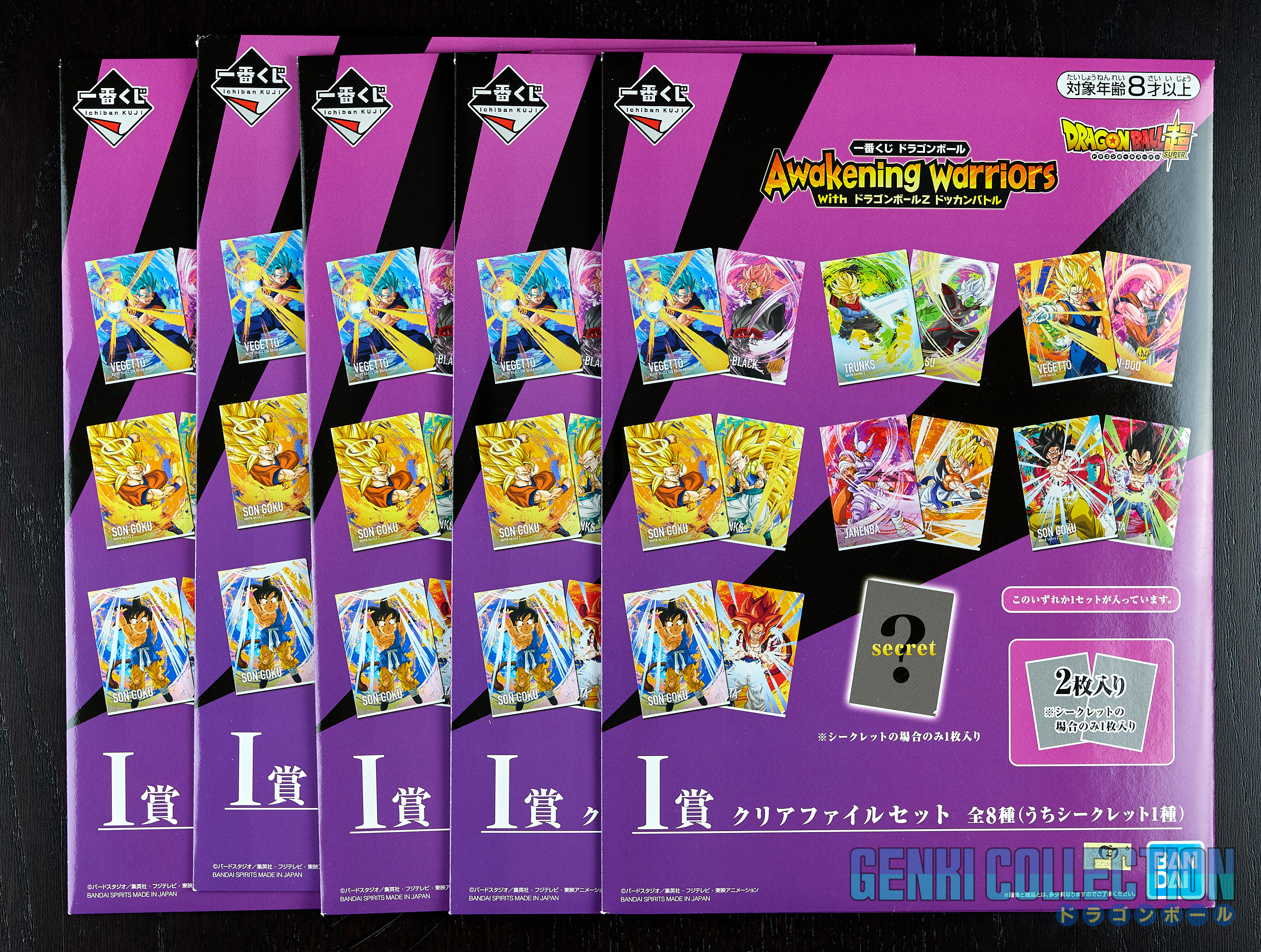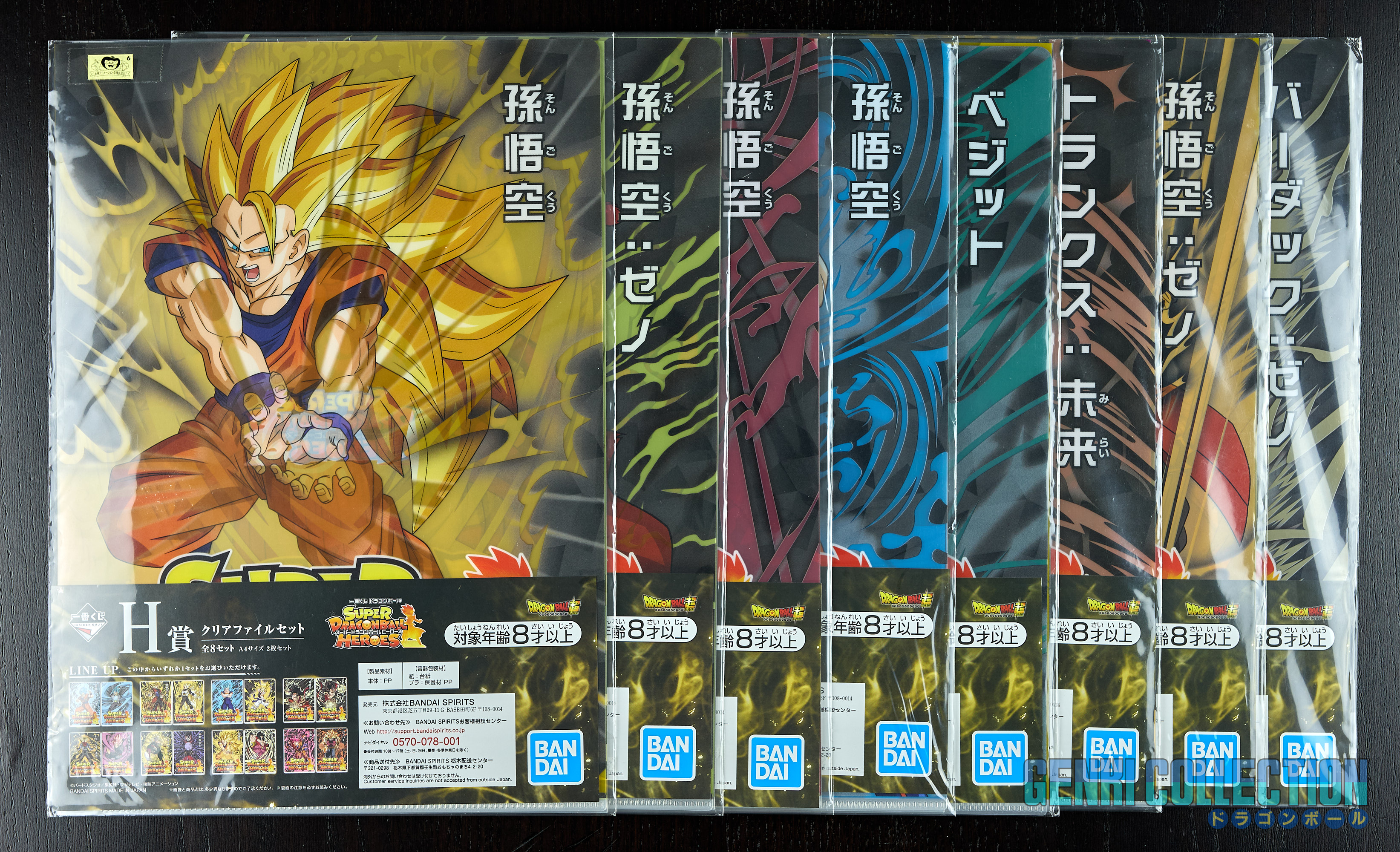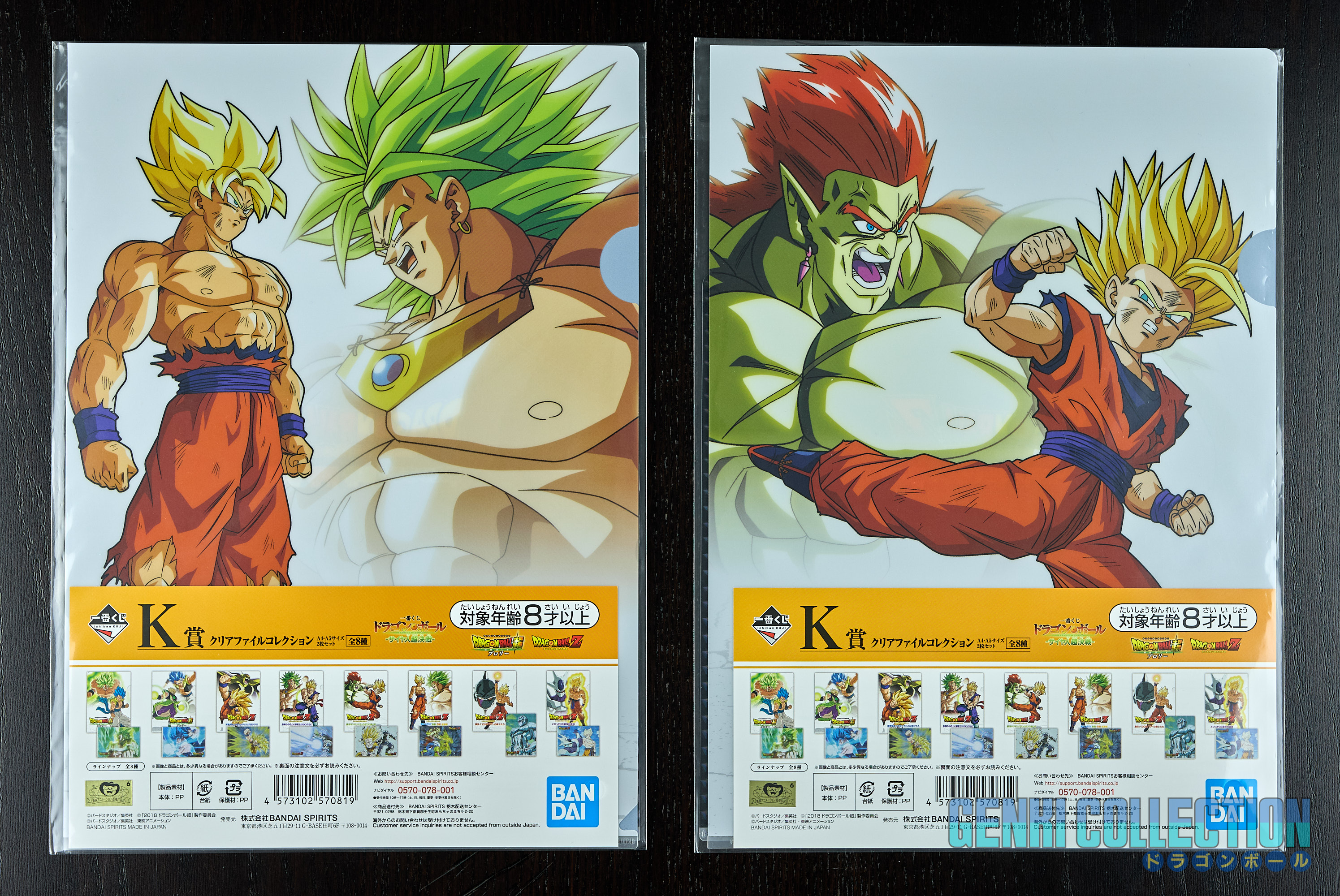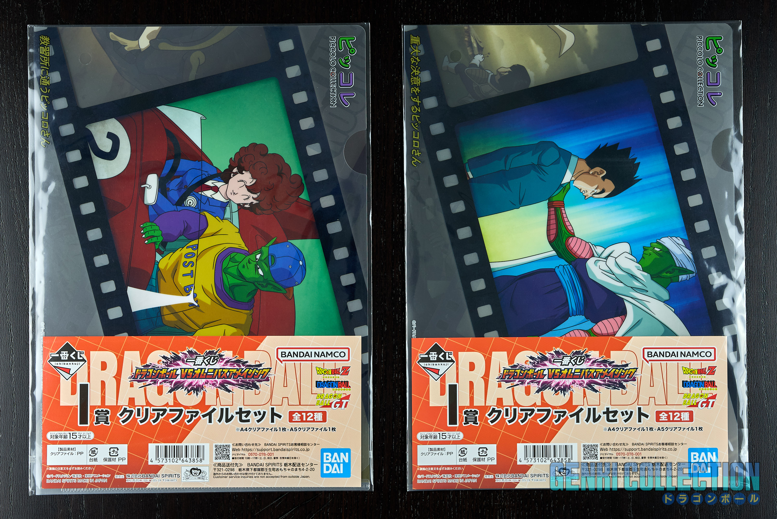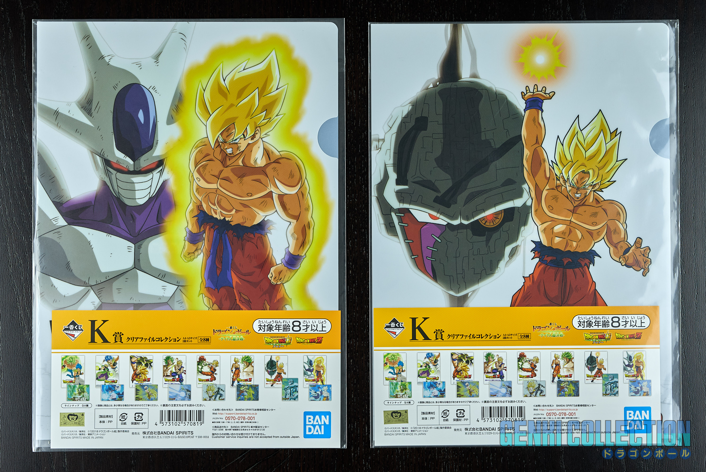 Ensemble de 346 clear files (chemises plastifiées au format A4 ou A5 pour certaines) Dragon Ball composés de 325 clears file répartis sur 20 full sets loteries Ichiban Kuji (2011 à 2024) et 21 clear files indépendants (à l'unité ou "Not for sale"), tous en excellent état dans leurs blisters d'origines (exceptés pour 2 ou 3 d'entre eux). Voici le détail des sets :