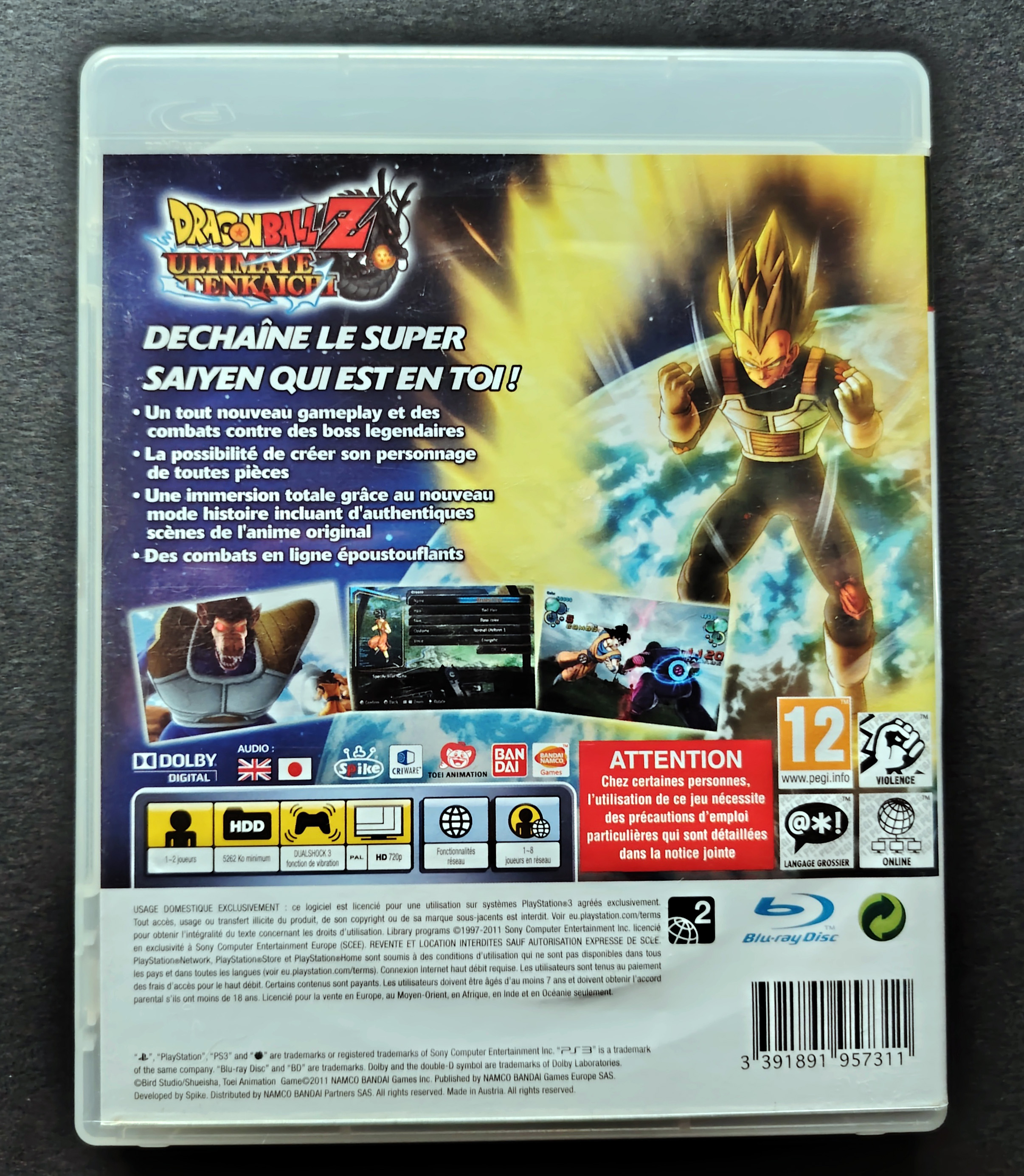 Jeu Playstation 3 Dragon Ball Z : Ultimate Tenkaichi , version Française, développeur Spike, éditeur Namco Bandai, sorti en 2011. La notice est légèrement pliée.