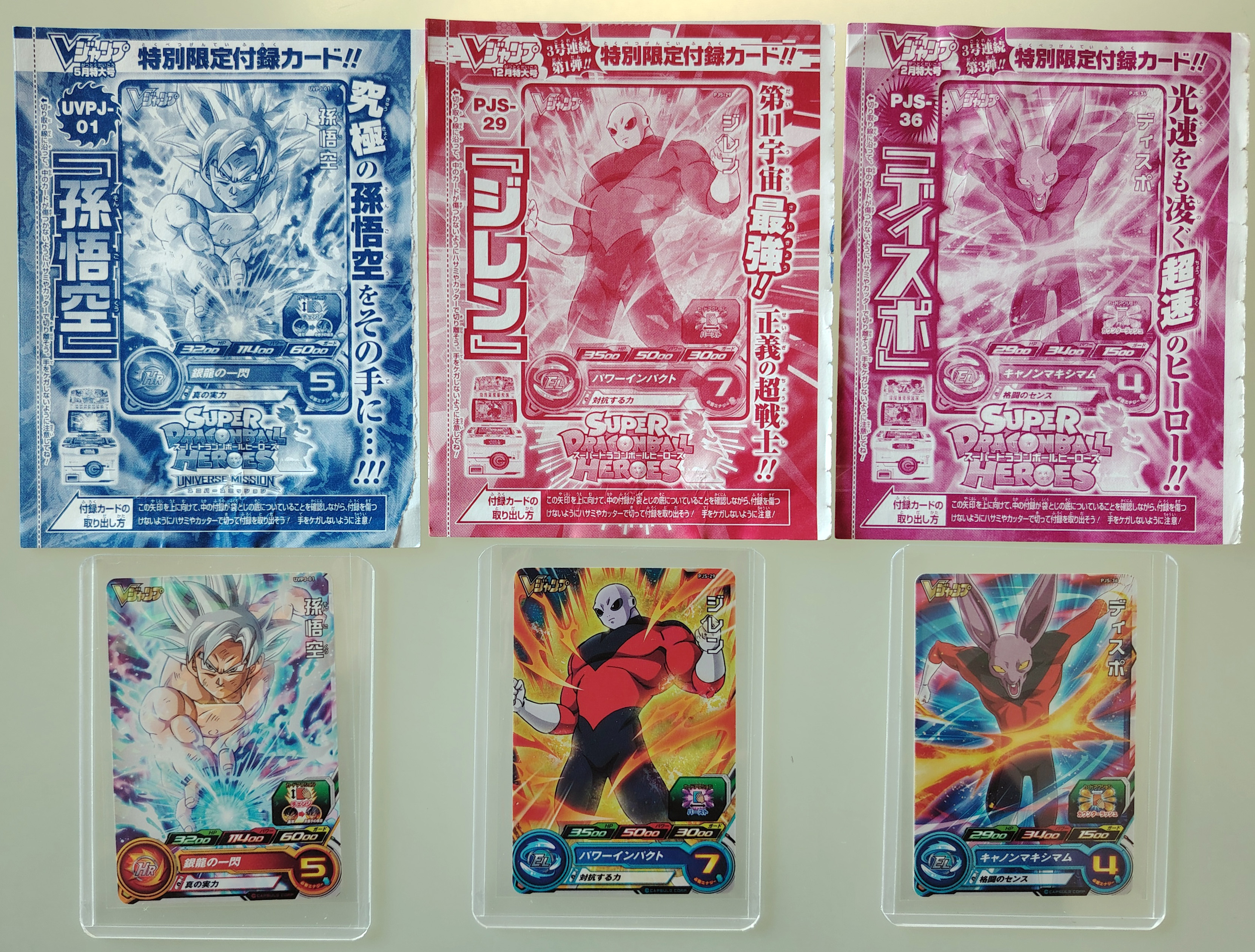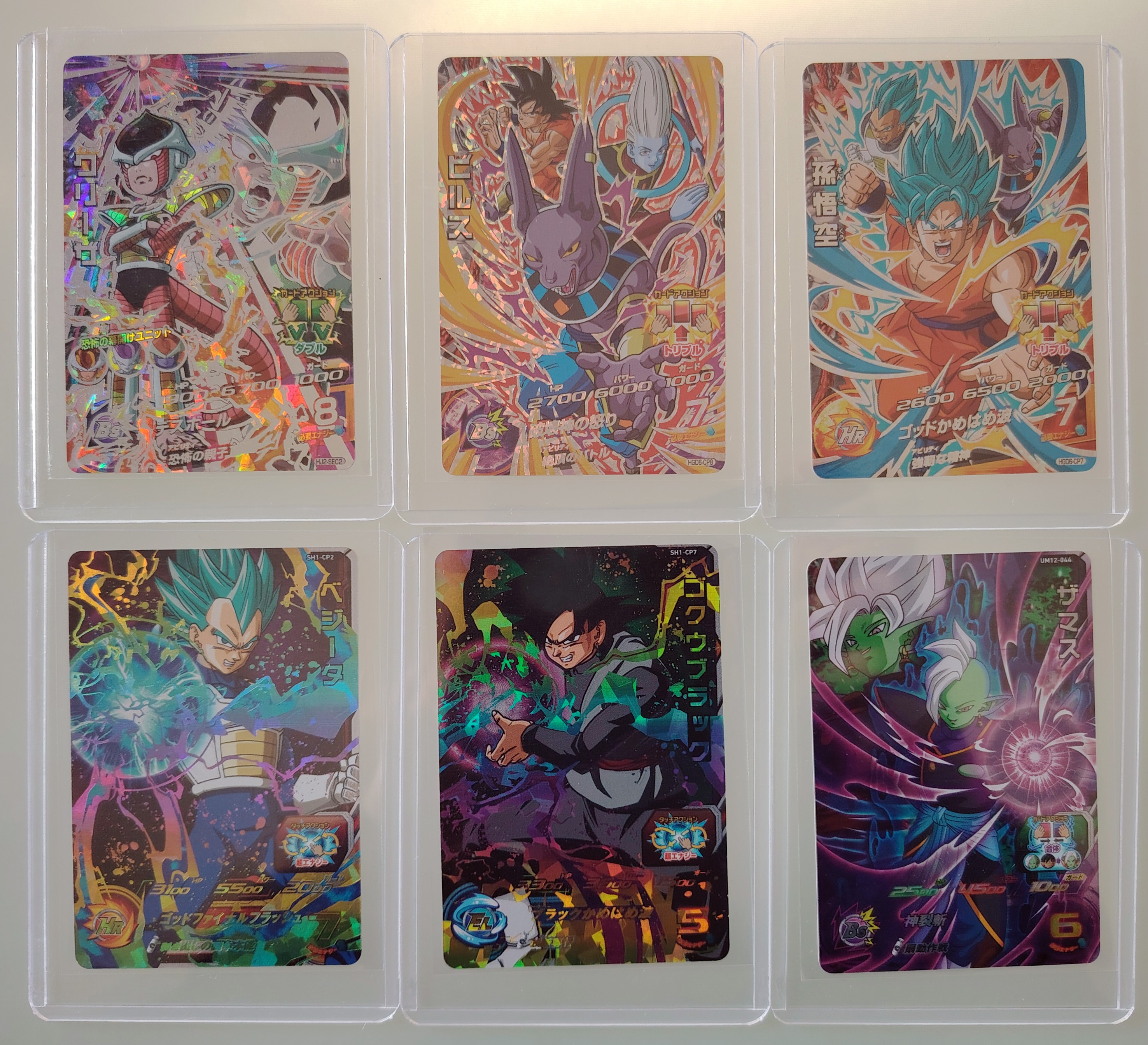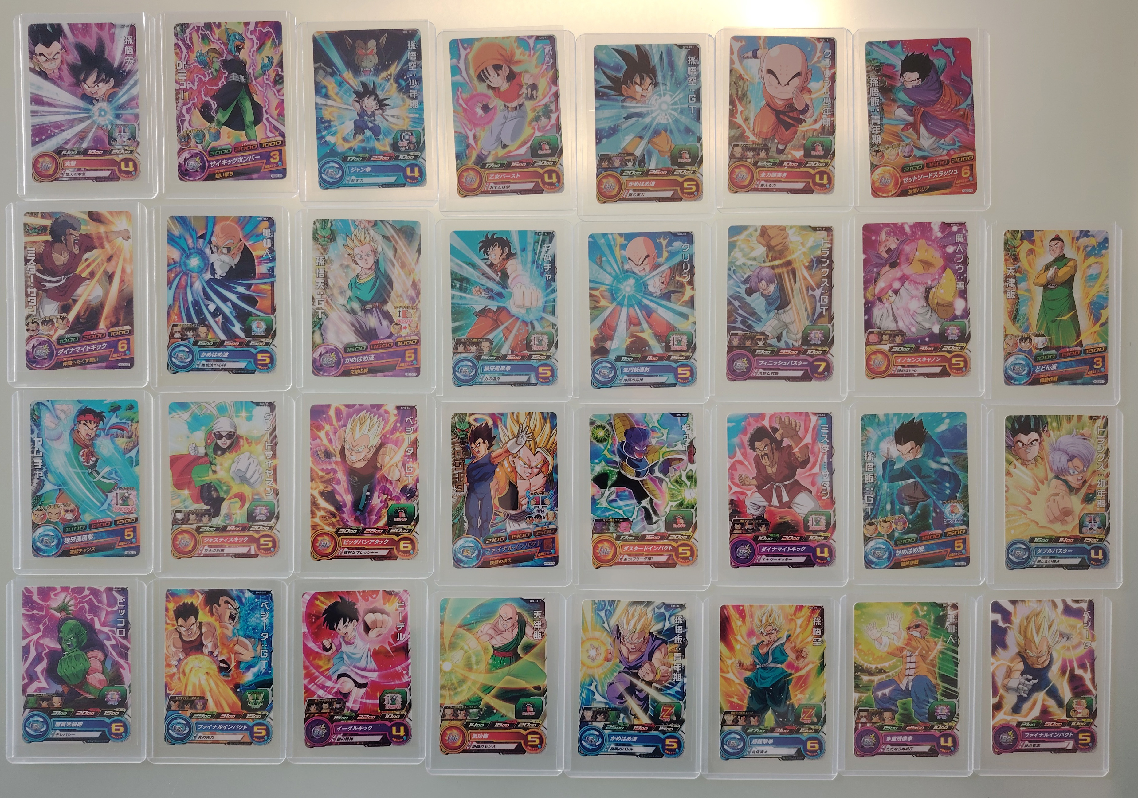 Lot de 53 cartes Dragon Ball Heroes et Super Dragon Ball Heroes dont 16 prisms, 3 cartes V Jump avec leur pochettes respectives, 4 cartes avec leur paquet de bonbon + 1 mini classeur avec feuillets neufs + 1 paquet de Bonbons (scellé) avec Booster (ouvert).