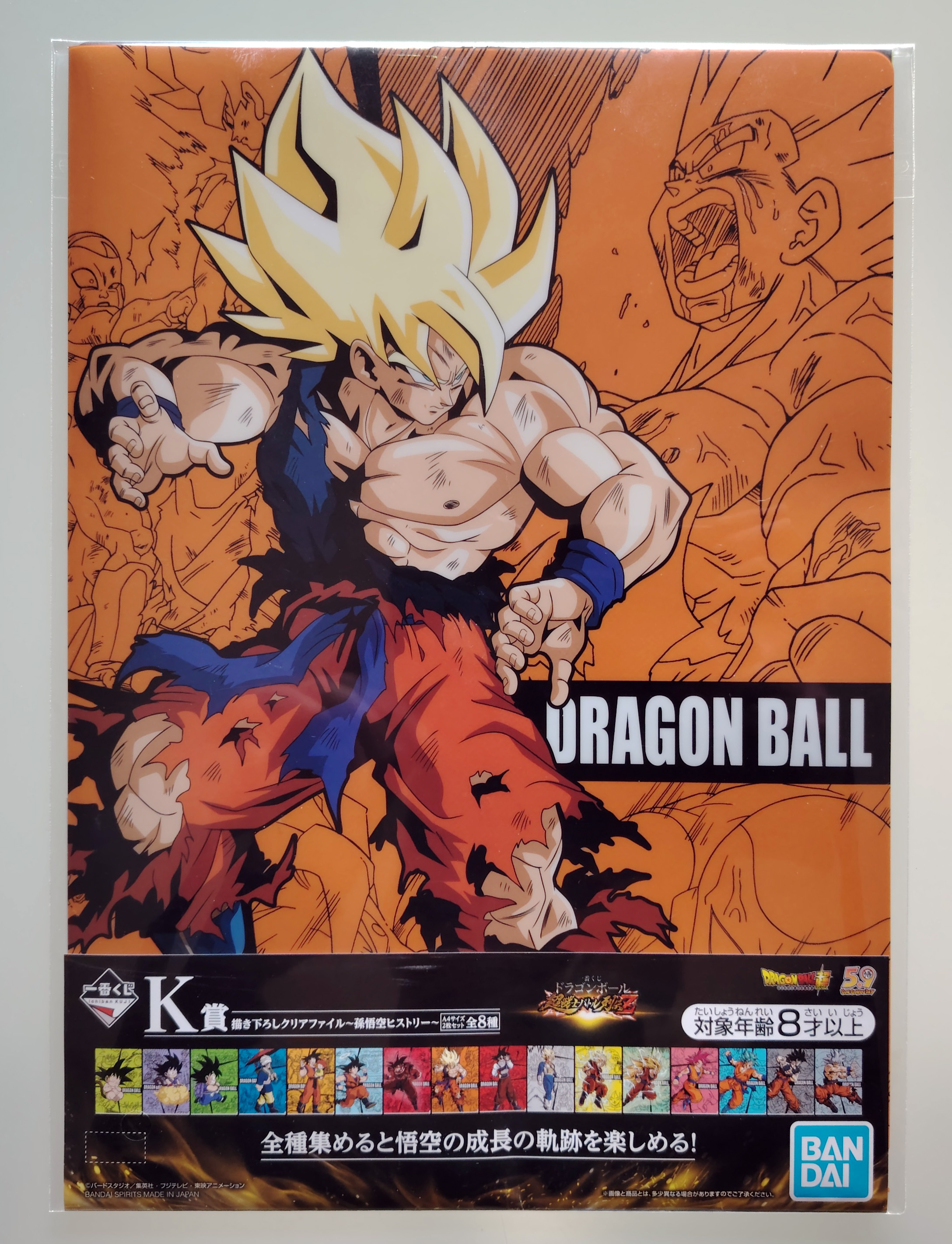 Lot de 8 produits de différentes Ichiban Kuji Dragon Ball Z contenant 4 clear files don 3 "the 20th Film" (scellés) et un clear file Chô-senshi battle retsuden (scellé), une serviette "Dragon Ball VS Omnibus Z", un étui à masque Dragon Ball VS Omnibus Z (scellé), une petite assiette "Chronique des combats des super guerriers" (boîte ouverte), une figurine Gohan Super Saiyan 2 "Chronique des combats des super guerriers" (sans boîte).