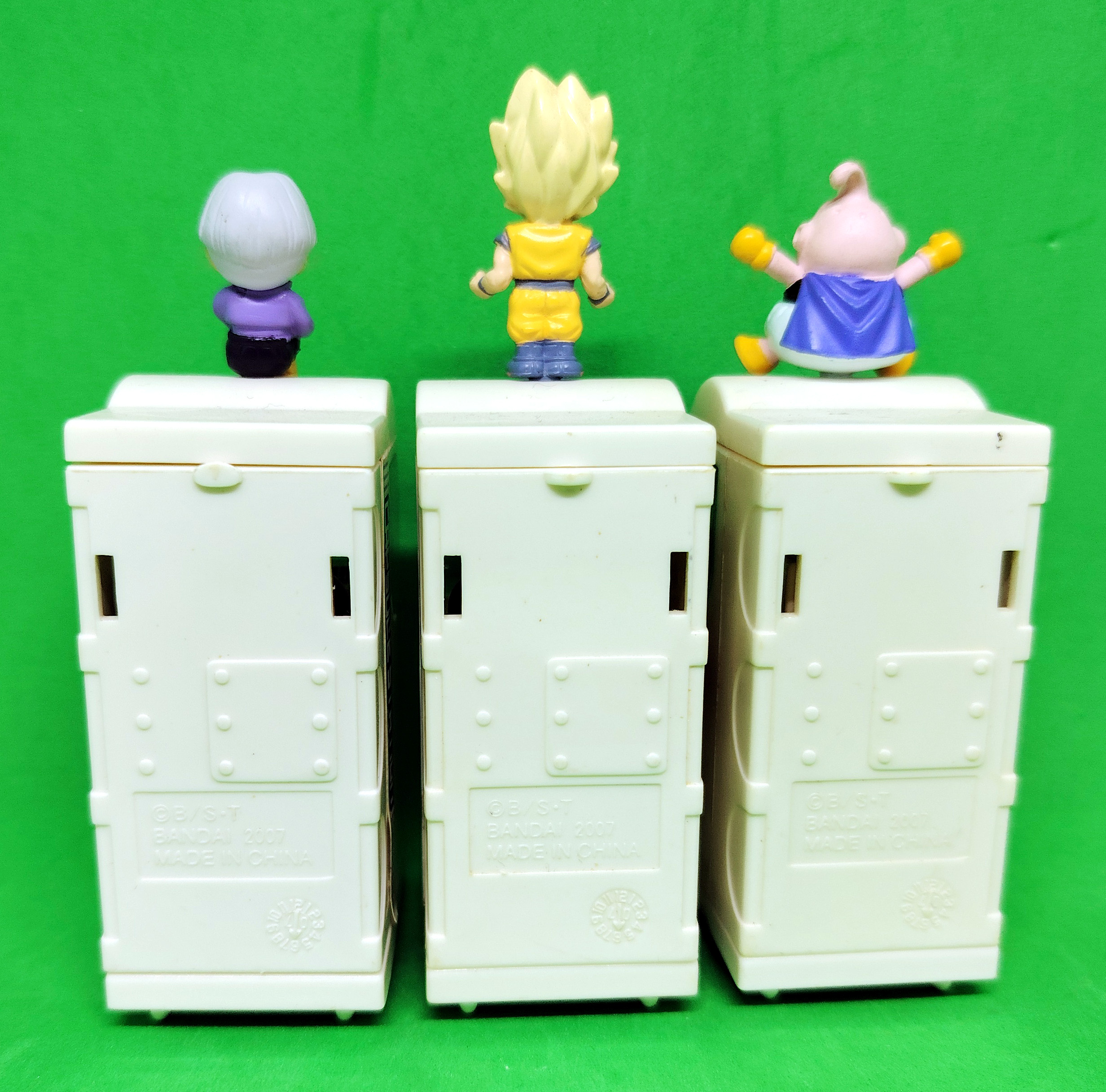 Lot de 3 gashapons Dragon Ball Z Capsule Station représentant Buu, Goku super Saiyan et Trunks. Chacune dispose de petites boules, tirettes fonctionnelles, sortie en 2007 par Bandai.