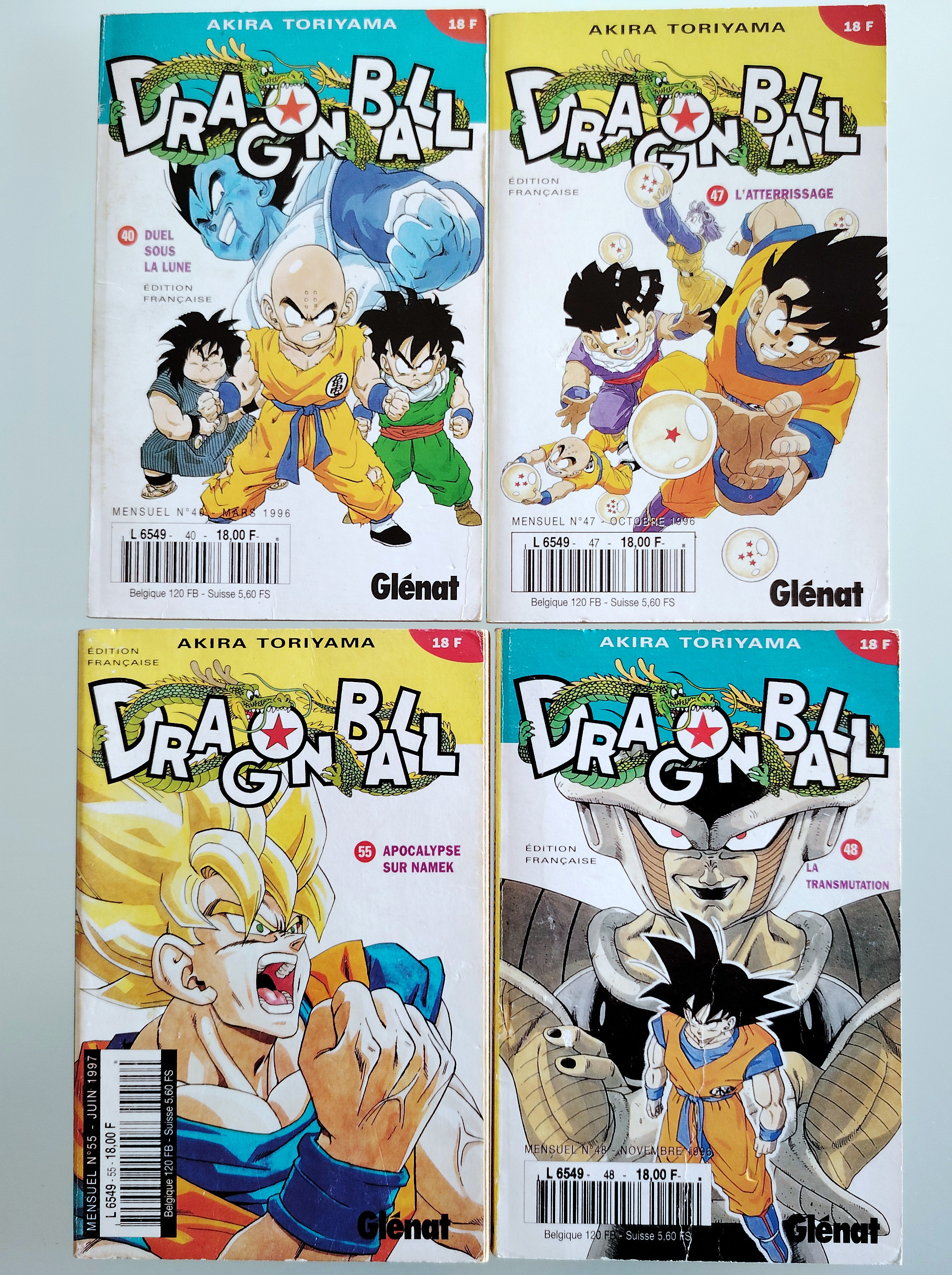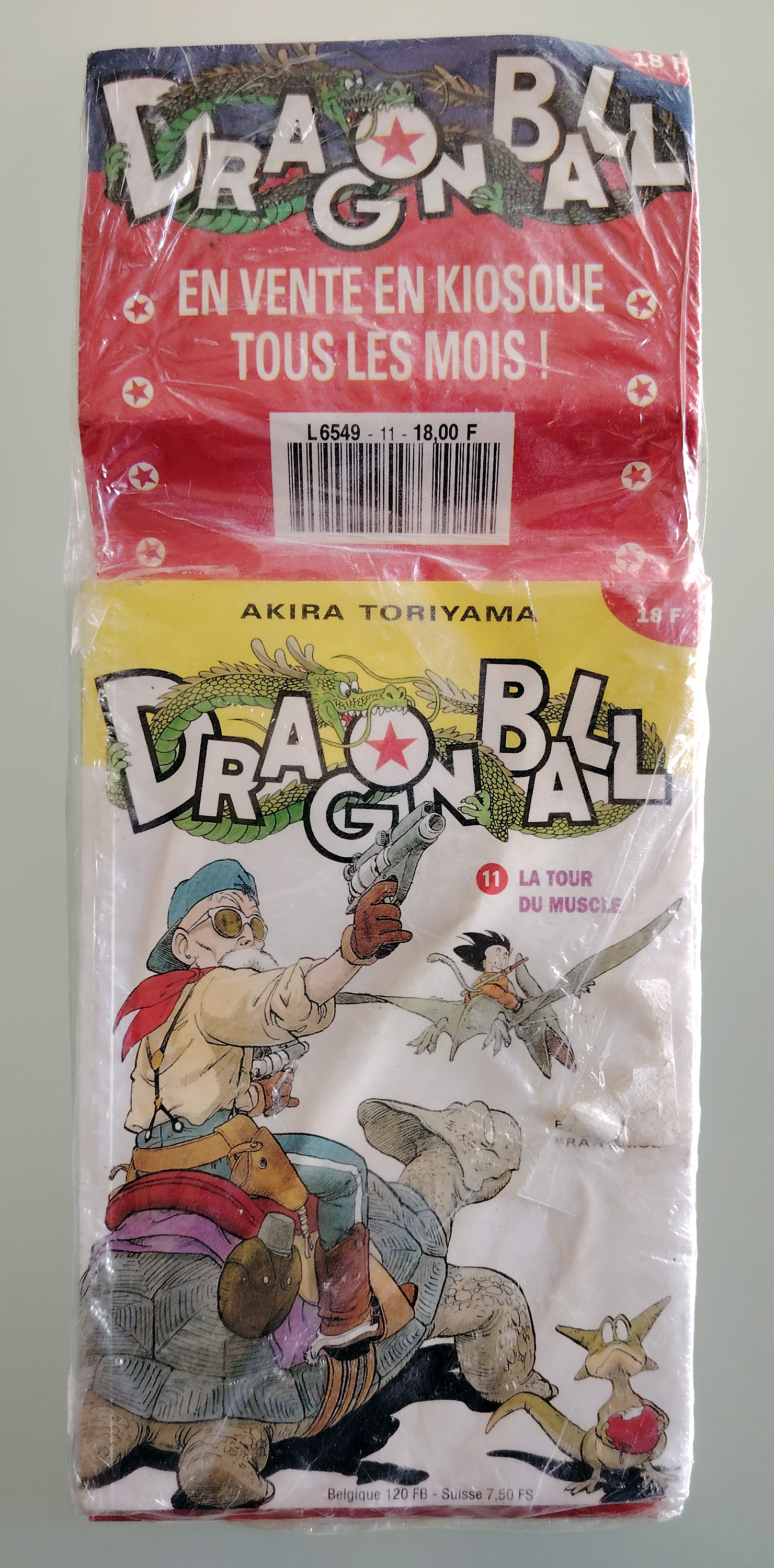 Lot de 11 mangas Dragon Ball éditions mensuelles en kiosque, dont le tome 11 (1993) est encore sous blister avec support cartonné (quelques zones ouvertes à signaler sur l'emballage, mais jamais déballé).