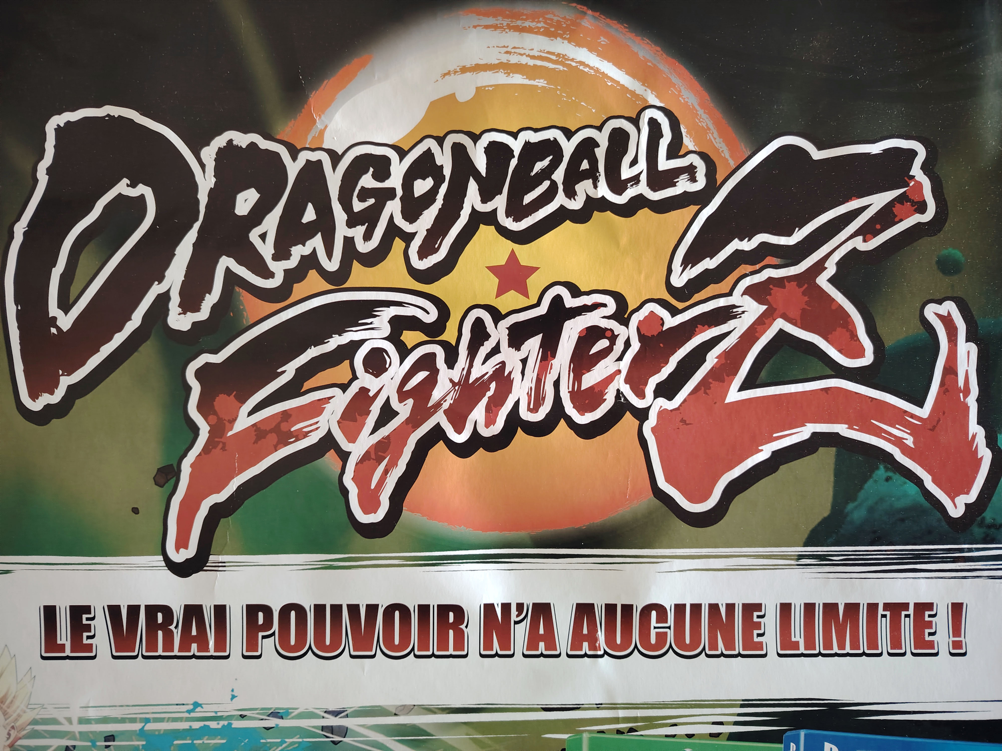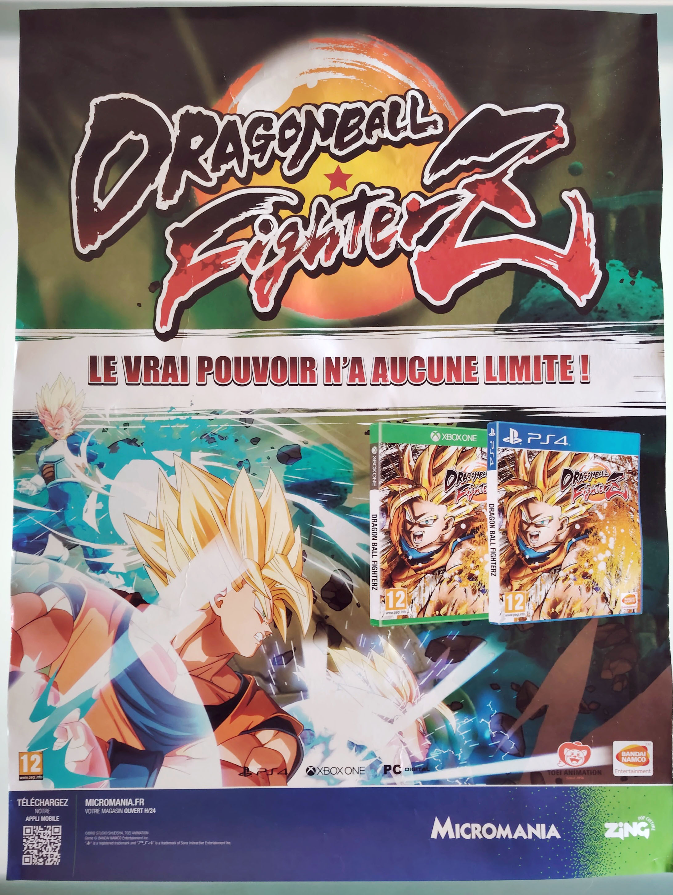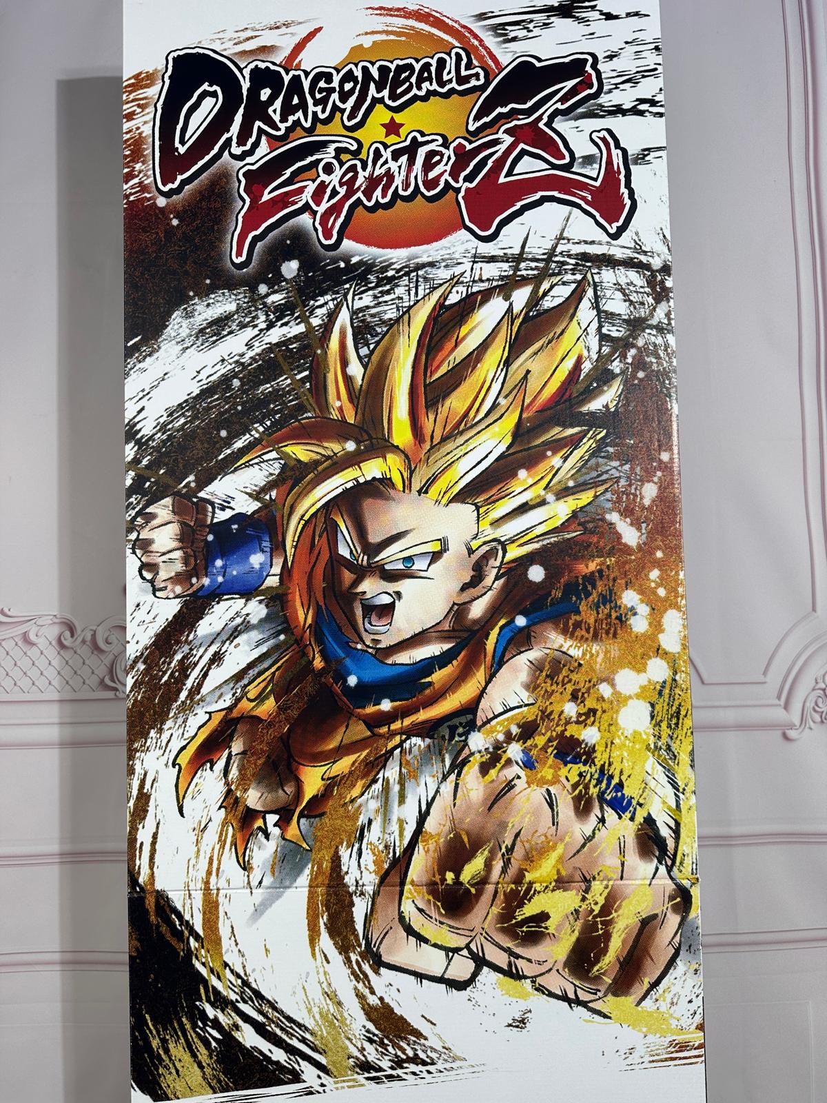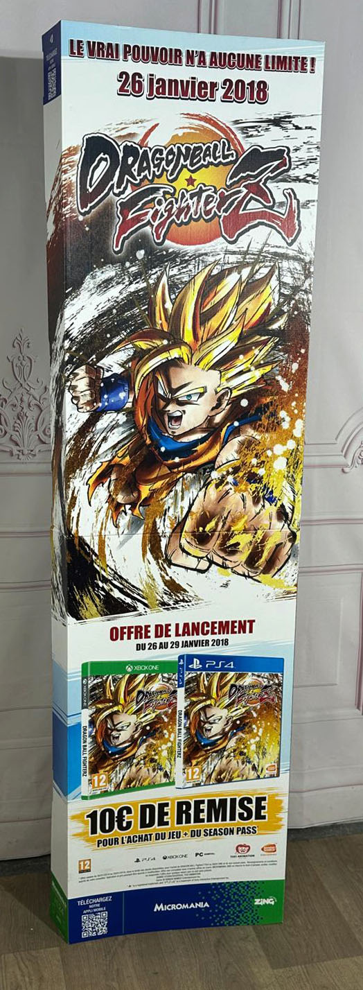Ensemble comprenant un standing (PLV) promotionnel de Dragon Ball FighterZ de dimension 170cm x 45cm et un poster de dimension 60cm x 80cm, sortis pour la promotion du jeu Dragon Ball FighterZ en 2018 chez l'enseigne Micromania. À noter quelques plis et défauts sur le poster.