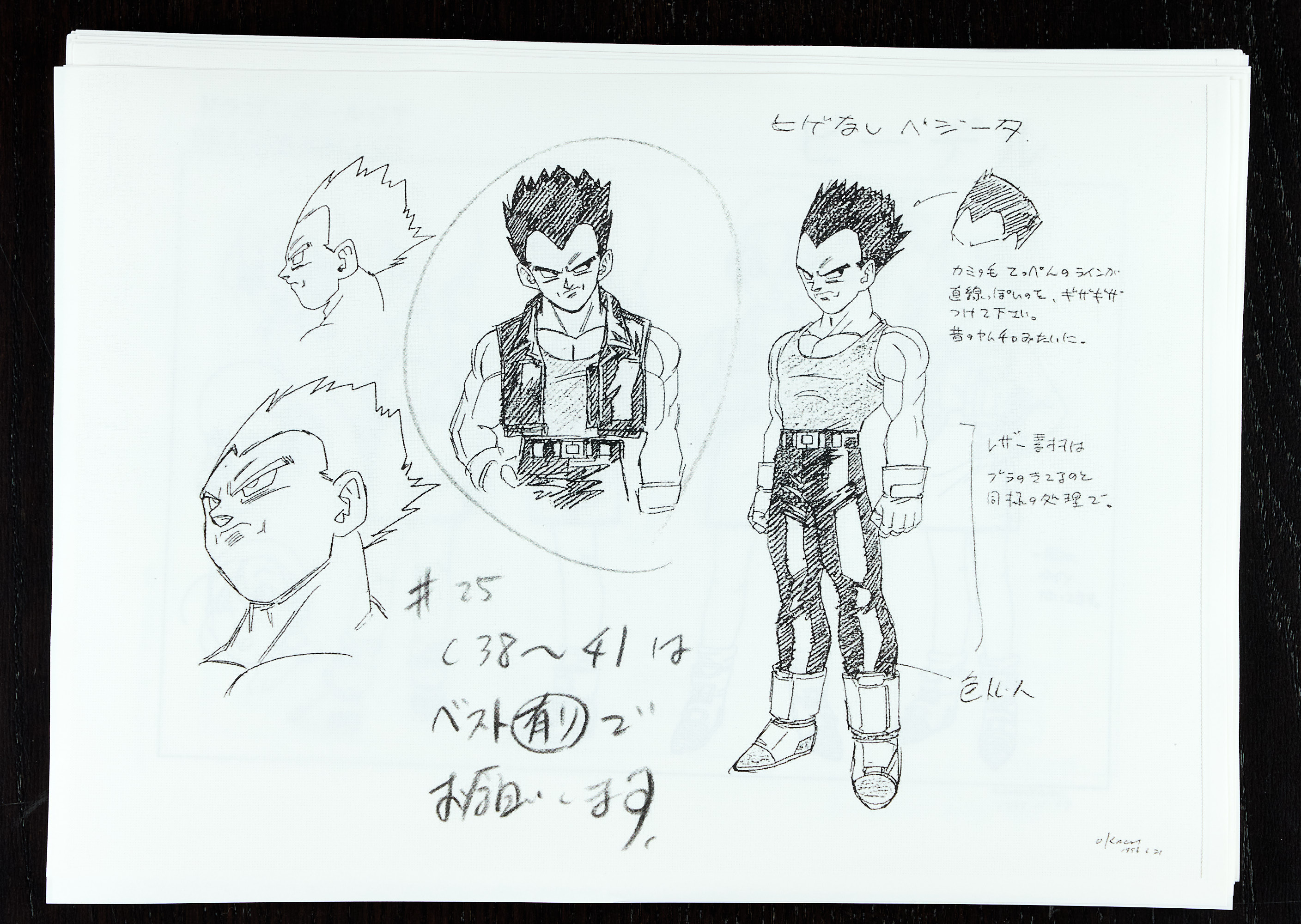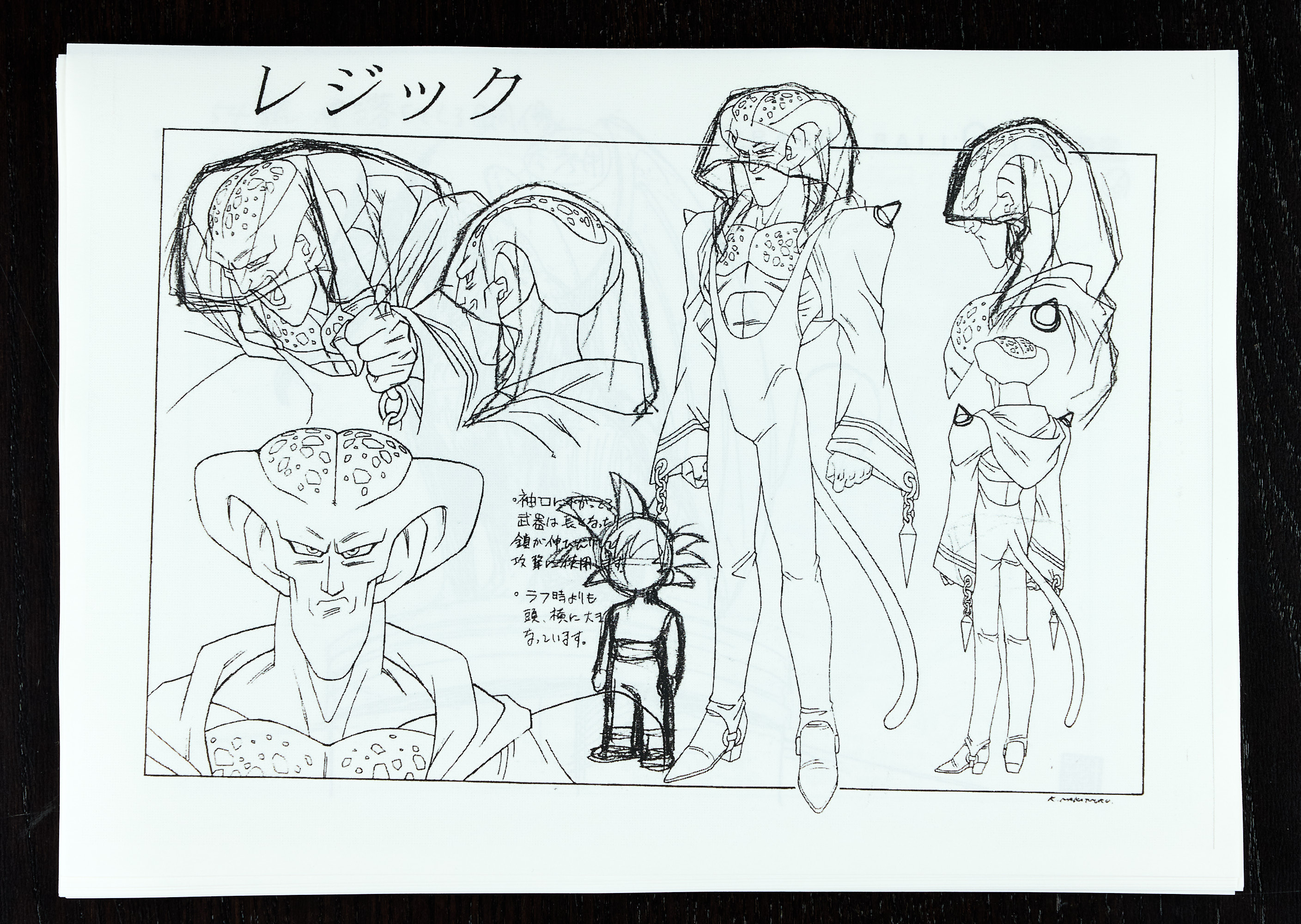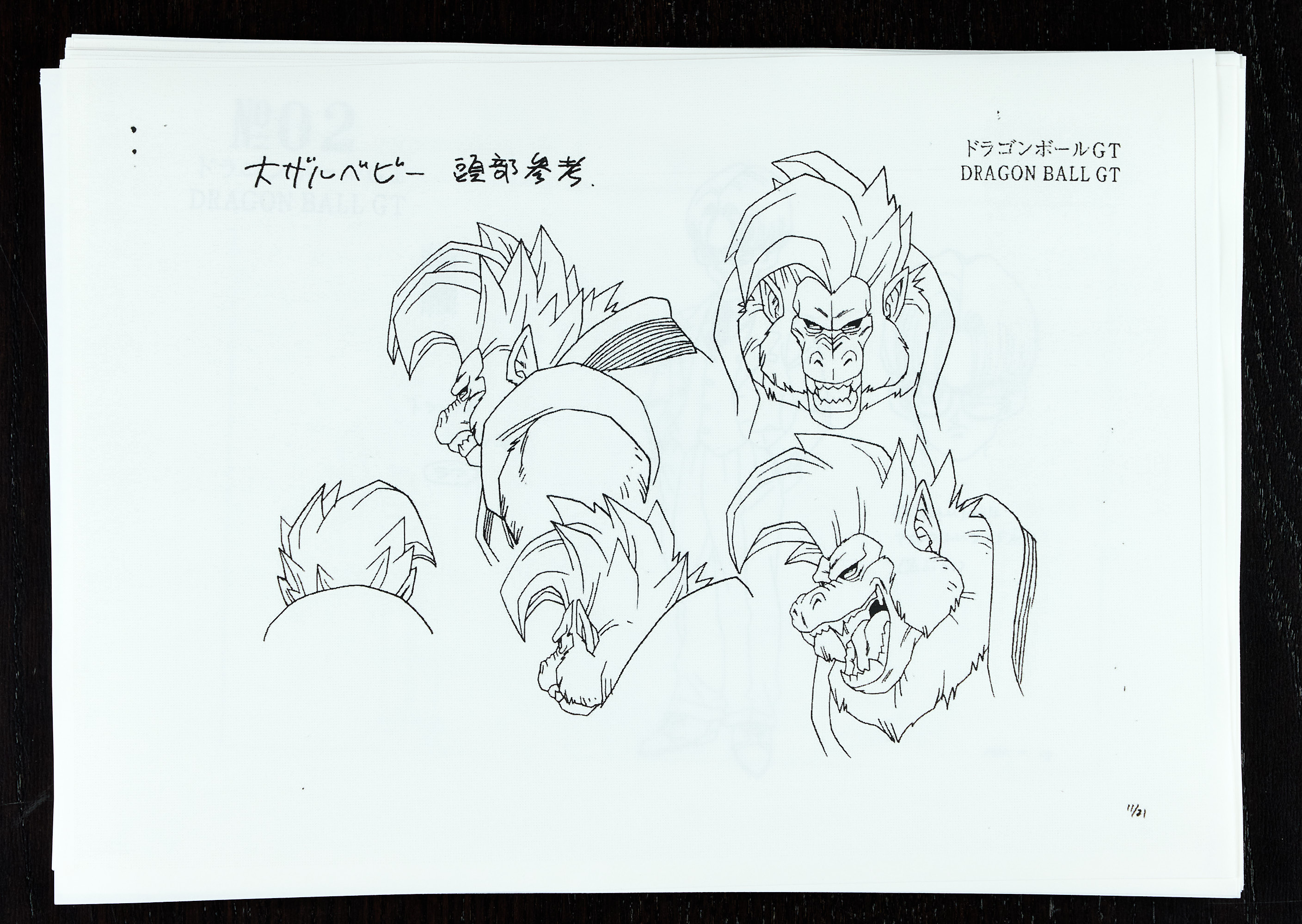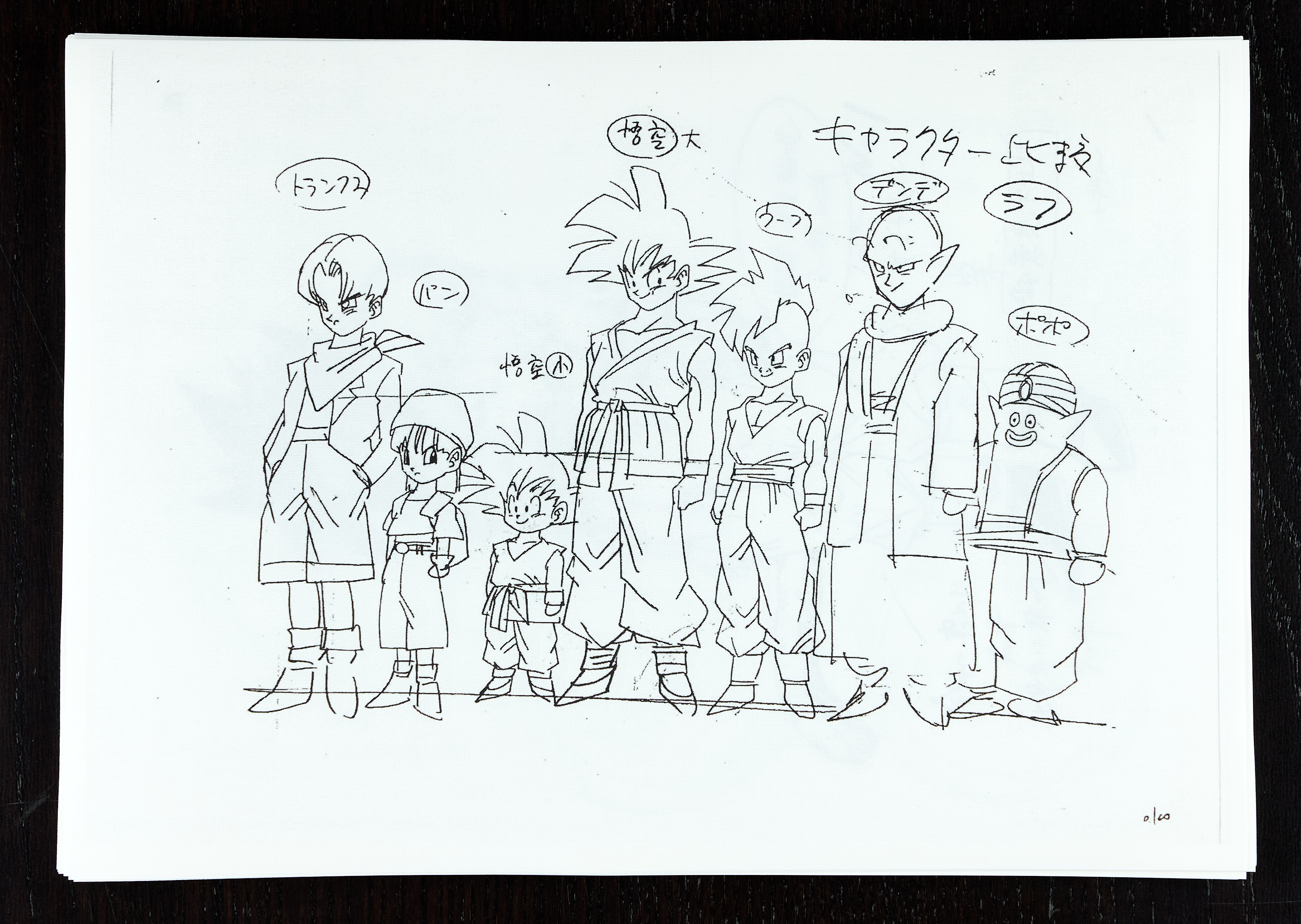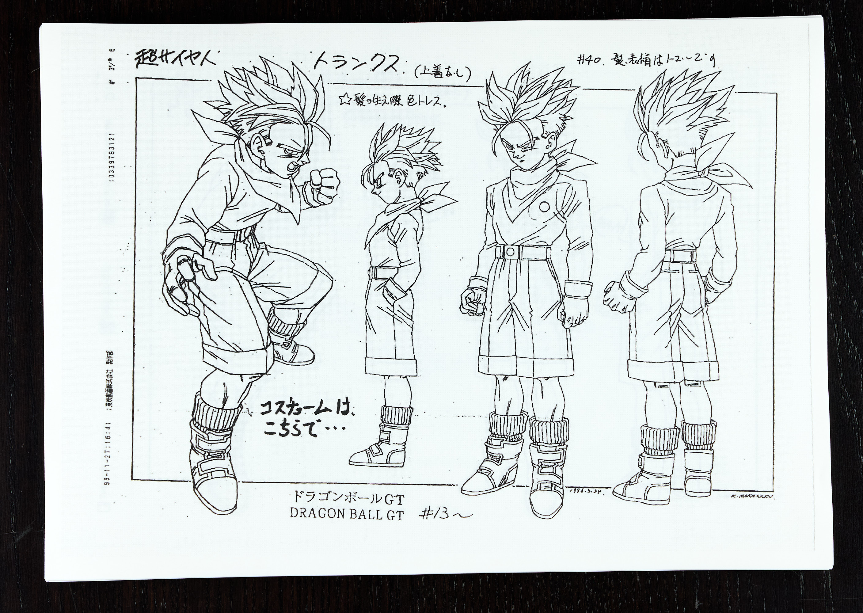 Ensemble de 87 copies de settei (model sheets) format A4 (21x29,7cm) issus de la série Dragon Ball GT, réalisés par divers animateurs talentueux comme Tadayoshi Yamamuro et Katsuyoshi Nakatsuru, utilisés comme modèles de référence pour les studios Toei Animation. Dans le lot vous trouverez des croquis préparatoires des personnages, des décors, des véhicules et des accessoires utilisés dans la série.