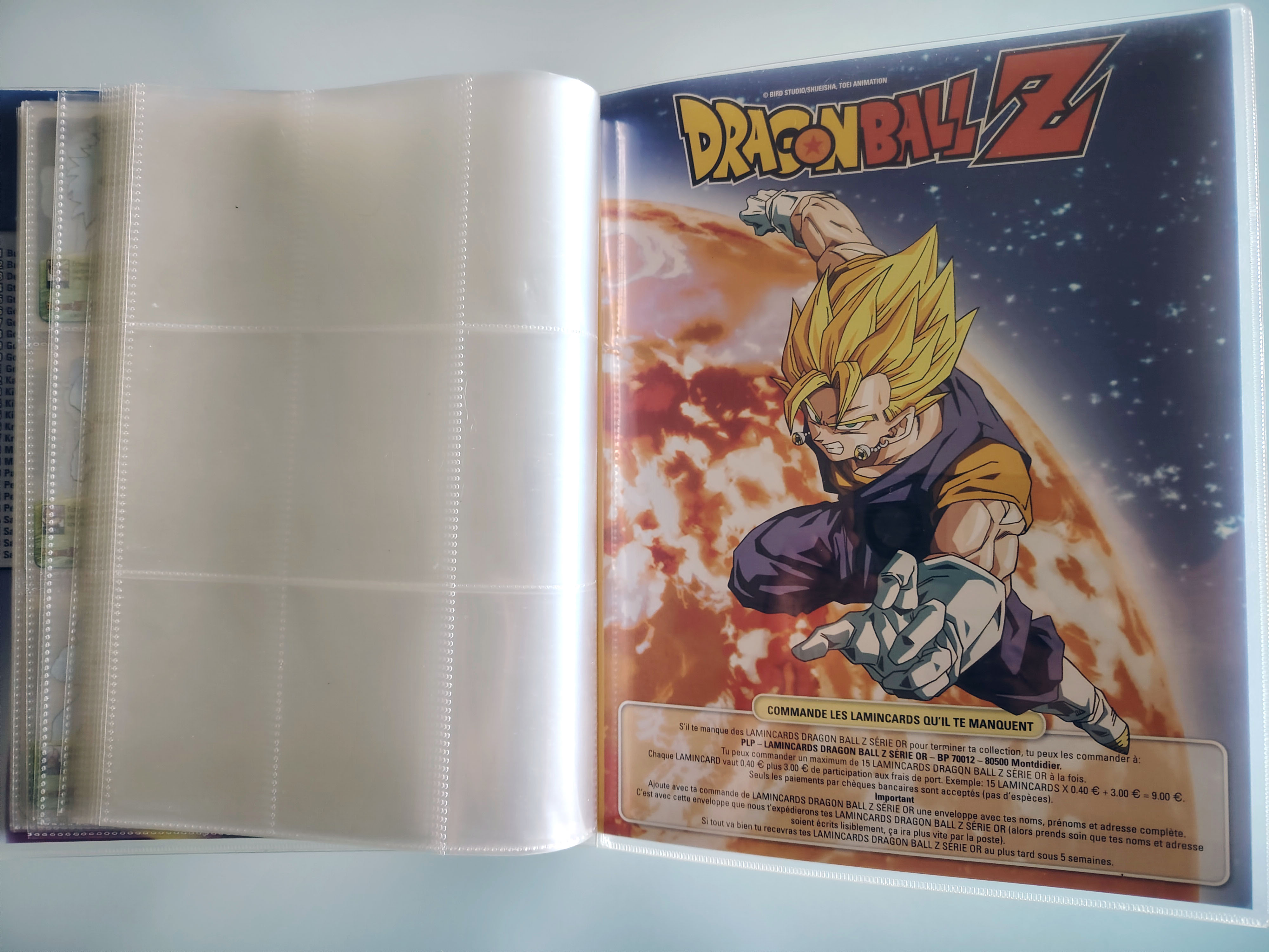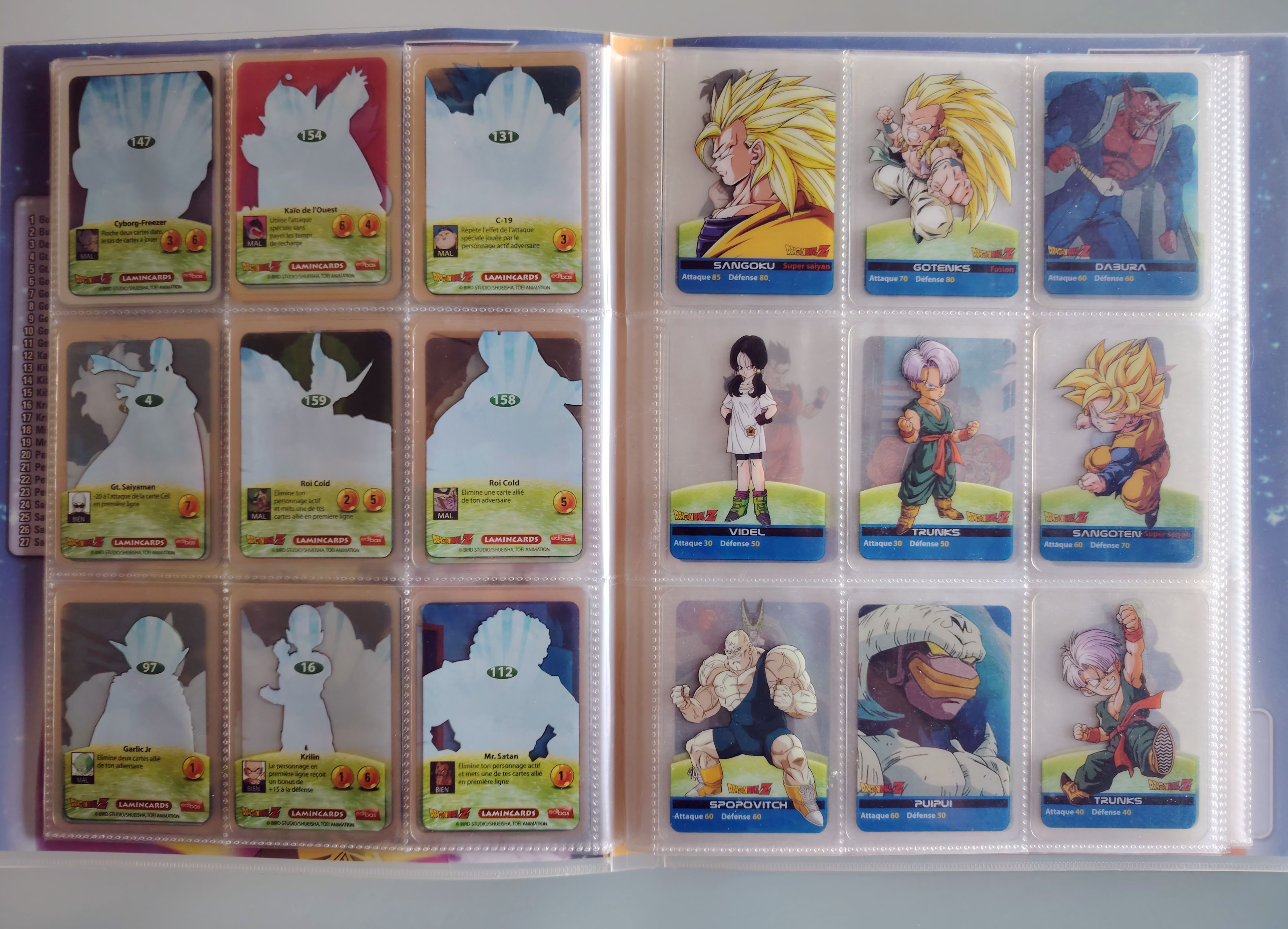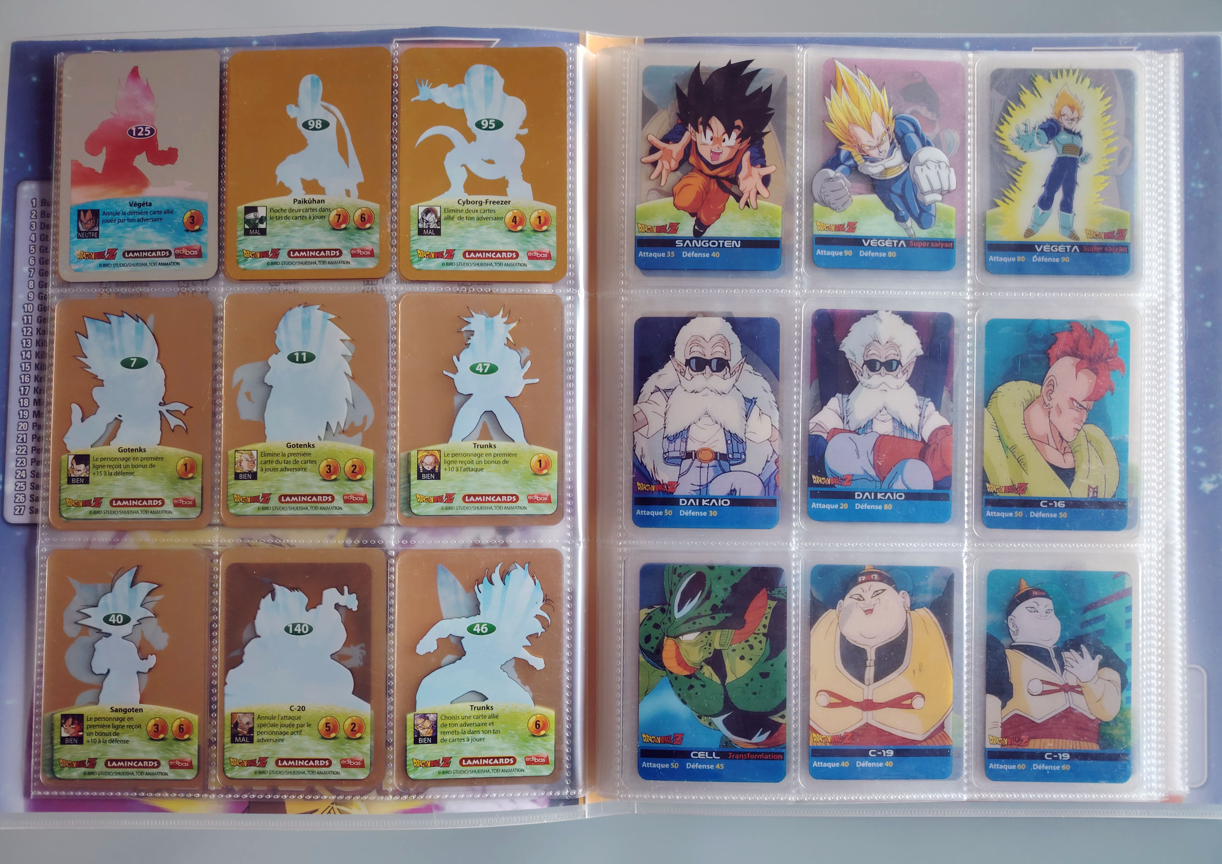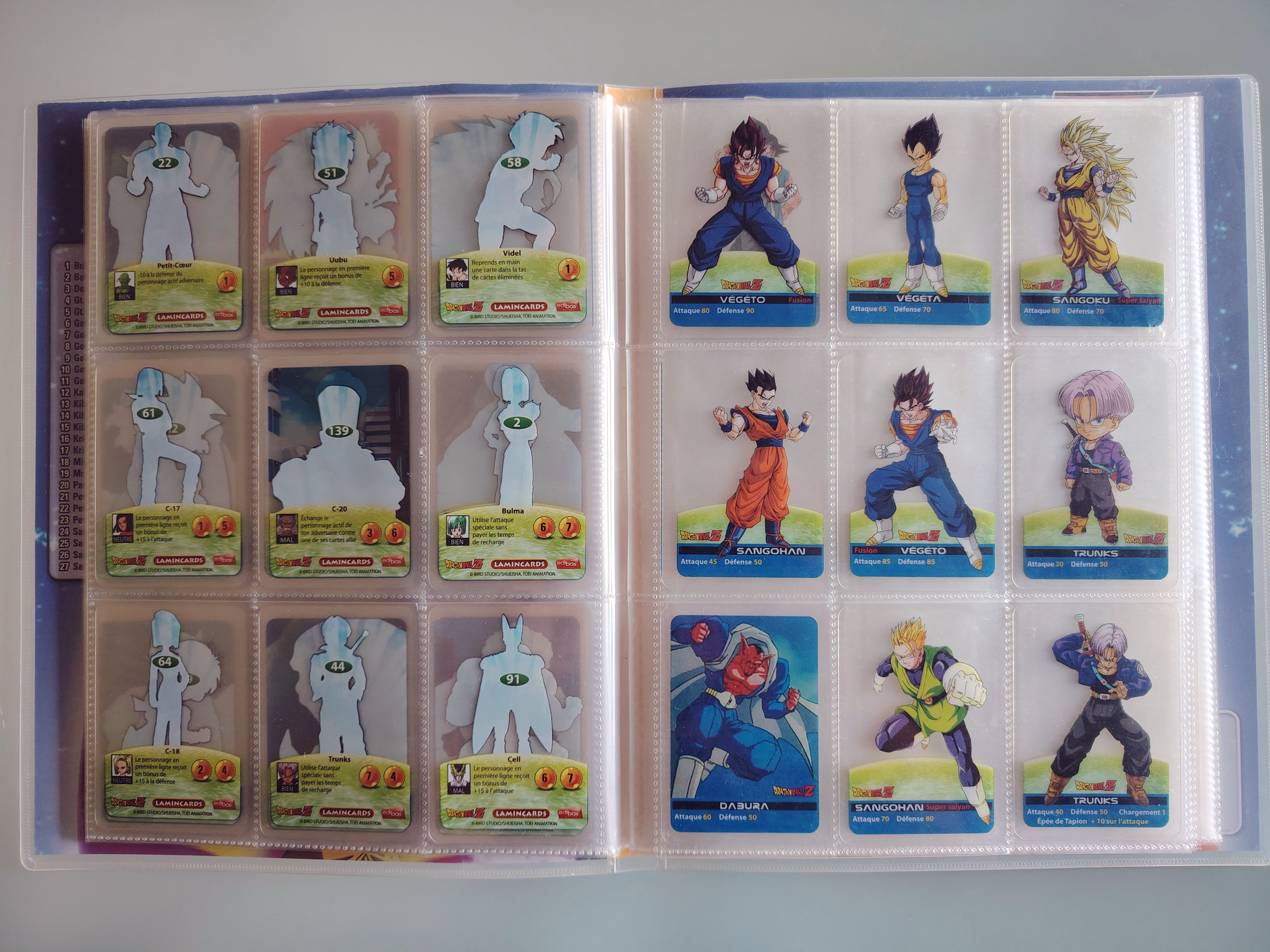 Lot de 62 cartes Dragon Ball Z Lamincards et le classeur. 10 carte dorées, 1 carte argentée et 51 cartes transparentes. À noter certaines cartes peuvent avoir des micro rayures ou des traces. Le classeur présente également des traces et micro rayures. Sorties en 2008 et 2009 par Edibas.