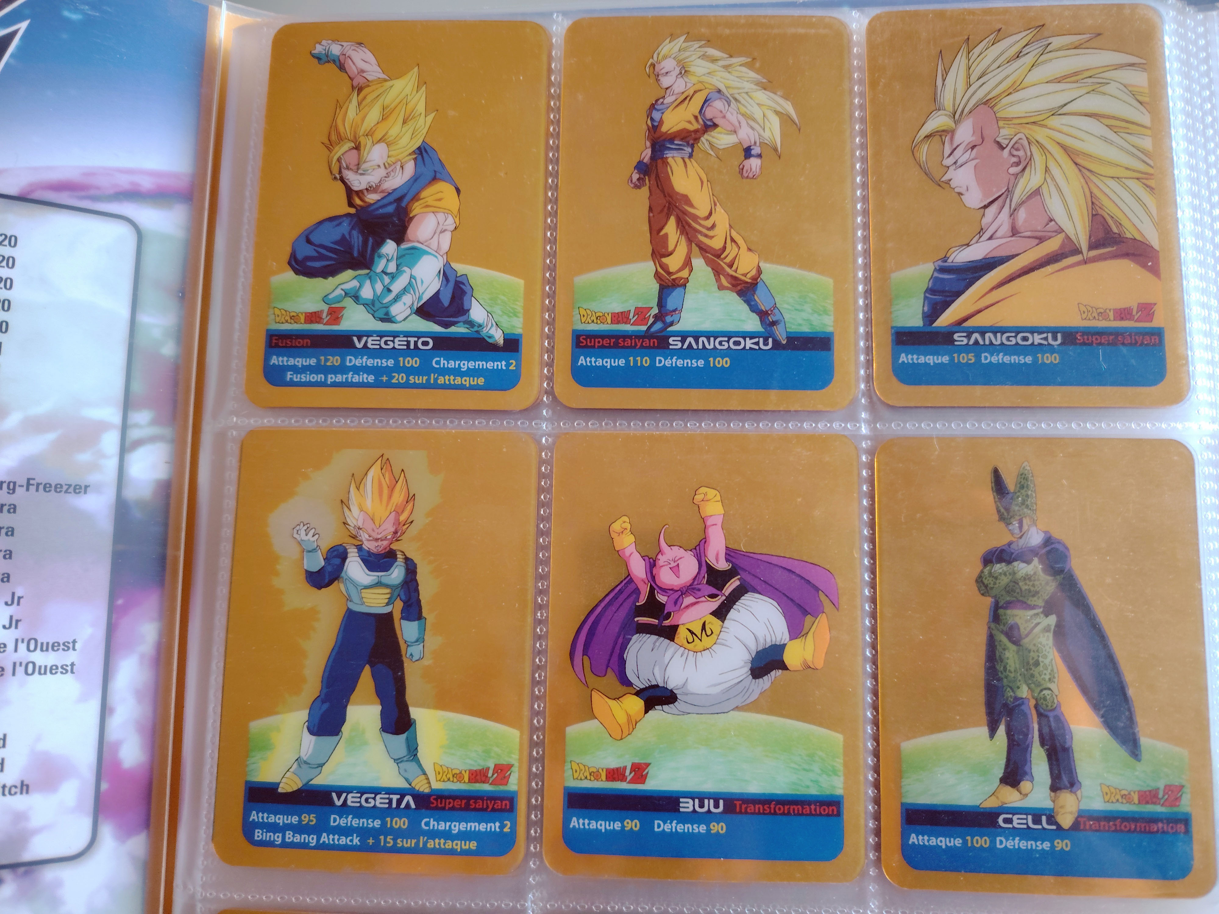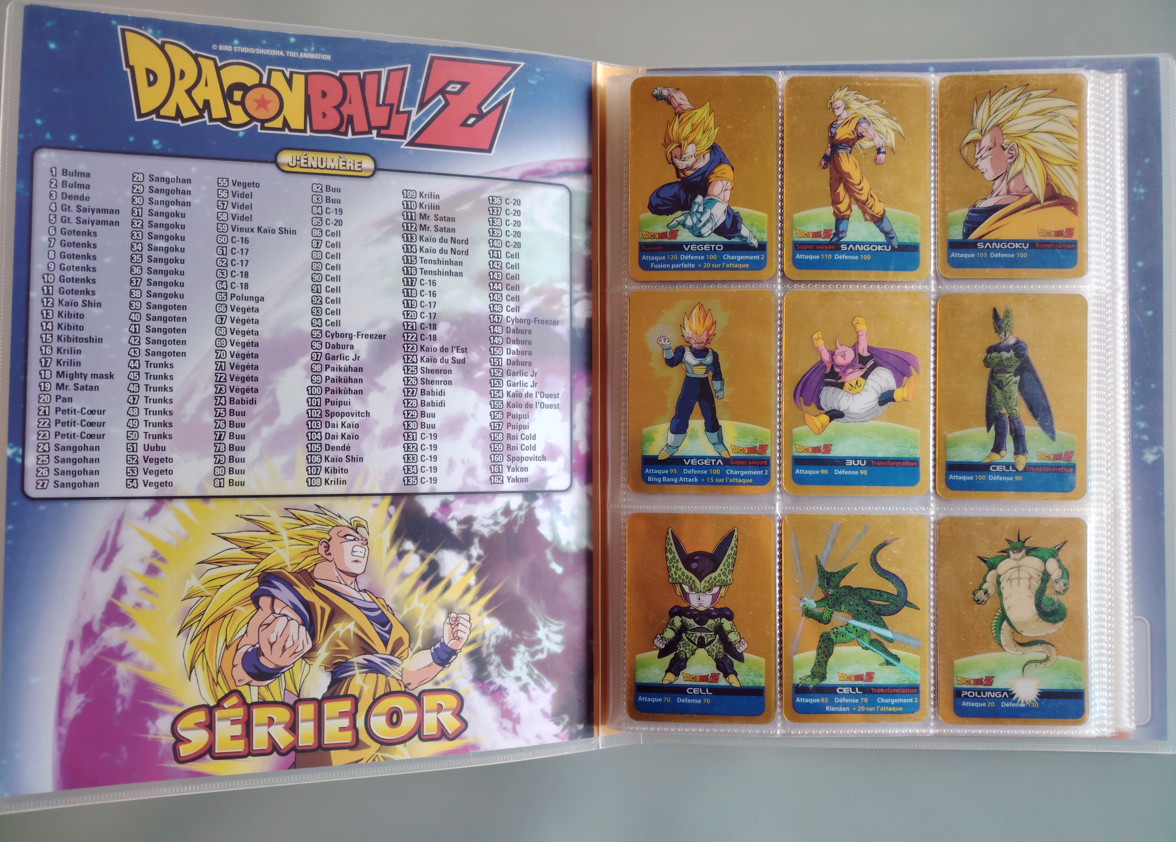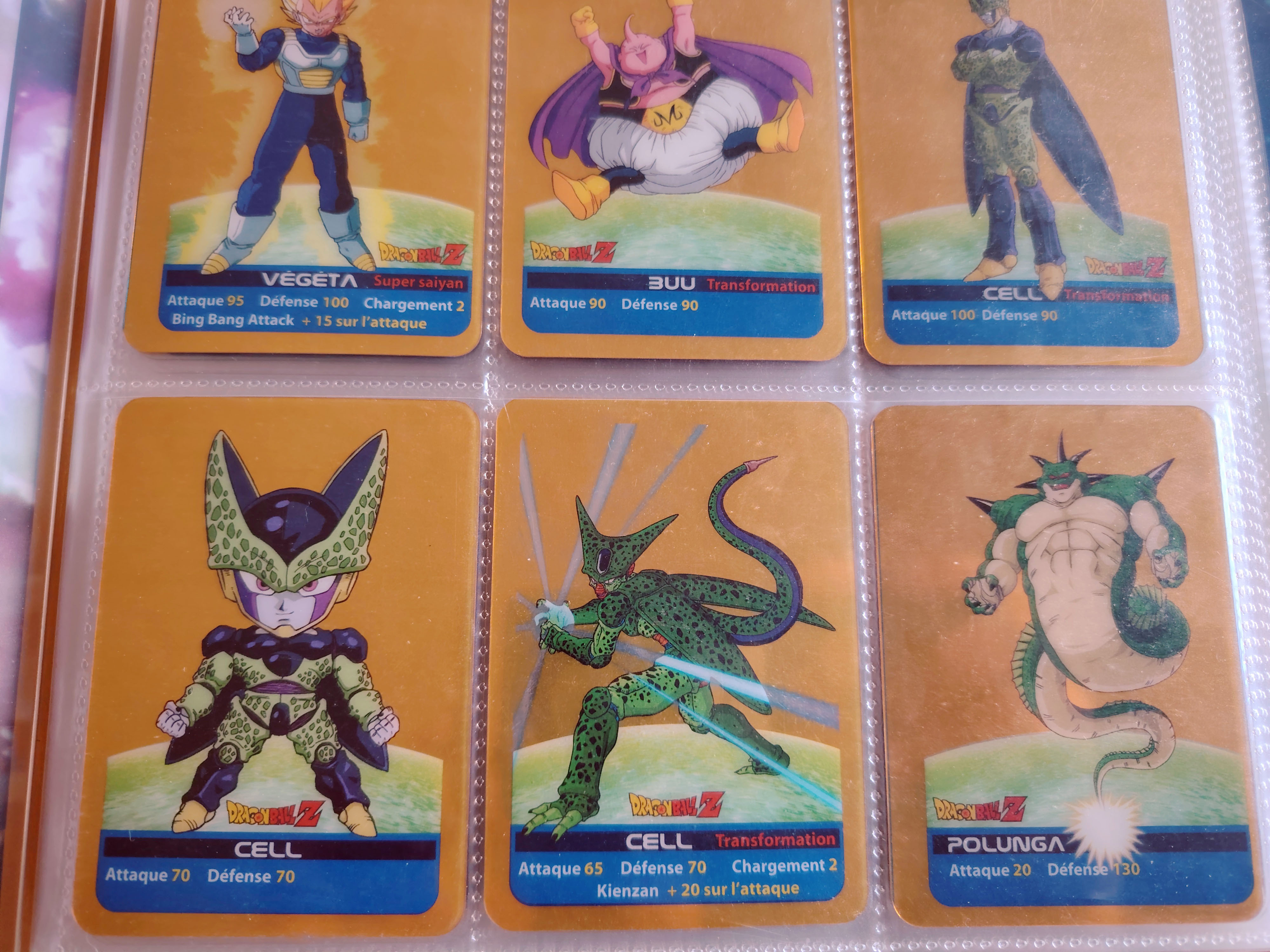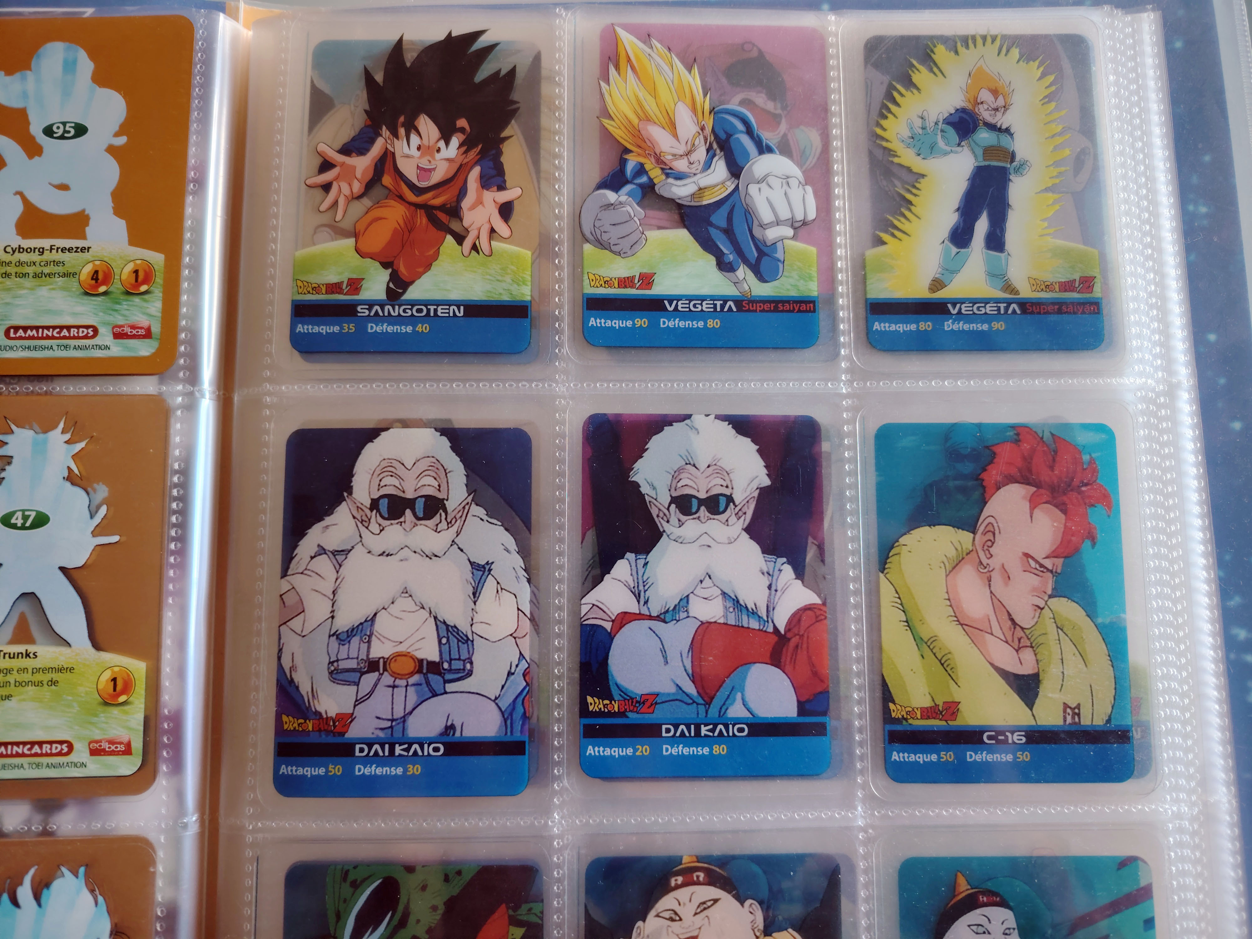 Lot de 62 cartes Dragon Ball Z Lamincards et le classeur. 10 carte dorées, 1 carte argentée et 51 cartes transparentes. À noter certaines cartes peuvent avoir des micro rayures ou des traces. Le classeur présente également des traces et micro rayures. Sorties en 2008 et 2009 par Edibas.