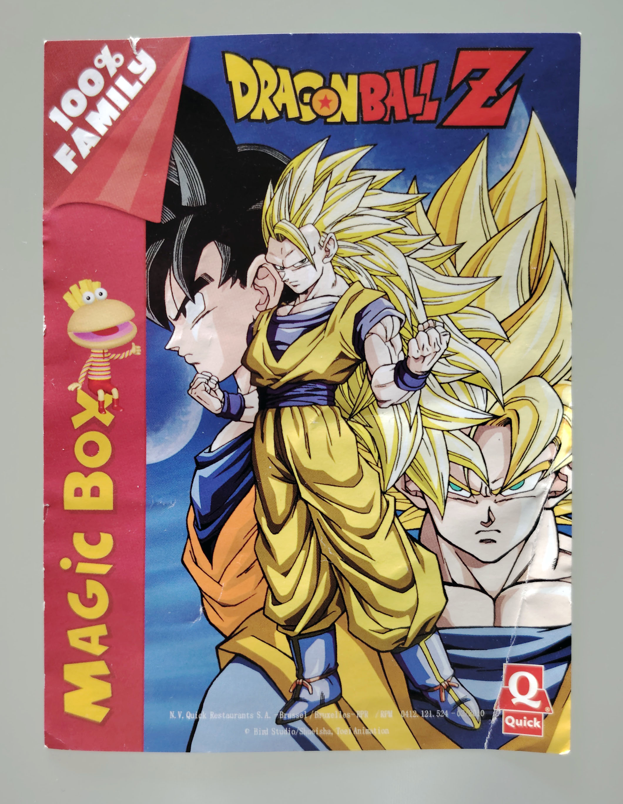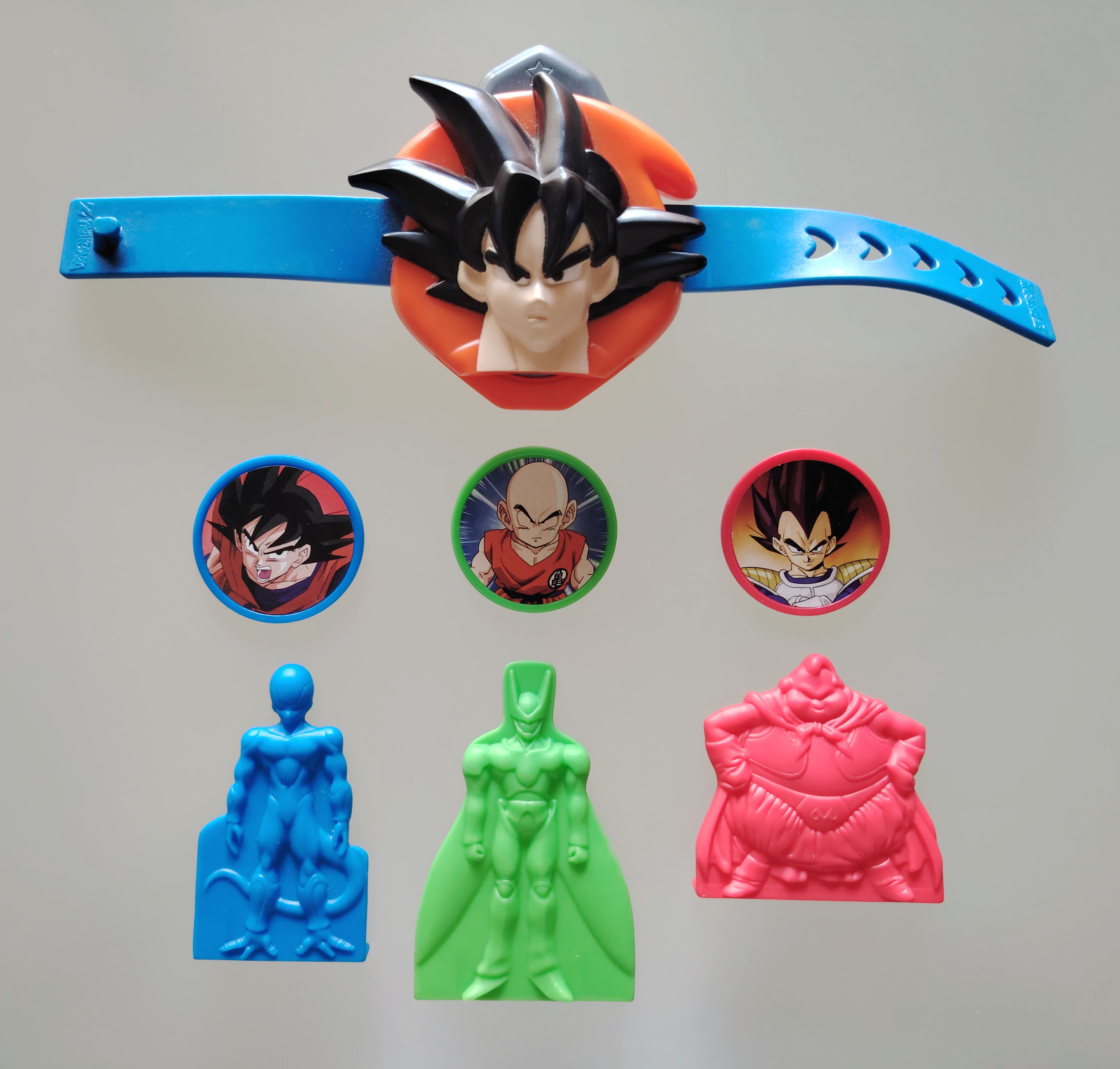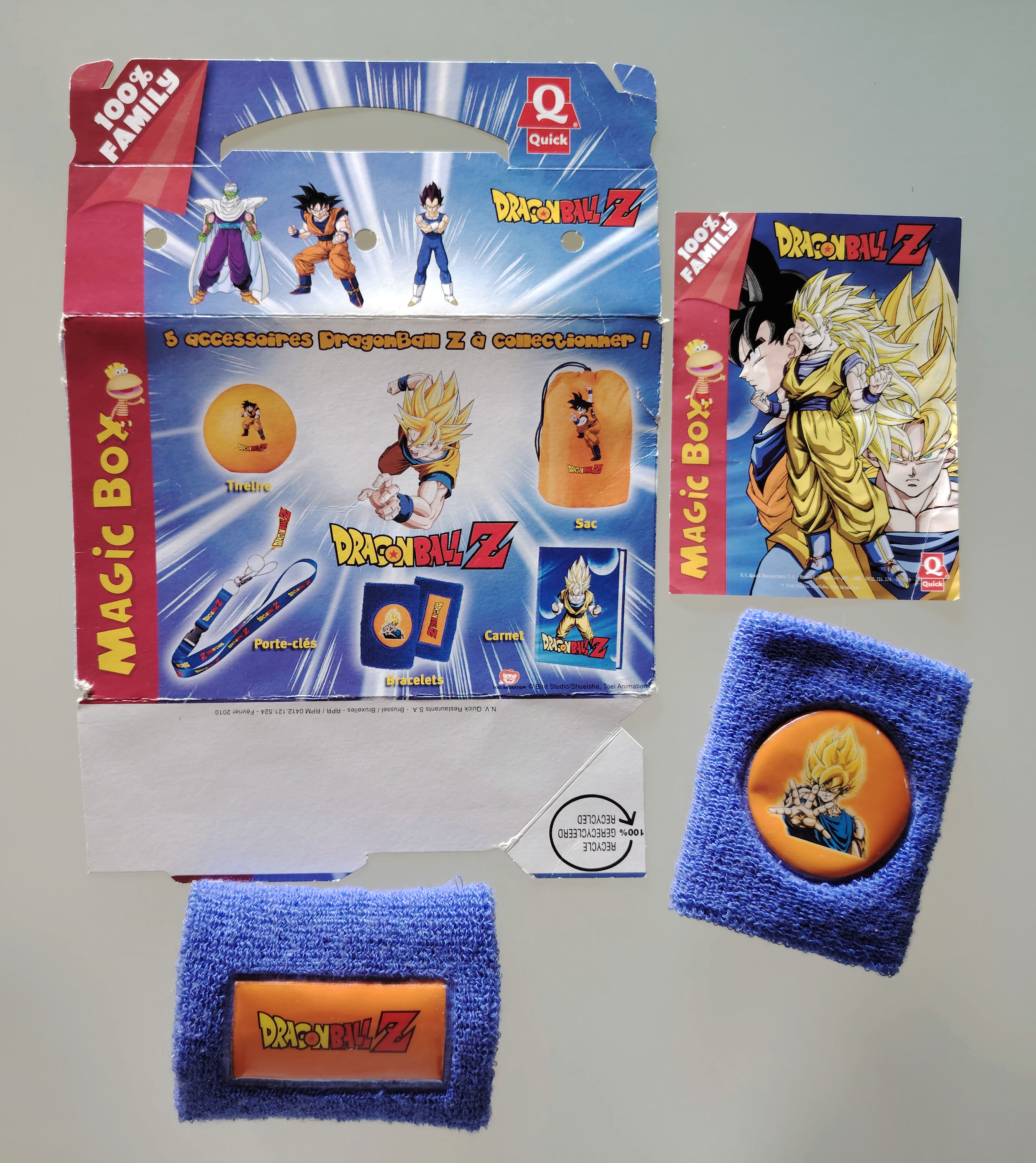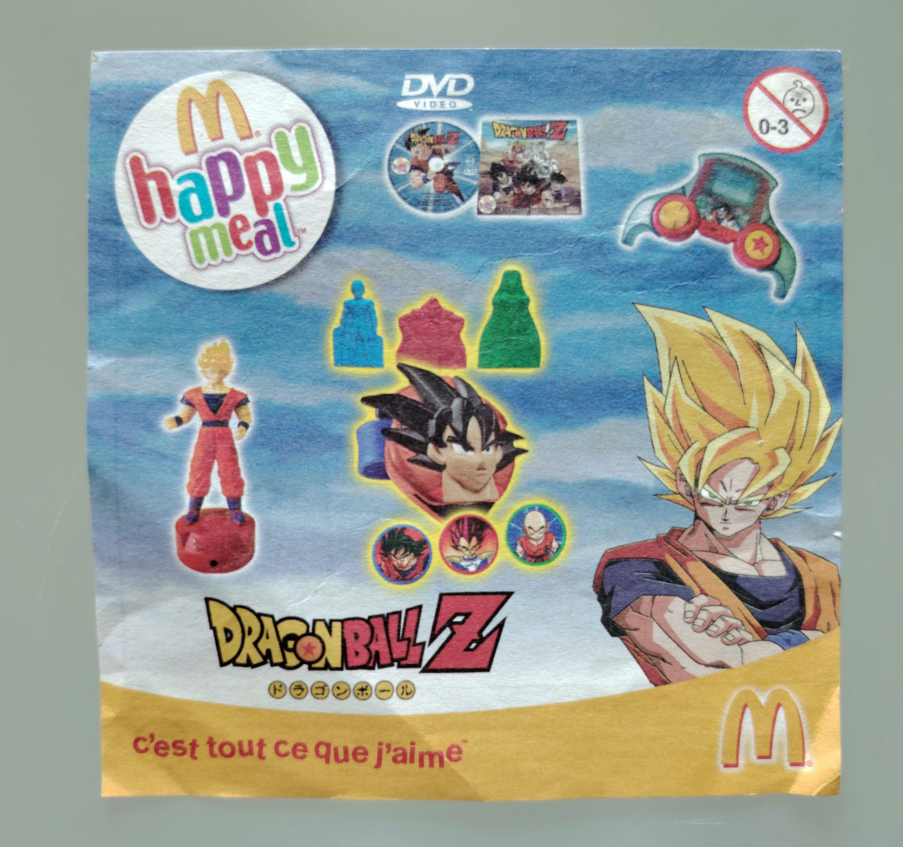 Ensemble de 3 jouets Happy Meal McDonald's incluant un DVD du premier film Dragon Ball Z (fonctionnel), un bracelet lanceur à l'effigie de Goku avec 3 jetons et 3 cibles, un jeu électronique (fonctionnel, piles à éventuellement changer) et un flyer, sorti en 2006. Ensemble Quick avec 2 bracelets, un Goku et un Dragon Ball Z, un flyer et une boîte de menu (seule la face est présente), sorti en 2010.