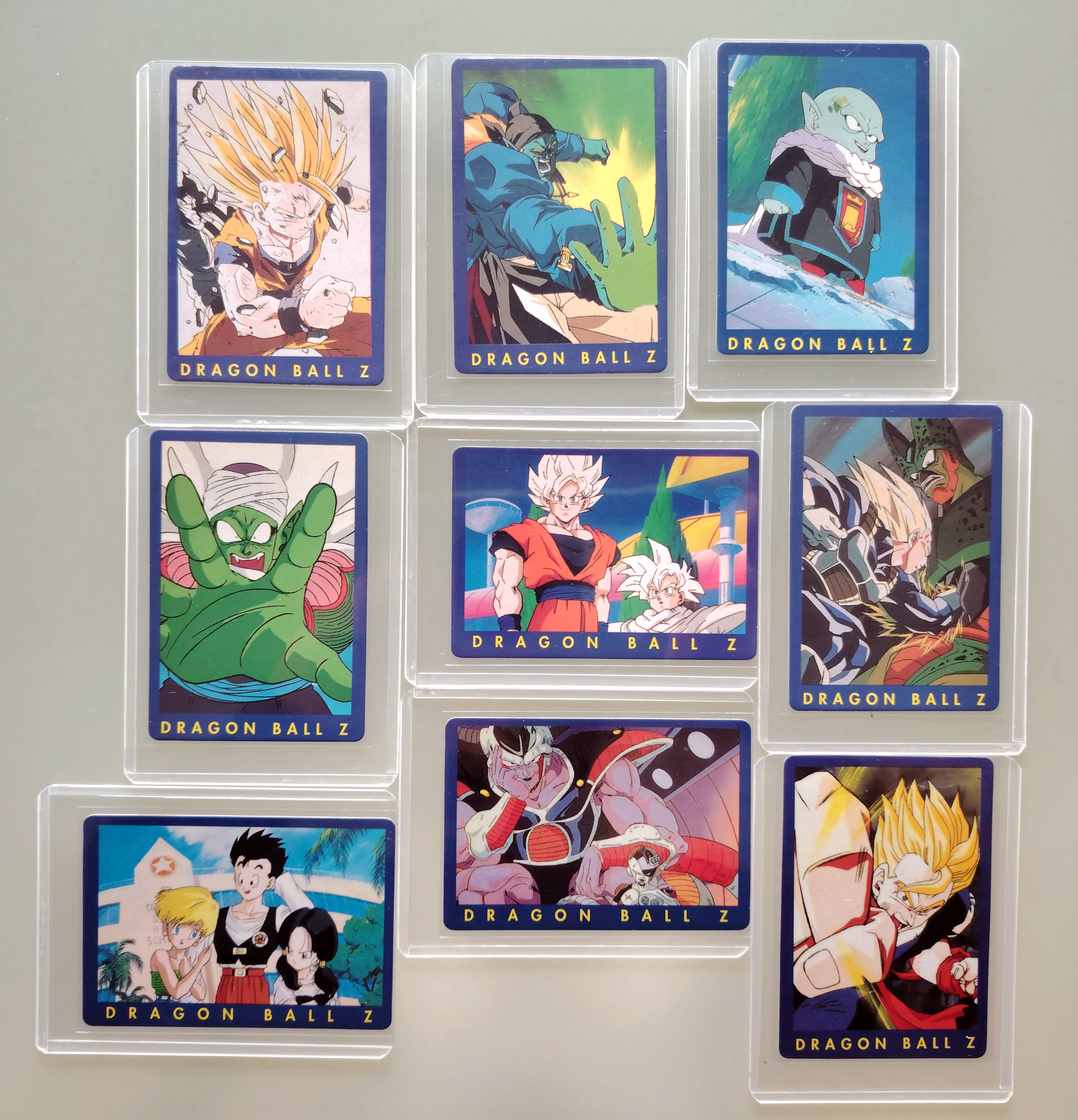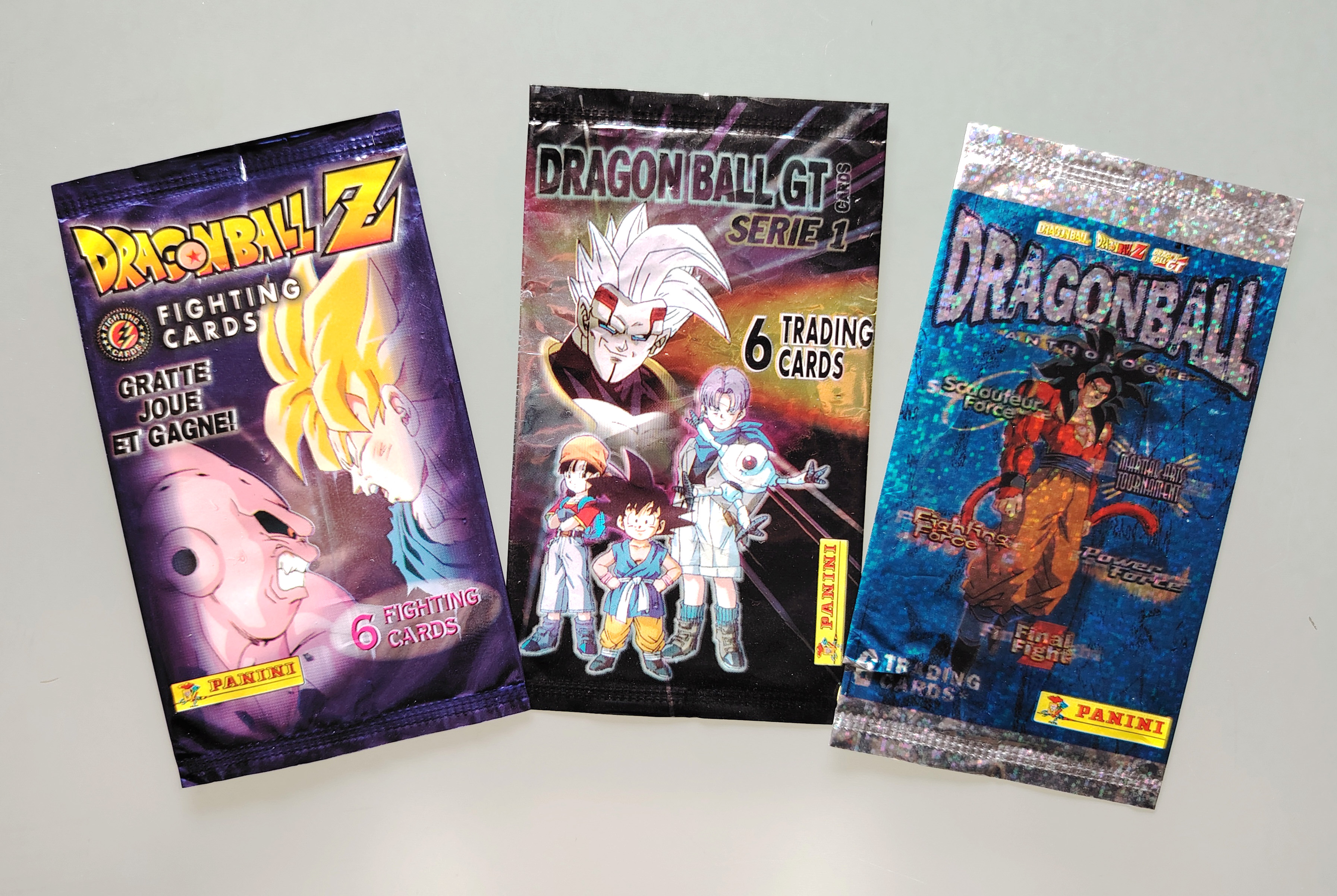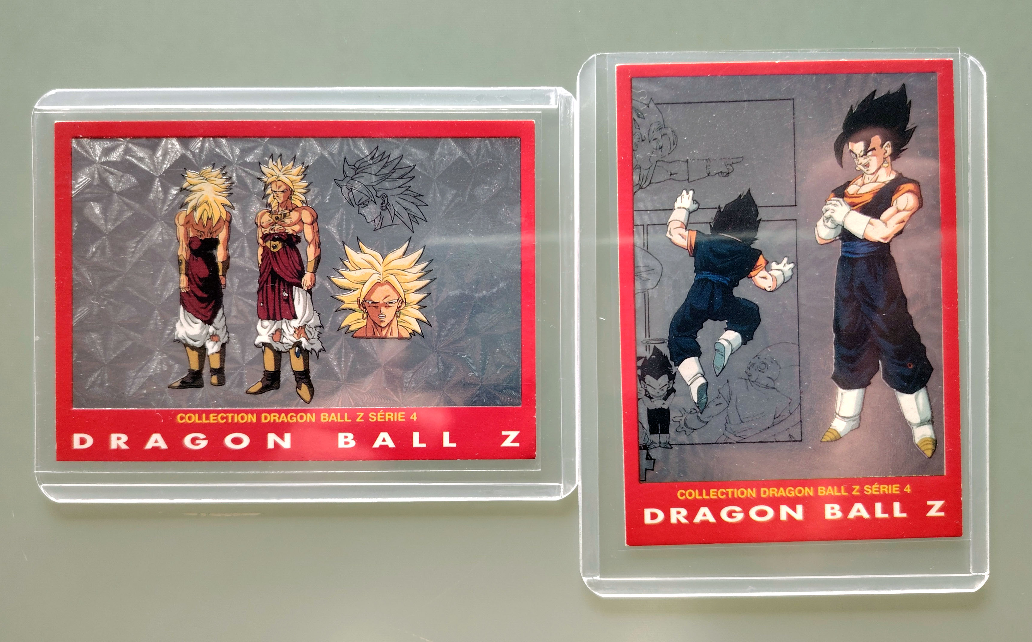 Ensemble de 20 cartes Dragon Ball Z et GT, 10 carts dont 1 prism de la série Trading Cards, 2 prisms de la série 4 Dragon Ball Z, 2 cartes Fighting Cards (non grattées au dos), 6 cartes Trading série 1 Dragon Ball GT et 3 boosters vides : Anthologie, Trading Cards Dragon Ball GT et Fighting Cards. Sorties entre 1995 et 2000 par Panini, protégées sous sleeve et Toploader.Ensemble de 20 cartes Dragon Ball Z et GT, 10 cartes dont une prism de la série Trading Cards, 2 prisms de la série 4 Dragon Ball Z, 2 cartes Fighting Cards (non grattées au dos), 6 cartes Trading série 1 Dragon Ball GT et 3 boosters vides : Anthologie, Trading Cards Dragon Ball GT et Fighting Cards. Sorties entre 1995 et 2000 par Panini, protégées sous sleeve et Toploader.