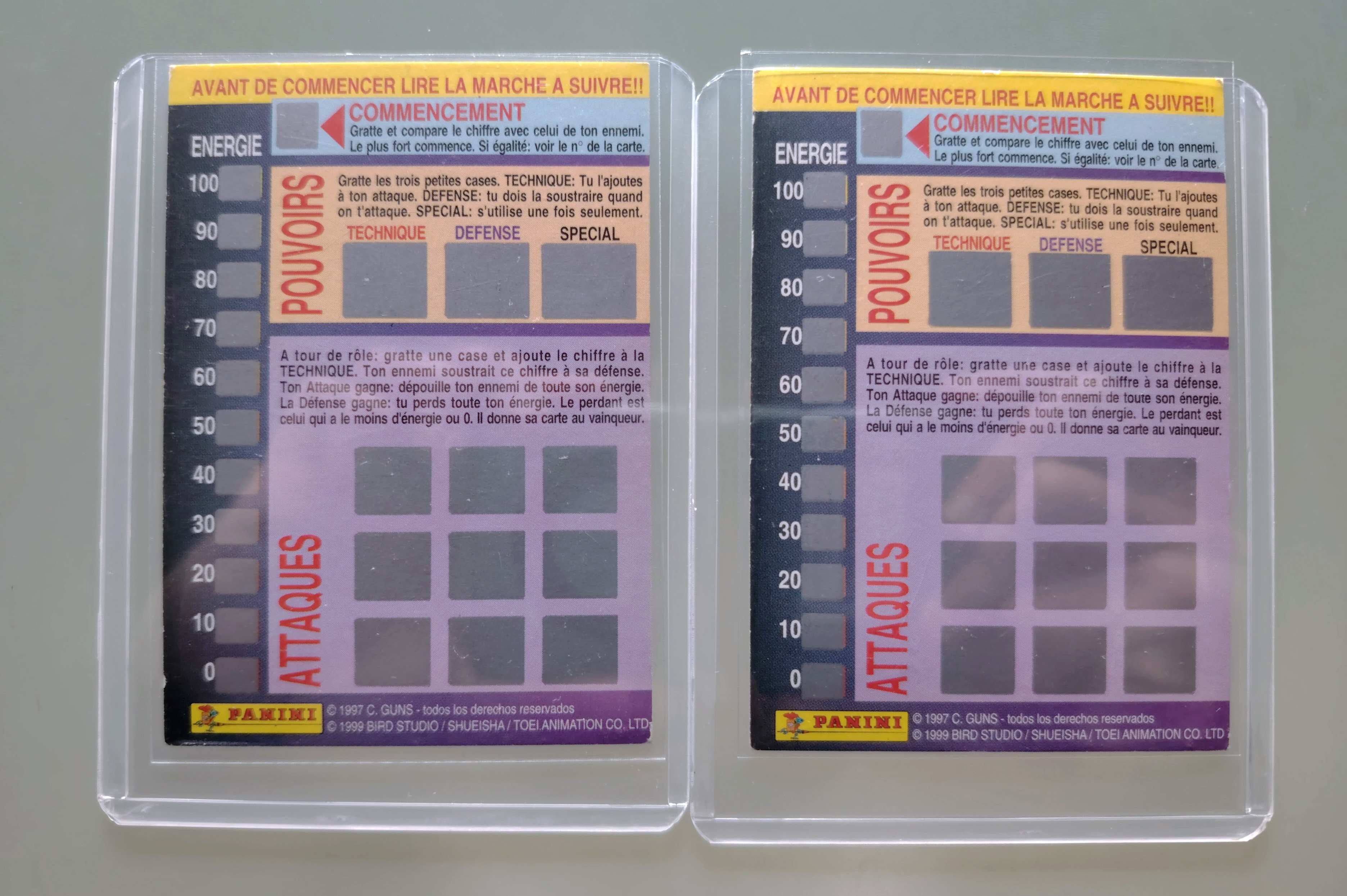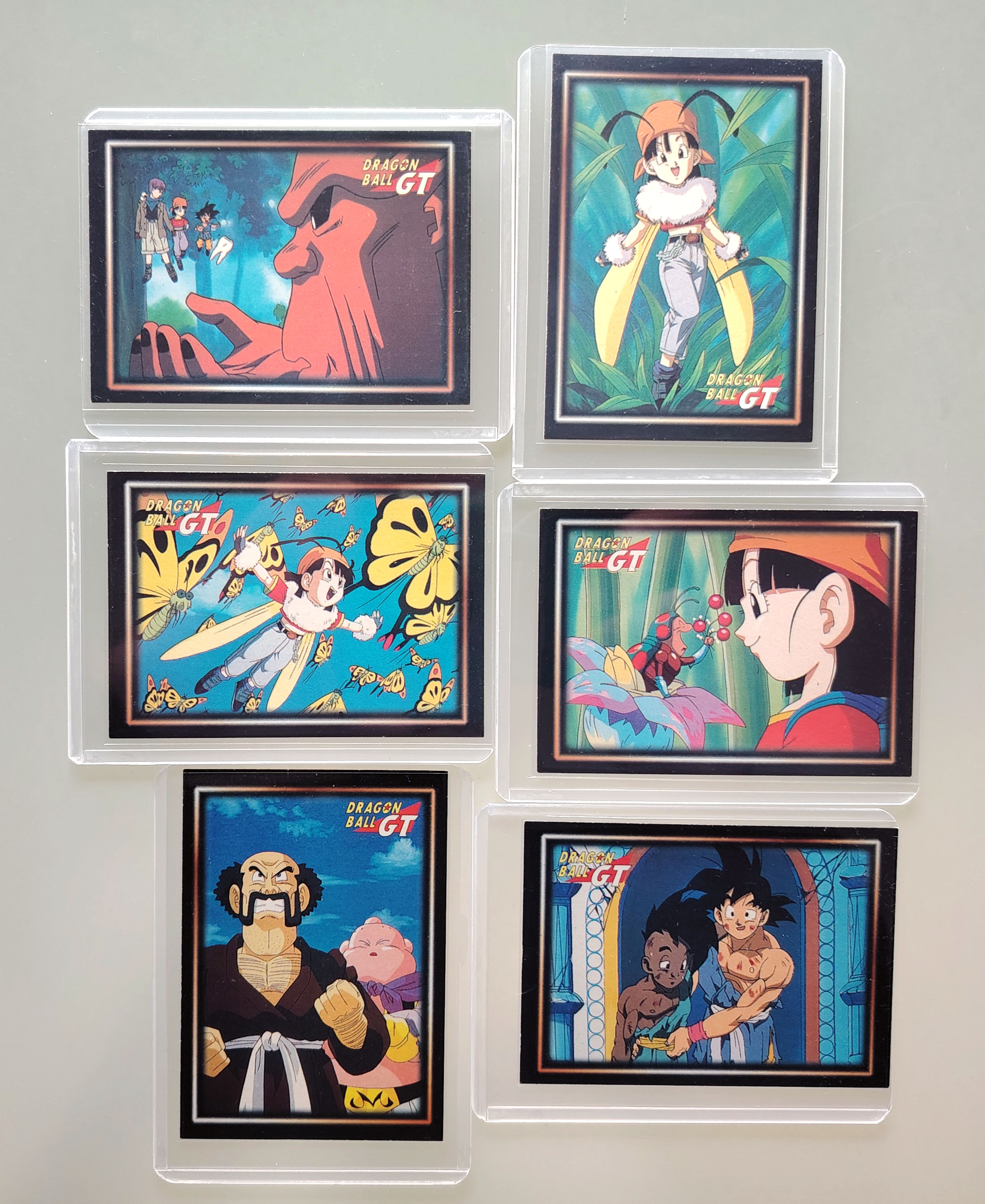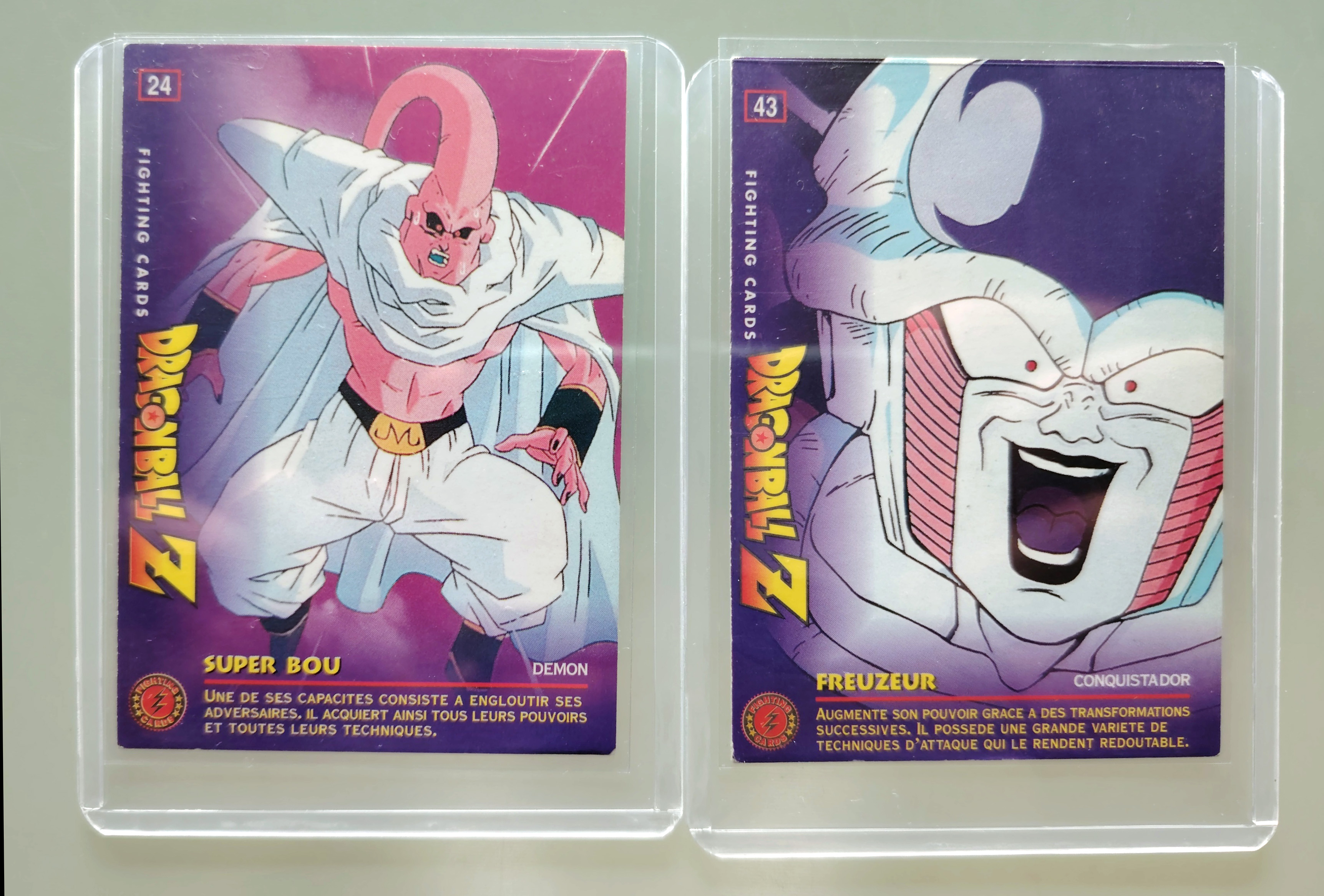 Ensemble de 20 cartes Dragon Ball Z et GT, 10 carts dont 1 prism de la série Trading Cards, 2 prisms de la série 4 Dragon Ball Z, 2 cartes Fighting Cards (non grattées au dos), 6 cartes Trading série 1 Dragon Ball GT et 3 boosters vides : Anthologie, Trading Cards Dragon Ball GT et Fighting Cards. Sorties entre 1995 et 2000 par Panini, protégées sous sleeve et Toploader.Ensemble de 20 cartes Dragon Ball Z et GT, 10 cartes dont une prism de la série Trading Cards, 2 prisms de la série 4 Dragon Ball Z, 2 cartes Fighting Cards (non grattées au dos), 6 cartes Trading série 1 Dragon Ball GT et 3 boosters vides : Anthologie, Trading Cards Dragon Ball GT et Fighting Cards. Sorties entre 1995 et 2000 par Panini, protégées sous sleeve et Toploader.