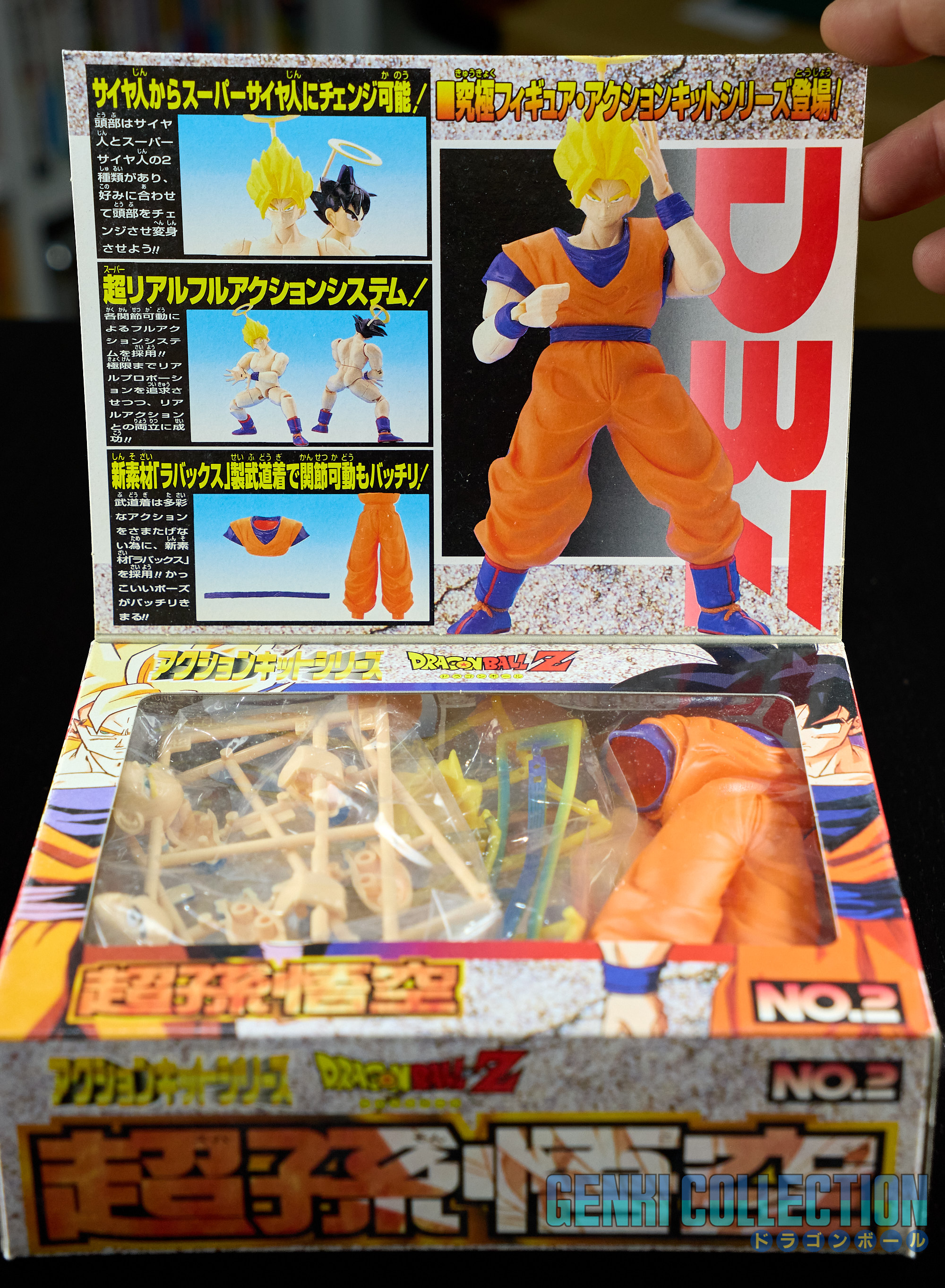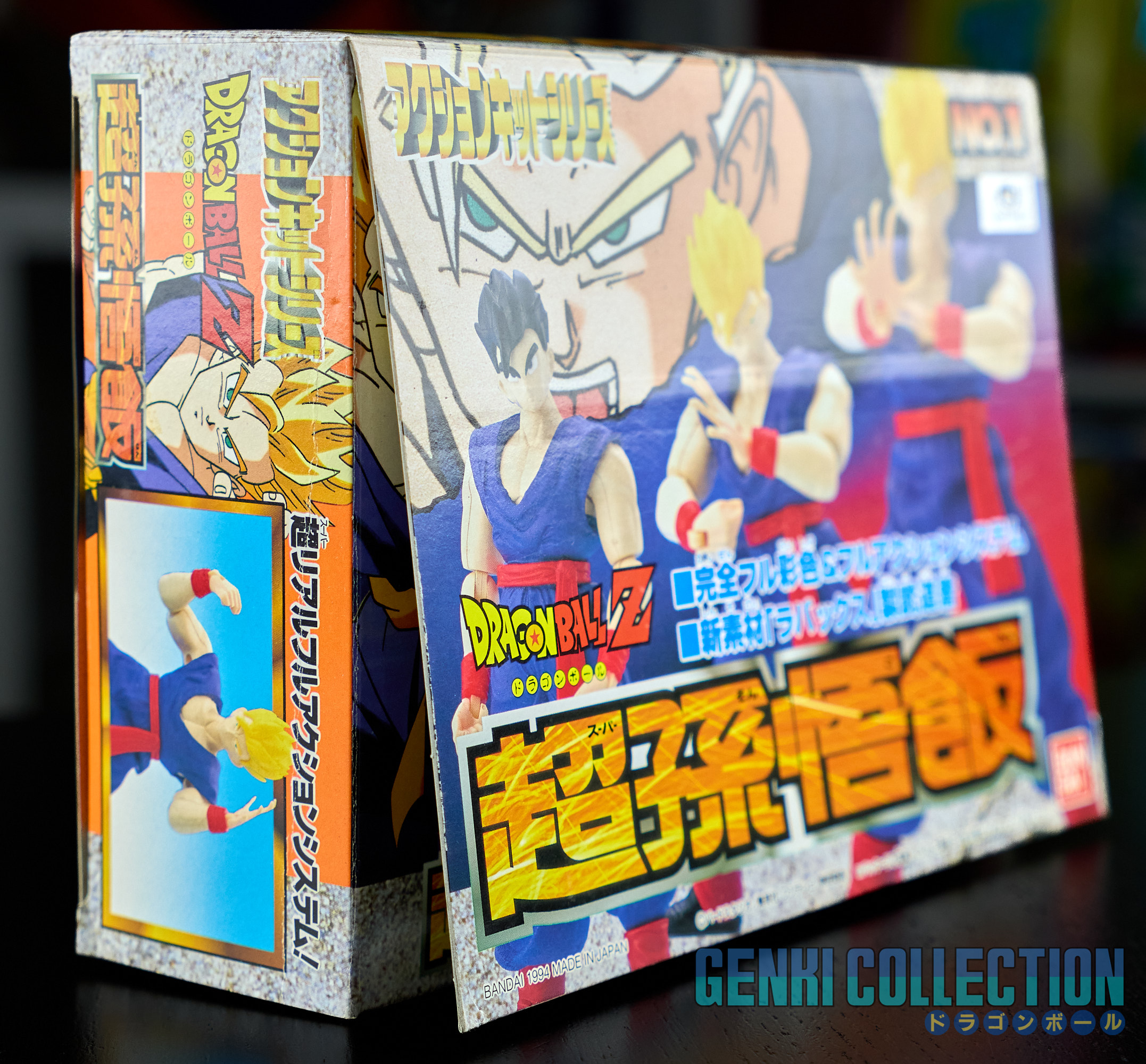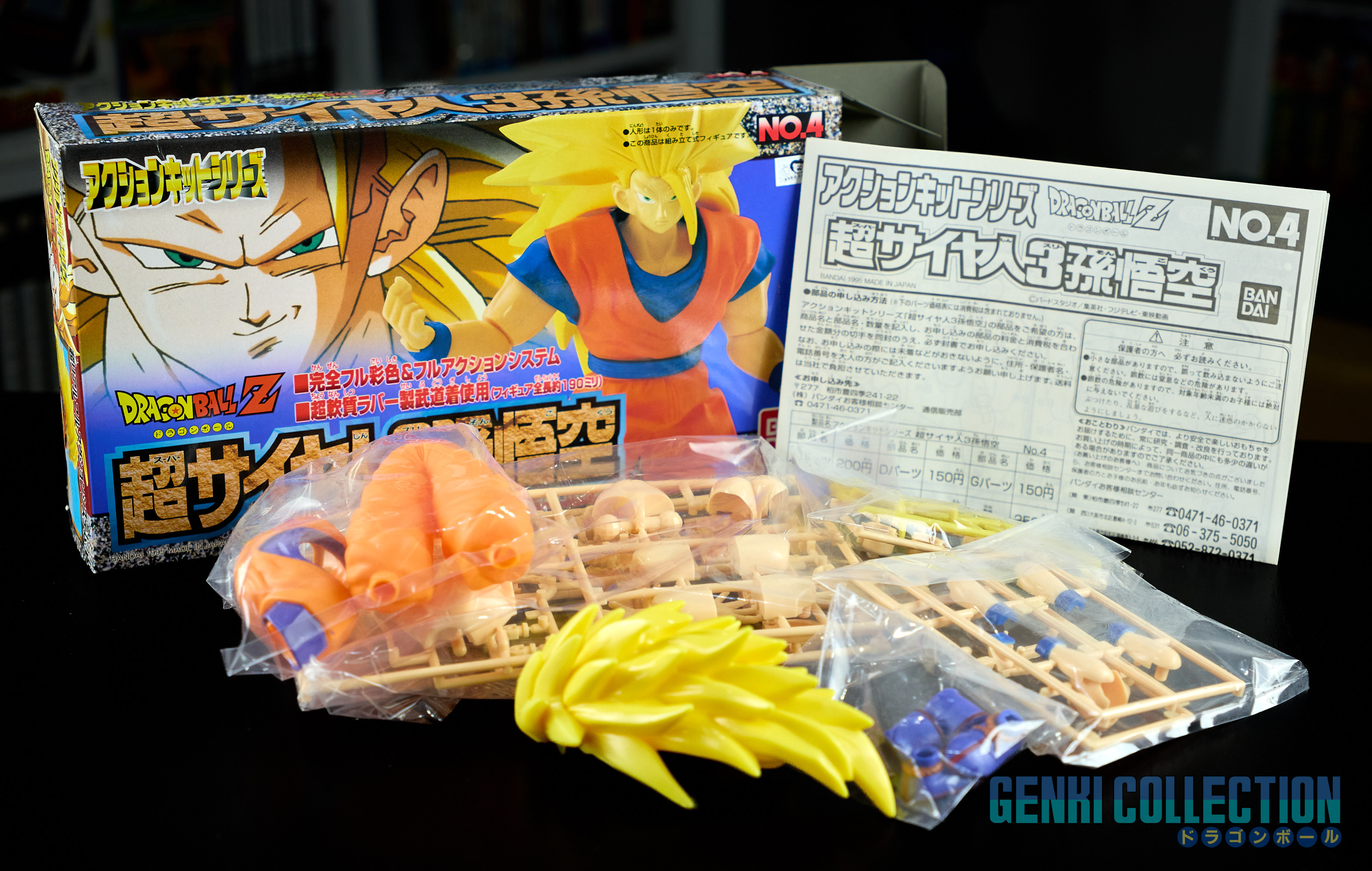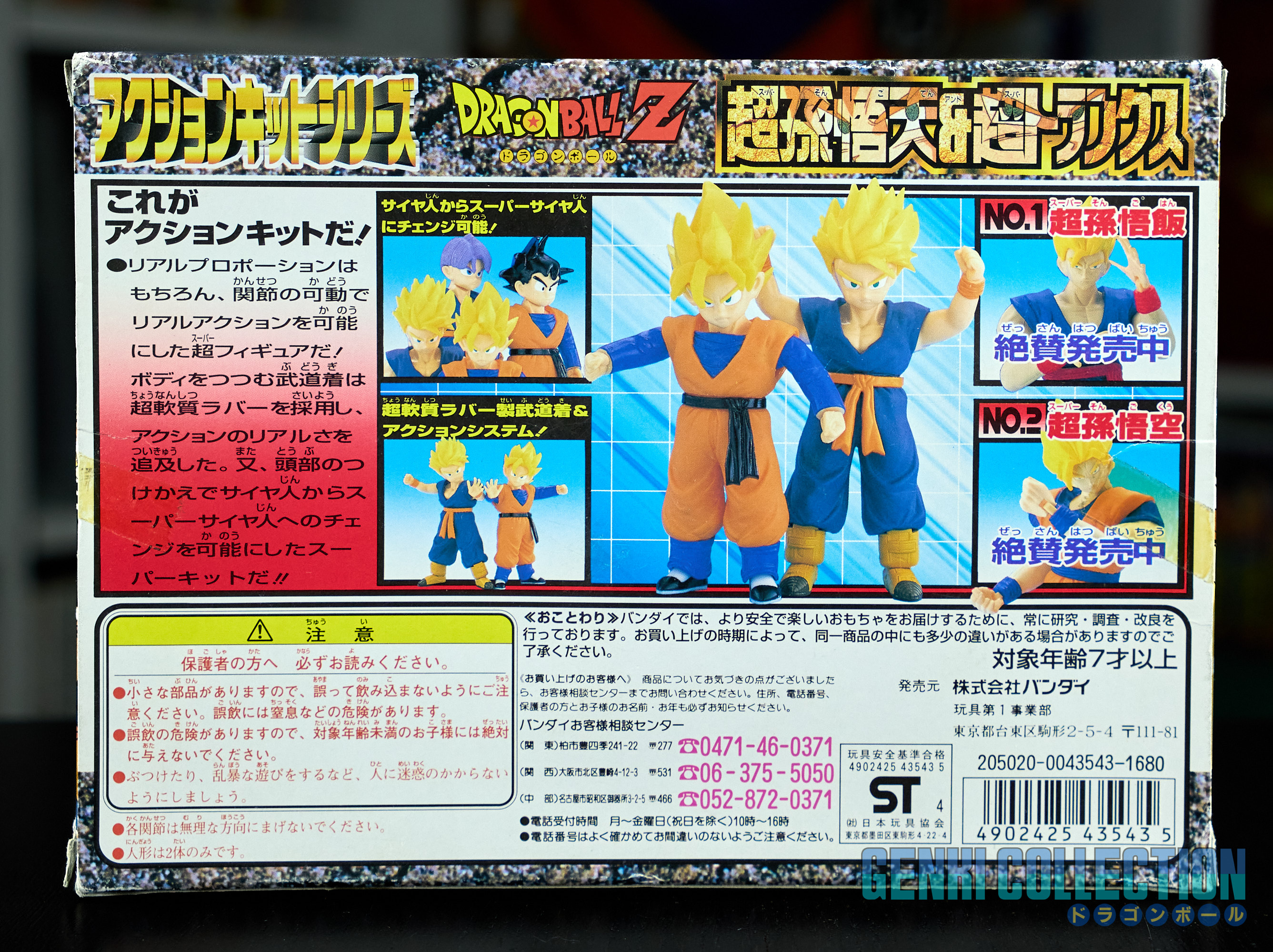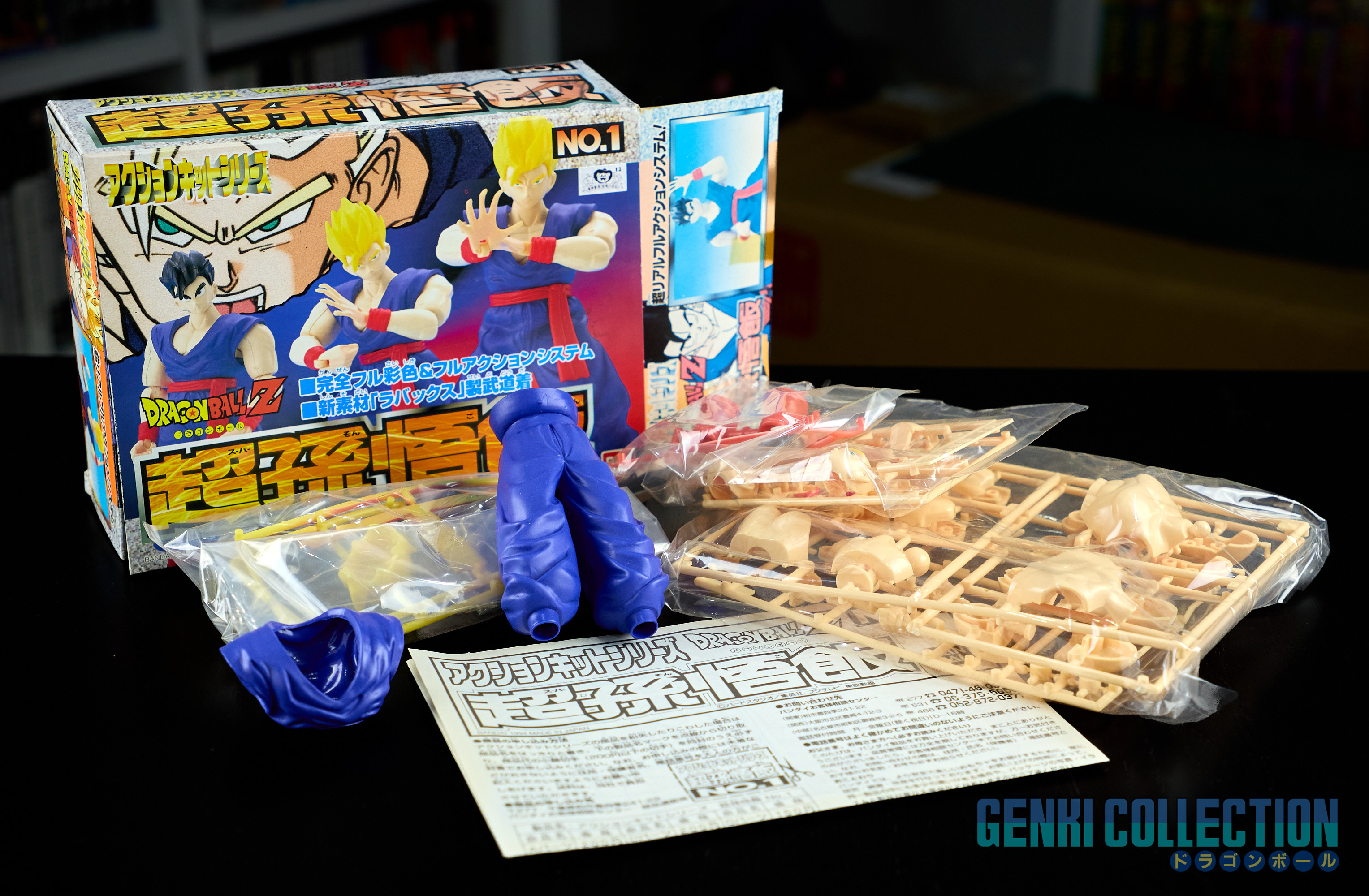 Set complet de 6 figurines Dragon Ball Z Action Kits de 1994 à 1995. 1ère édition Made in Japan, de meilleure facture que les rééditions Made in China (facilement identifiables avec les noms en anglais sur la face des boîtes, contrairement aux version japonaises uniquement en japonais). Ce sont de très belles figurines en maquettes à assembler facilement, sans doutes les plus fidèles de l'époque avec en plus des têtes interchangeables en forme normale et Super Saiyan. Les vêtements sont en caoutchouc de très bonne facture qui n'ont pas perdu de leur qualité avec le temps. Les kits numéros 1 et 2 ont l'avantage d'avoir un "volet" de présentation qui ne sera pas gardé pour les volumes suivants. Tous les kits sont en très bon état, les grappes non assemblées sons sous blisters toujours scellés et toutes les notices sont présentes. Des conditions rares pour ces kits généralement déjà assemblés !
