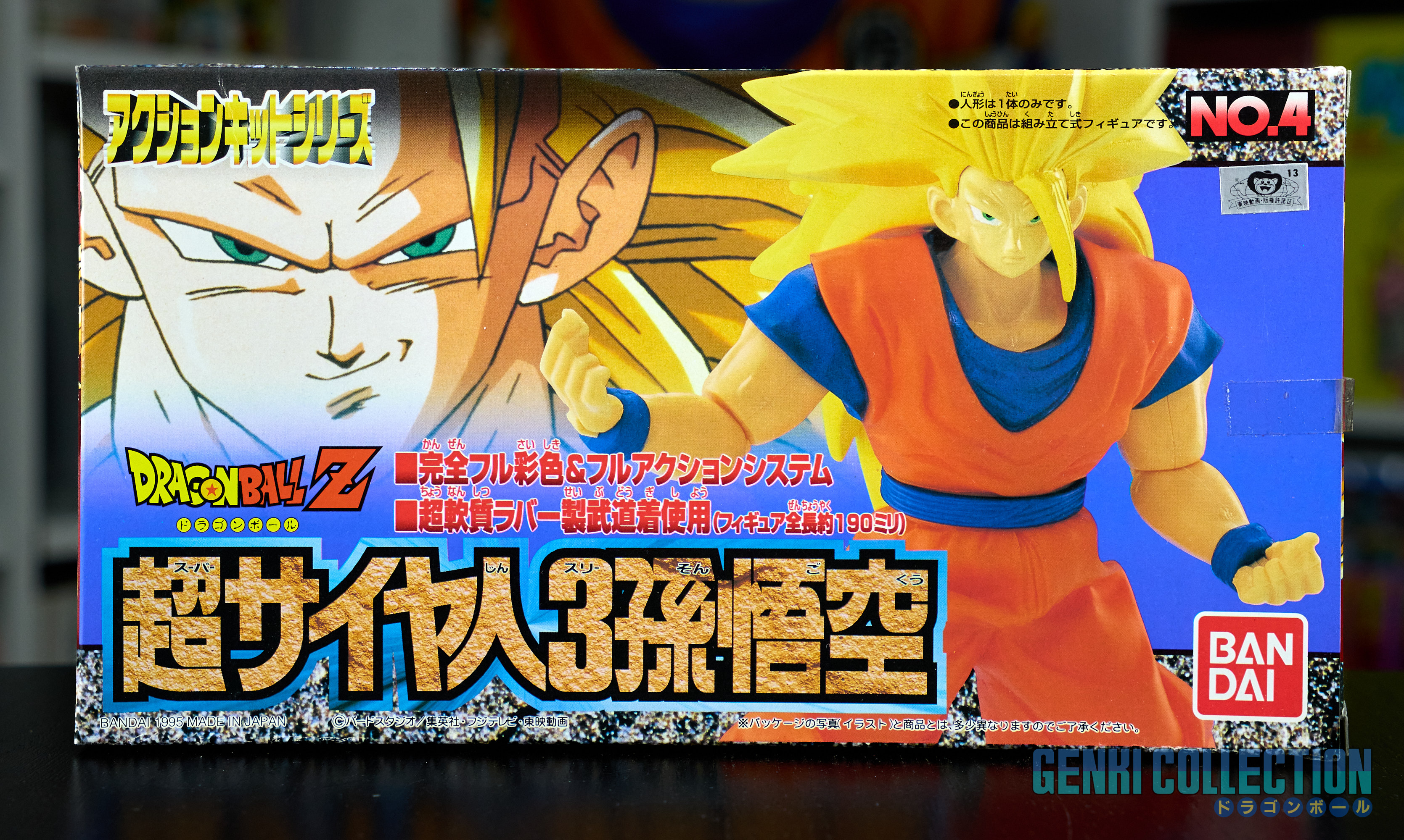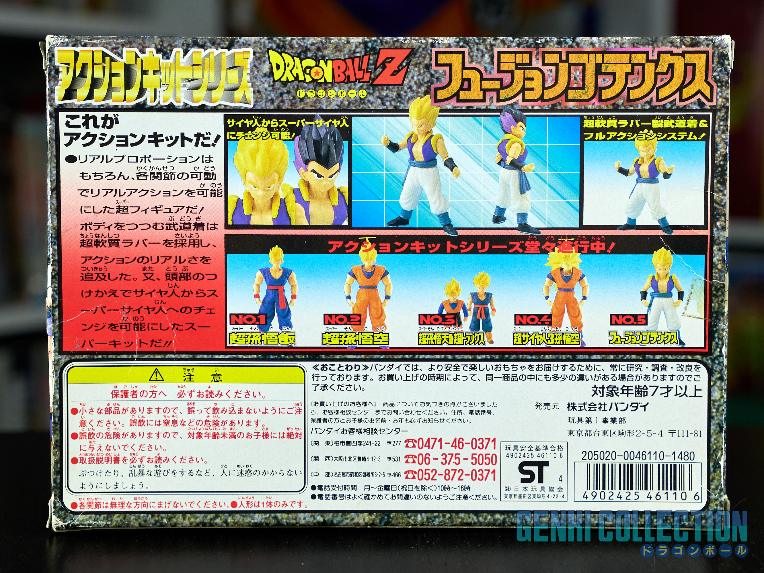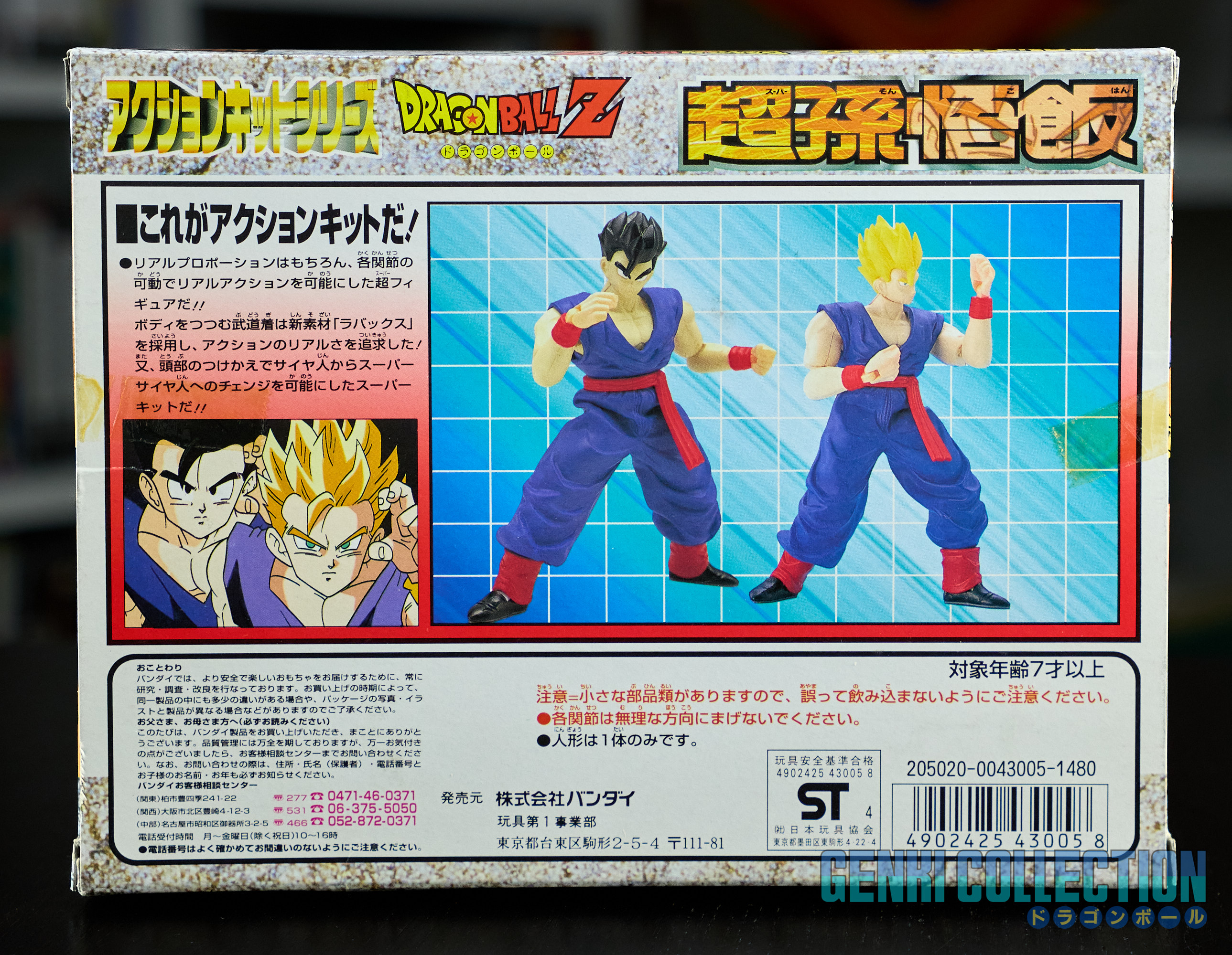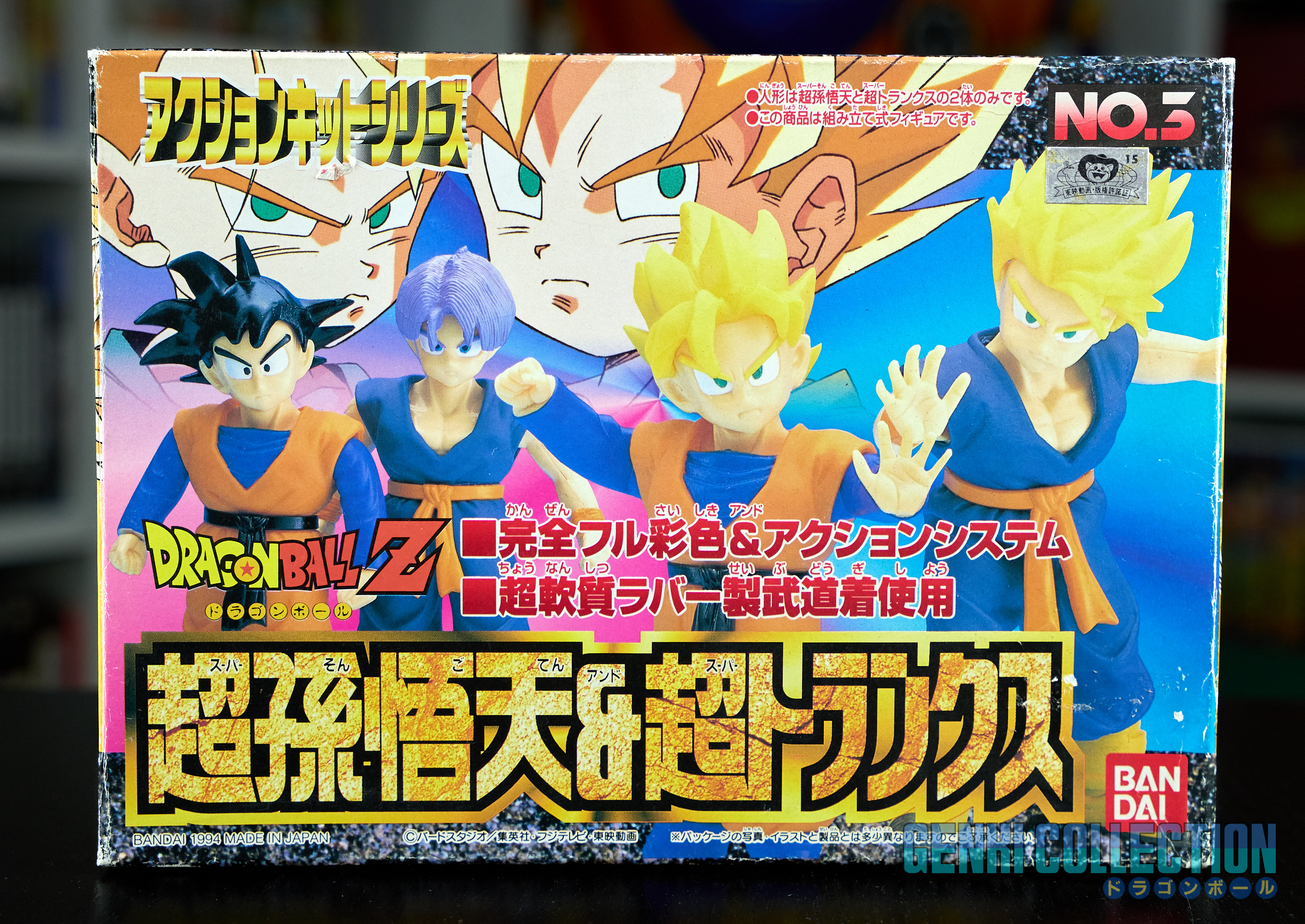 Set complet de 6 figurines Dragon Ball Z Action Kits de 1994 à 1995. 1ère édition Made in Japan, de meilleure facture que les rééditions Made in China (facilement identifiables avec les noms en anglais sur la face des boîtes, contrairement aux version japonaises uniquement en japonais). Ce sont de très belles figurines en maquettes à assembler facilement, sans doutes les plus fidèles de l'époque avec en plus des têtes interchangeables en forme normale et Super Saiyan. Les vêtements sont en caoutchouc de très bonne facture qui n'ont pas perdu de leur qualité avec le temps. Les kits numéros 1 et 2 ont l'avantage d'avoir un "volet" de présentation qui ne sera pas gardé pour les volumes suivants. Tous les kits sont en très bon état, les grappes non assemblées sons sous blisters toujours scellés et toutes les notices sont présentes. Des conditions rares pour ces kits généralement déjà assemblés !