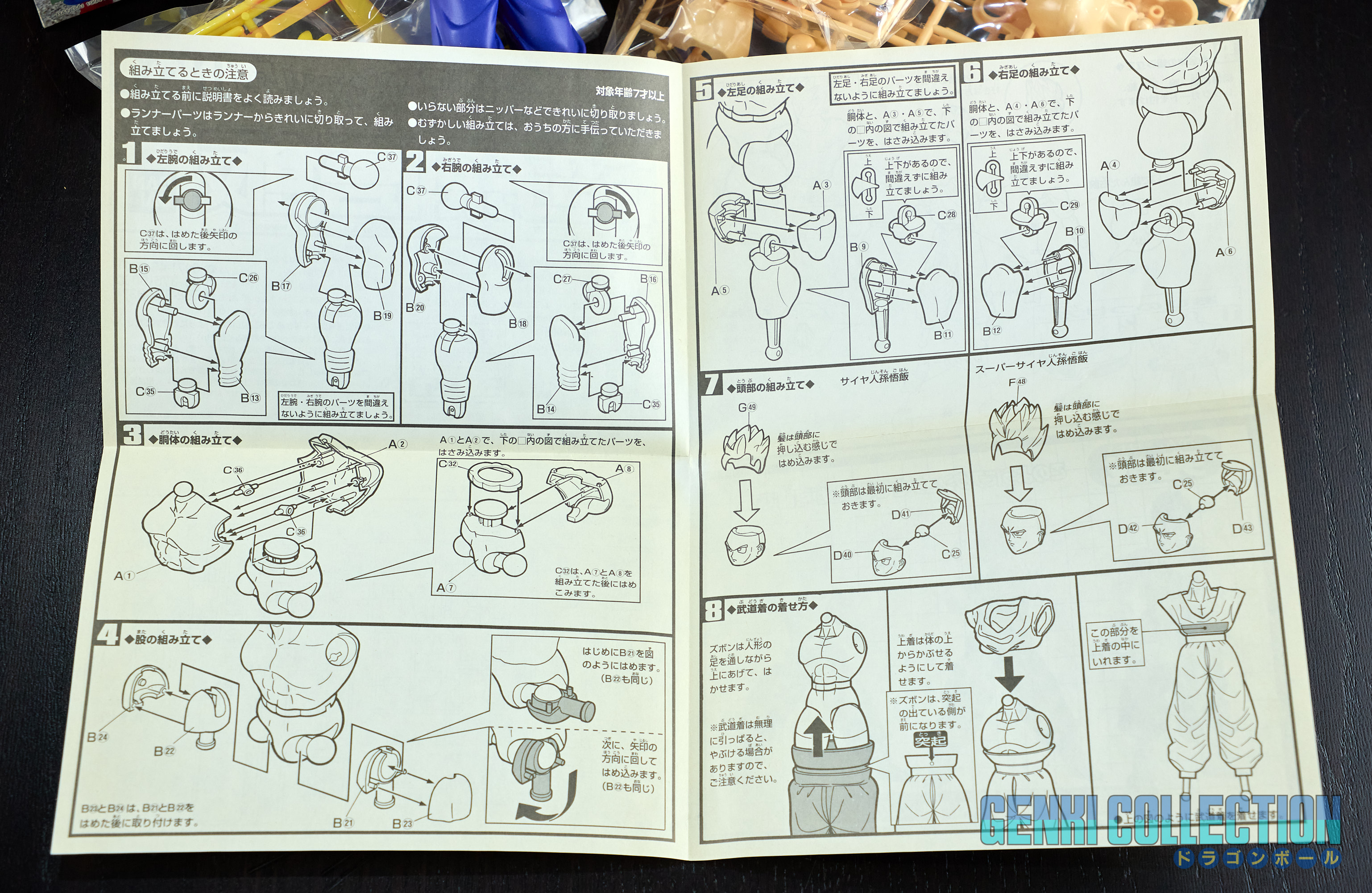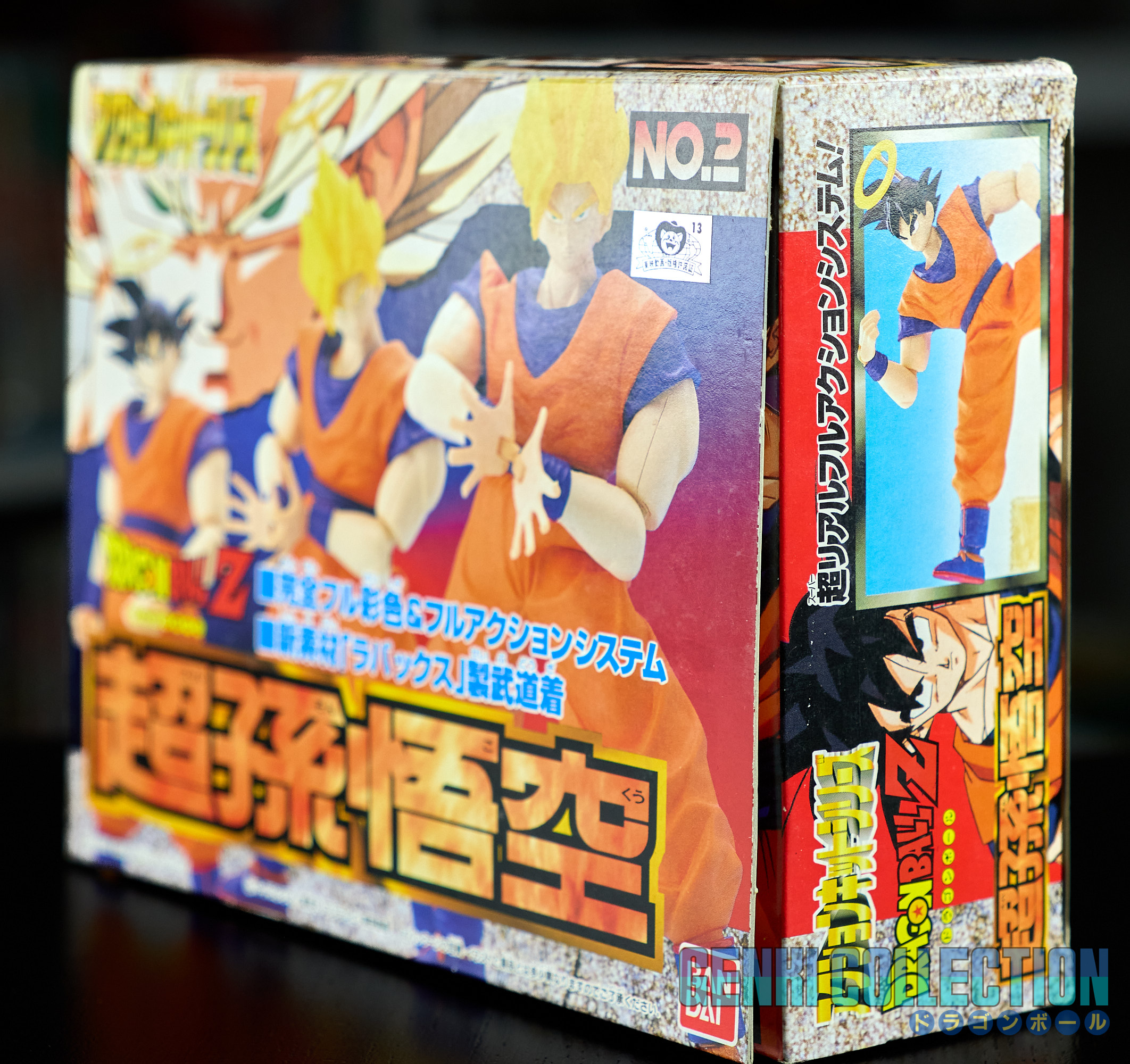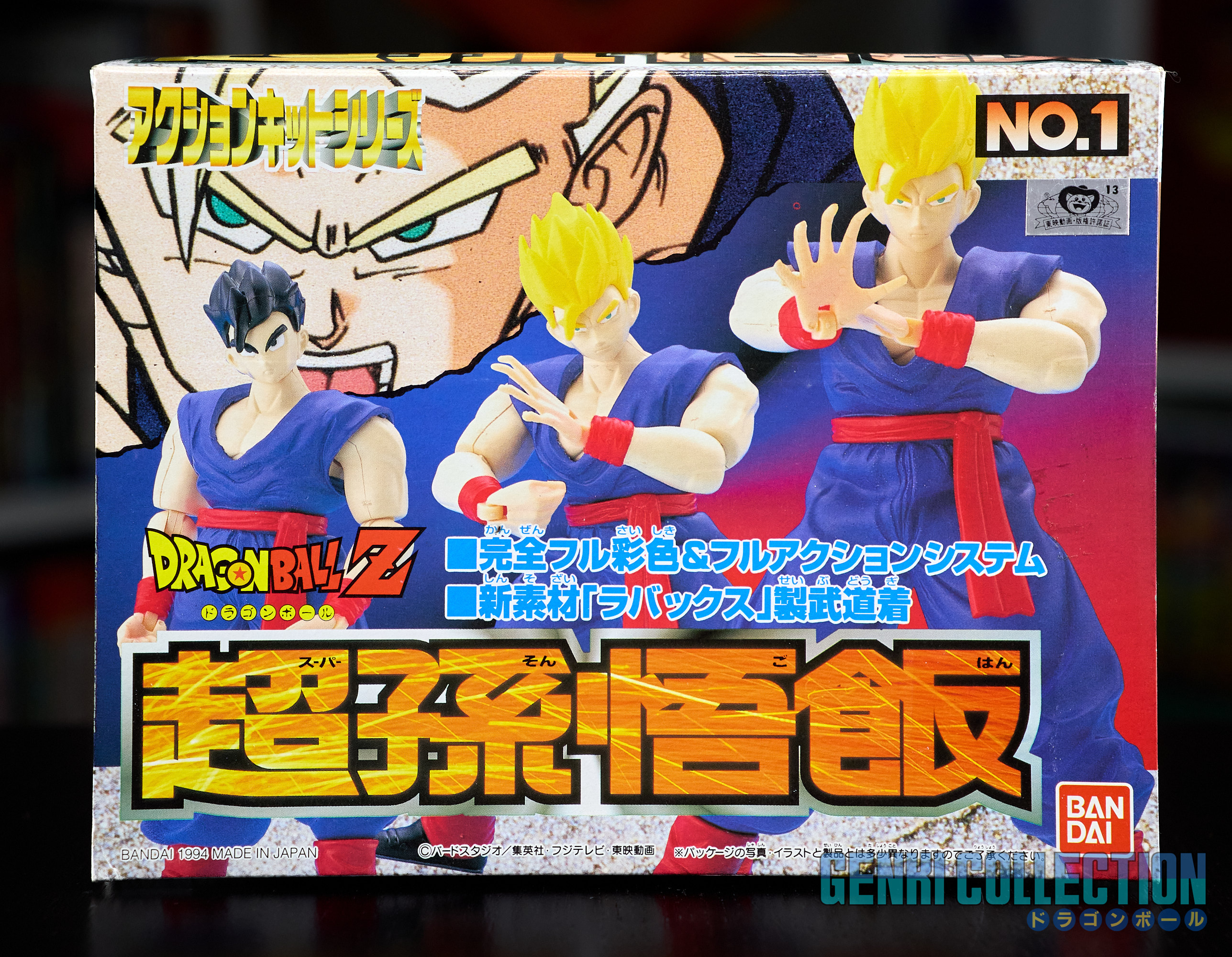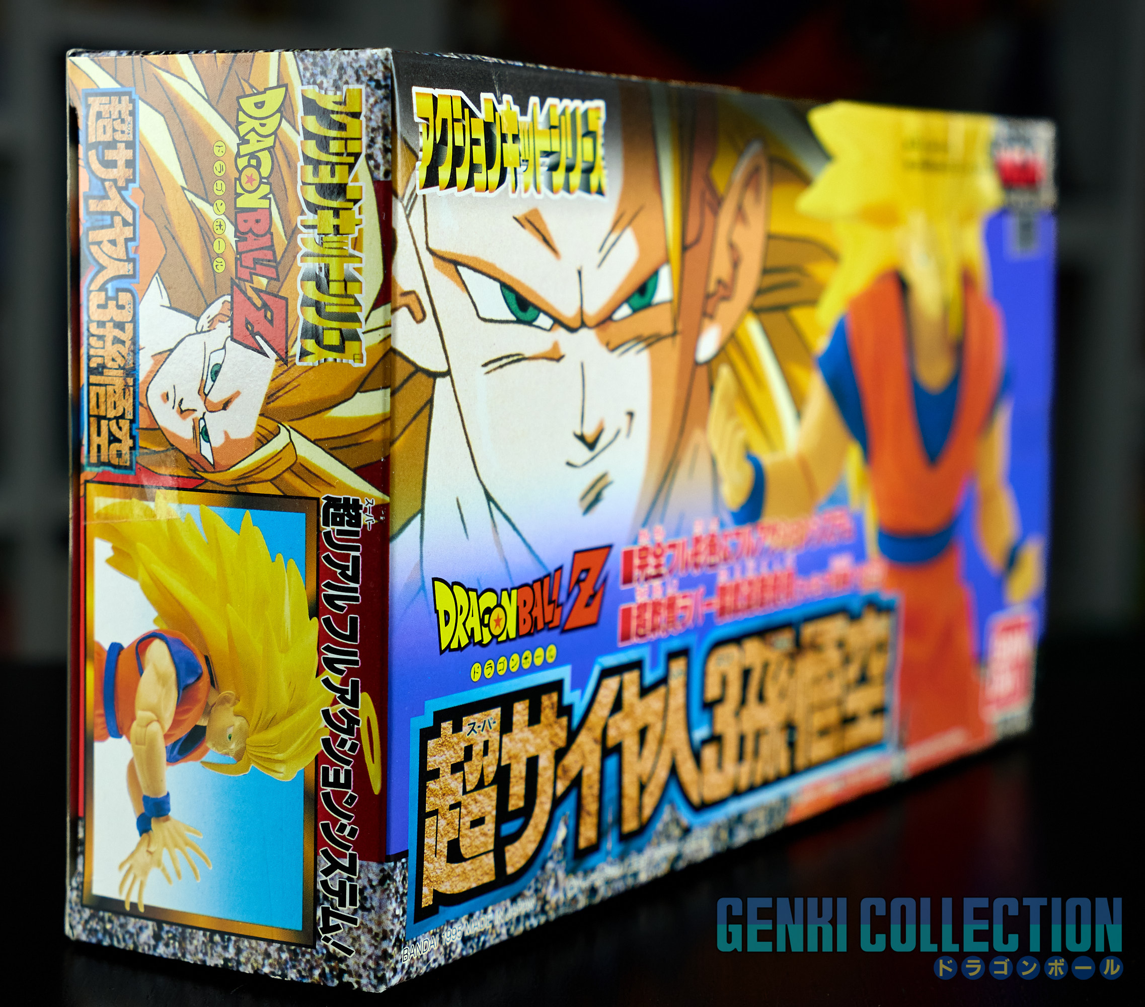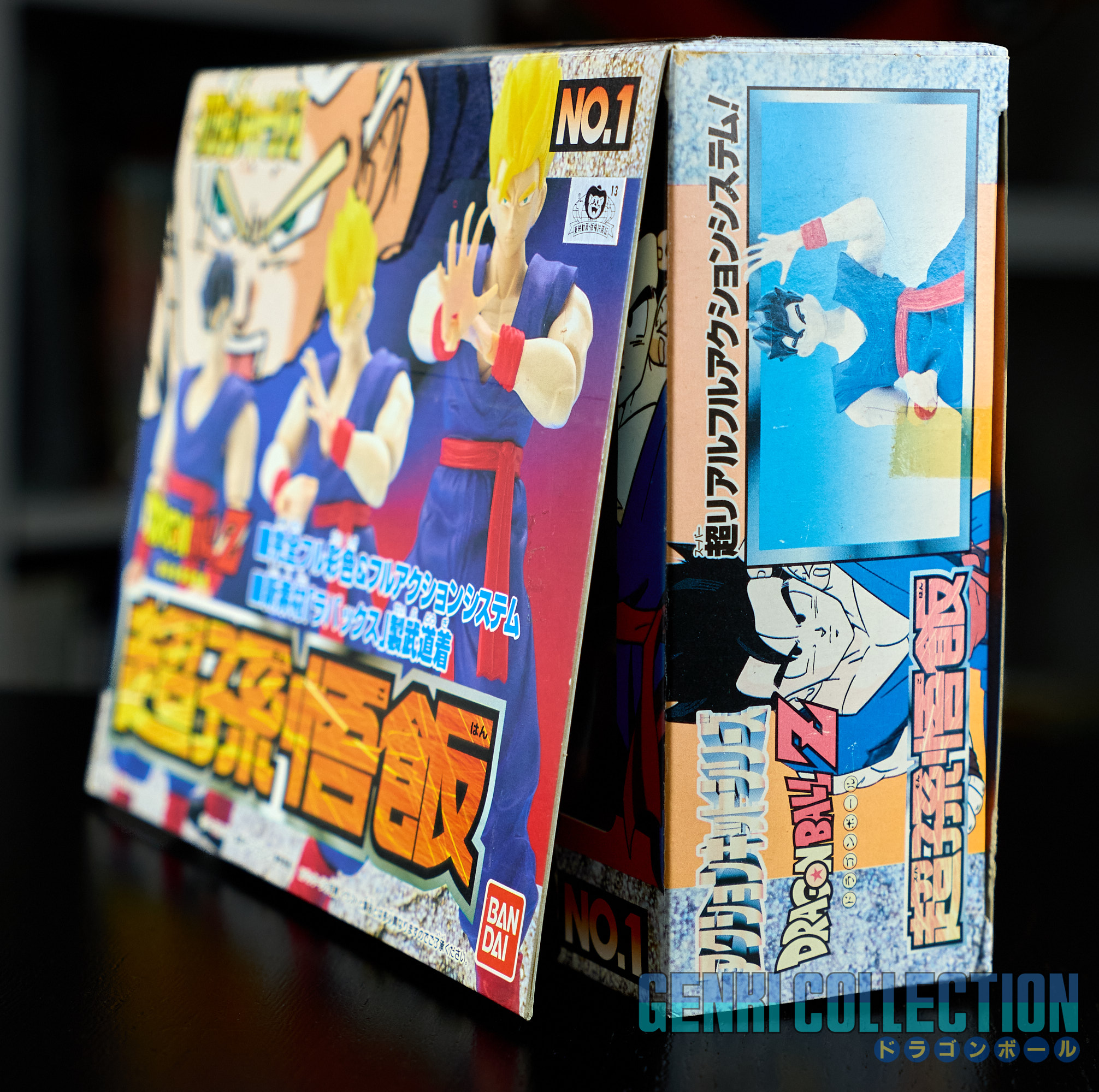 Set complet de 6 figurines Dragon Ball Z Action Kits de 1994 à 1995. 1ère édition Made in Japan, de meilleure facture que les rééditions Made in China (facilement identifiables avec les noms en anglais sur la face des boîtes, contrairement aux version japonaises uniquement en japonais). Ce sont de très belles figurines en maquettes à assembler facilement, sans doutes les plus fidèles de l'époque avec en plus des têtes interchangeables en forme normale et Super Saiyan. Les vêtements sont en caoutchouc de très bonne facture qui n'ont pas perdu de leur qualité avec le temps. Les kits numéros 1 et 2 ont l'avantage d'avoir un "volet" de présentation qui ne sera pas gardé pour les volumes suivants. Tous les kits sont en très bon état, les grappes non assemblées sons sous blisters toujours scellés et toutes les notices sont présentes. Des conditions rares pour ces kits généralement déjà assemblés !