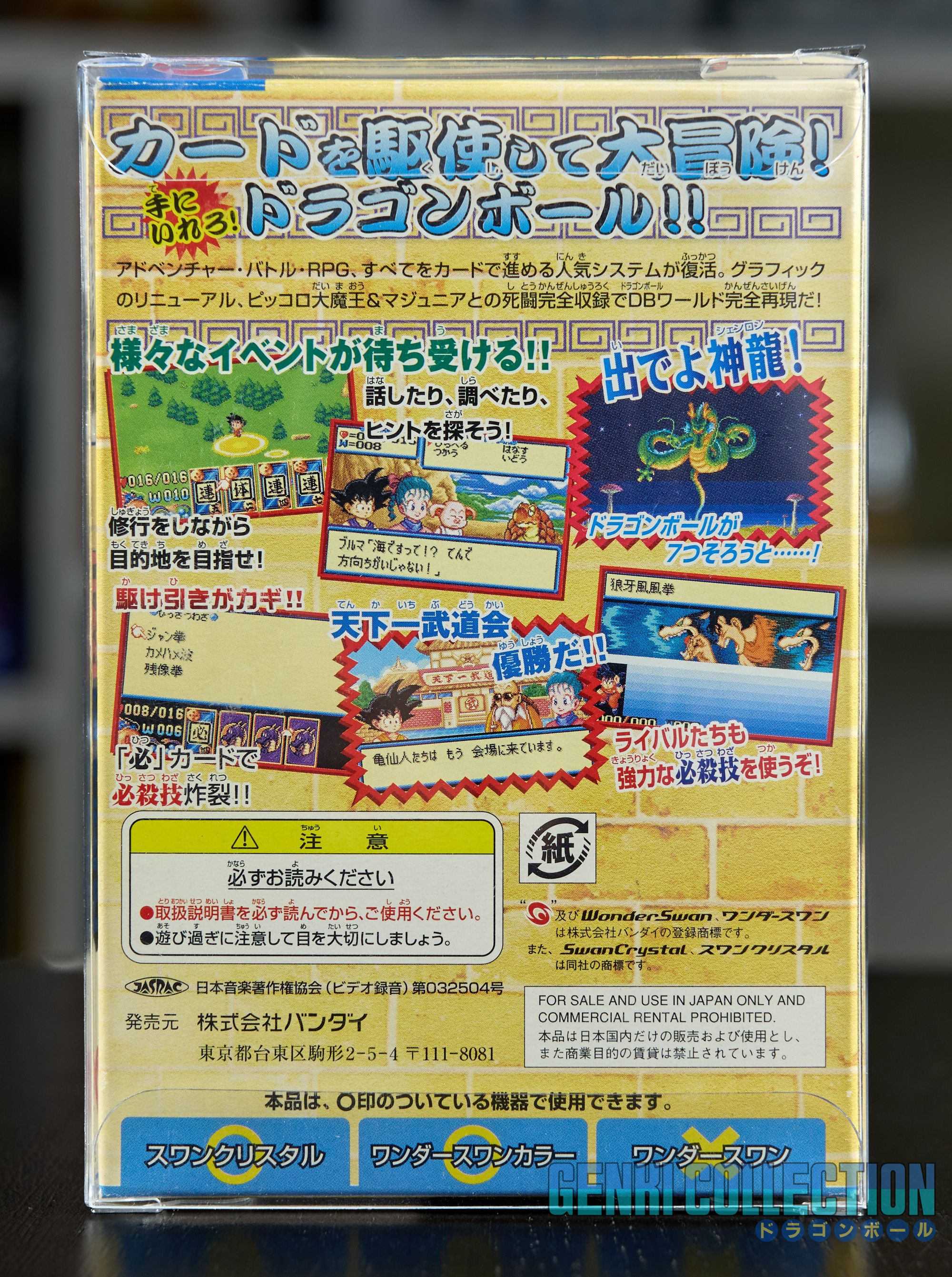 Jeu vidéo version japonaise DRAGON BALL sur WONDERSWAN COLOR et CRYSTAL présenté dans sa Crystal Box. Jeu particulièrement rare et en excellent état, complet avec sa boîte, notice et cartouche.