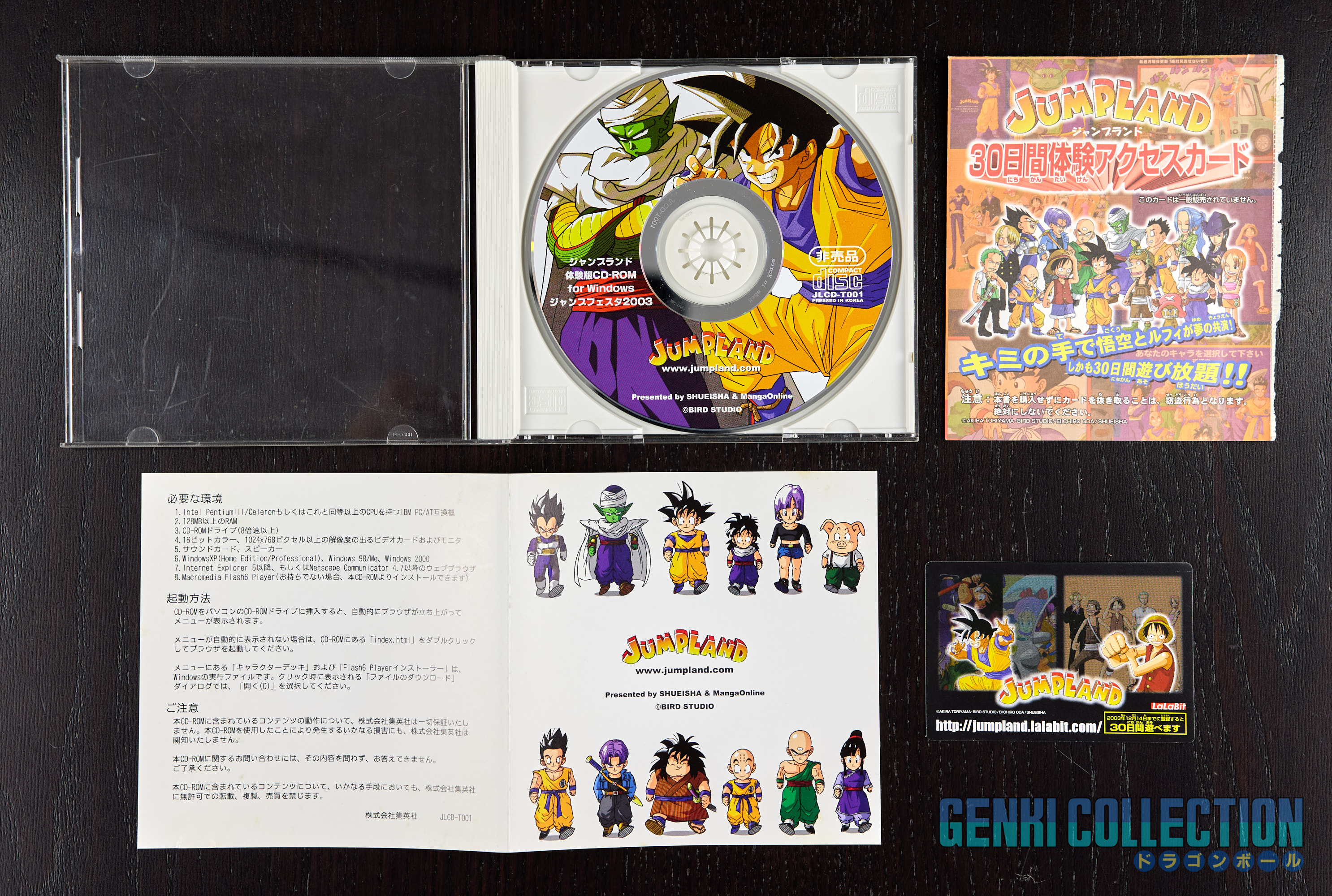 Jeu flash japonais JUMPLAND sur PC dont les illustrations ont été spécialement réalisées en 2003 par AKIRA TORIYAMA. Complet avec en supplément sa carte d'accès numérotée dans sa pochette.